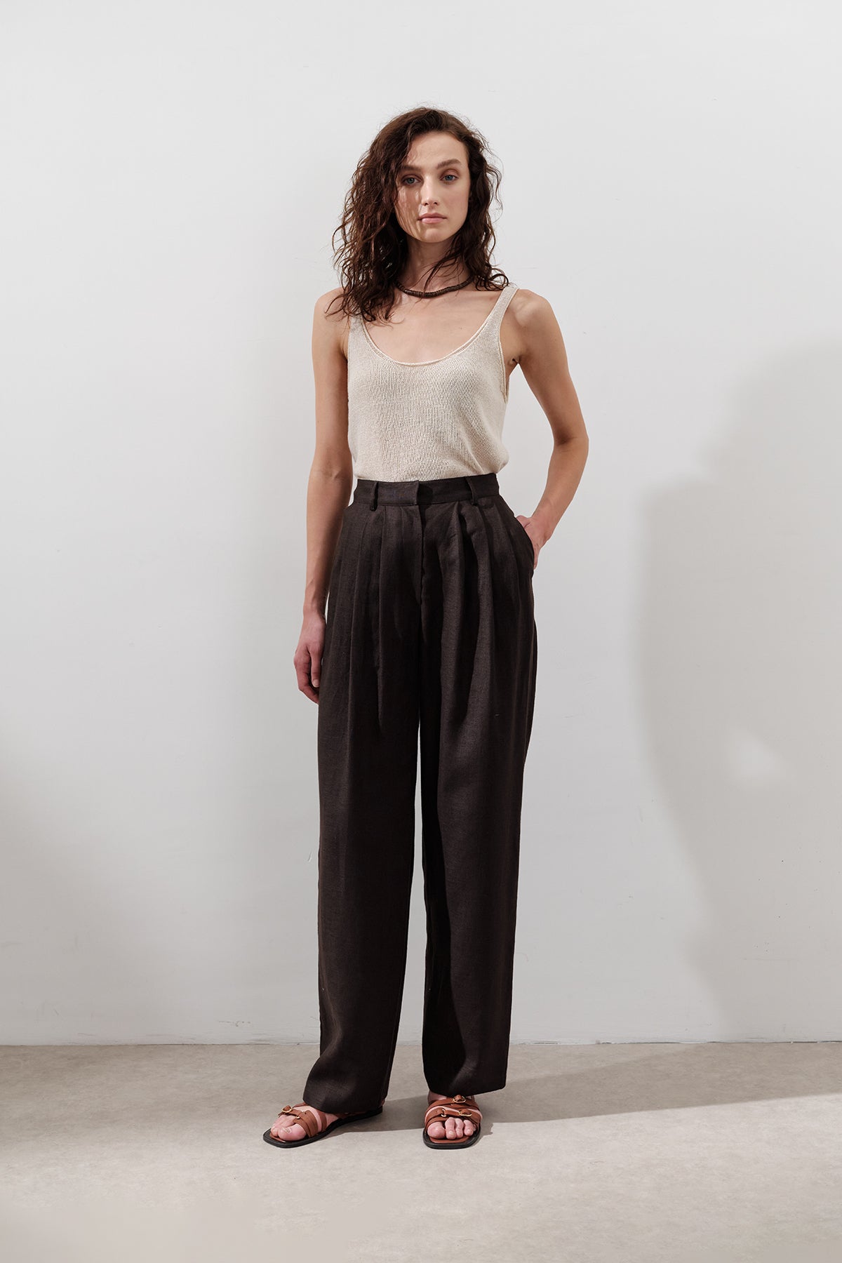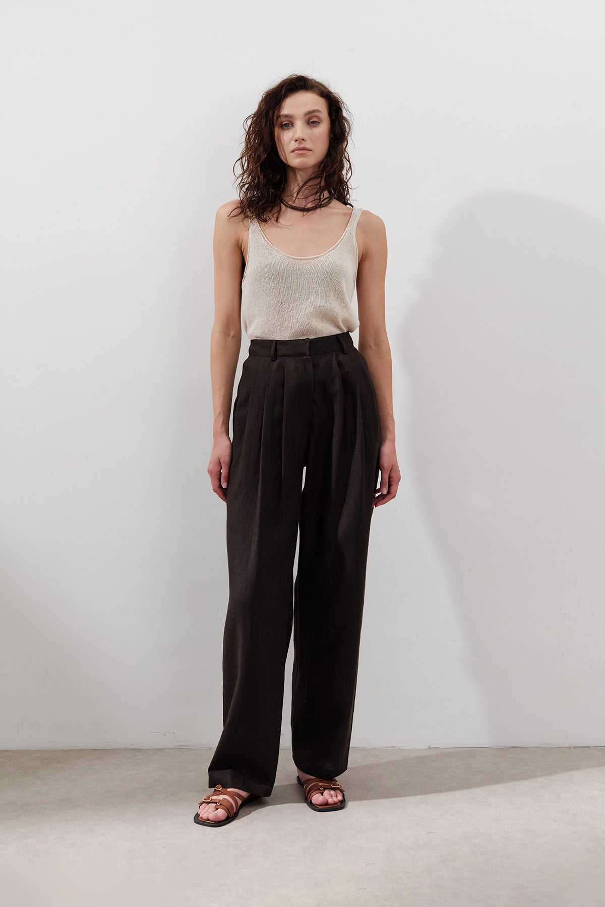 Pleated Wide-Leg Linen Trousers Dark Brown