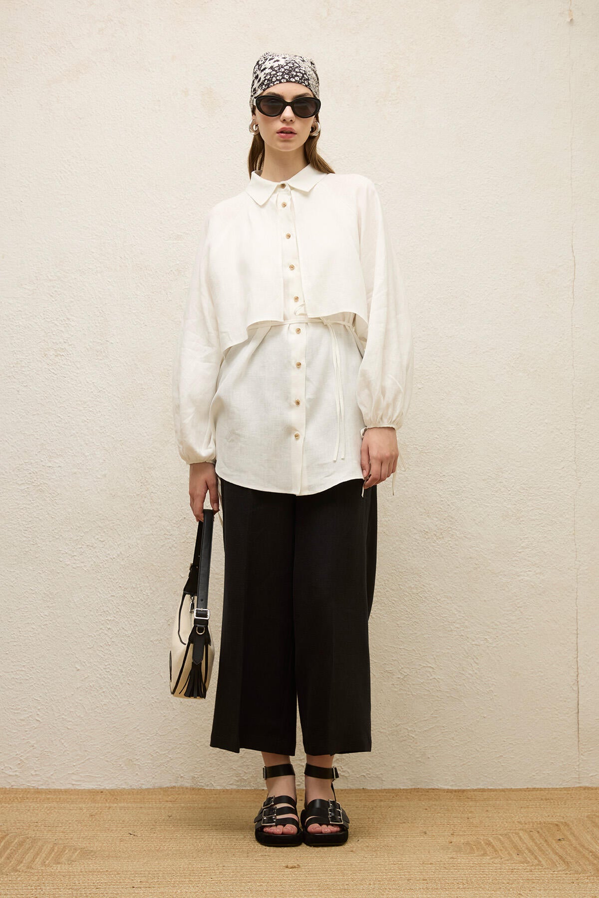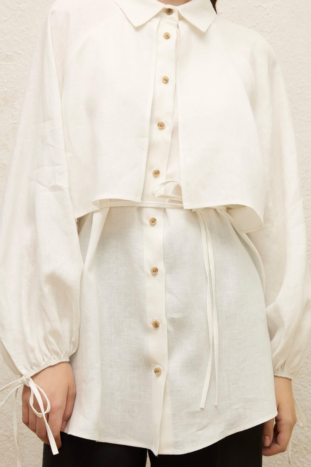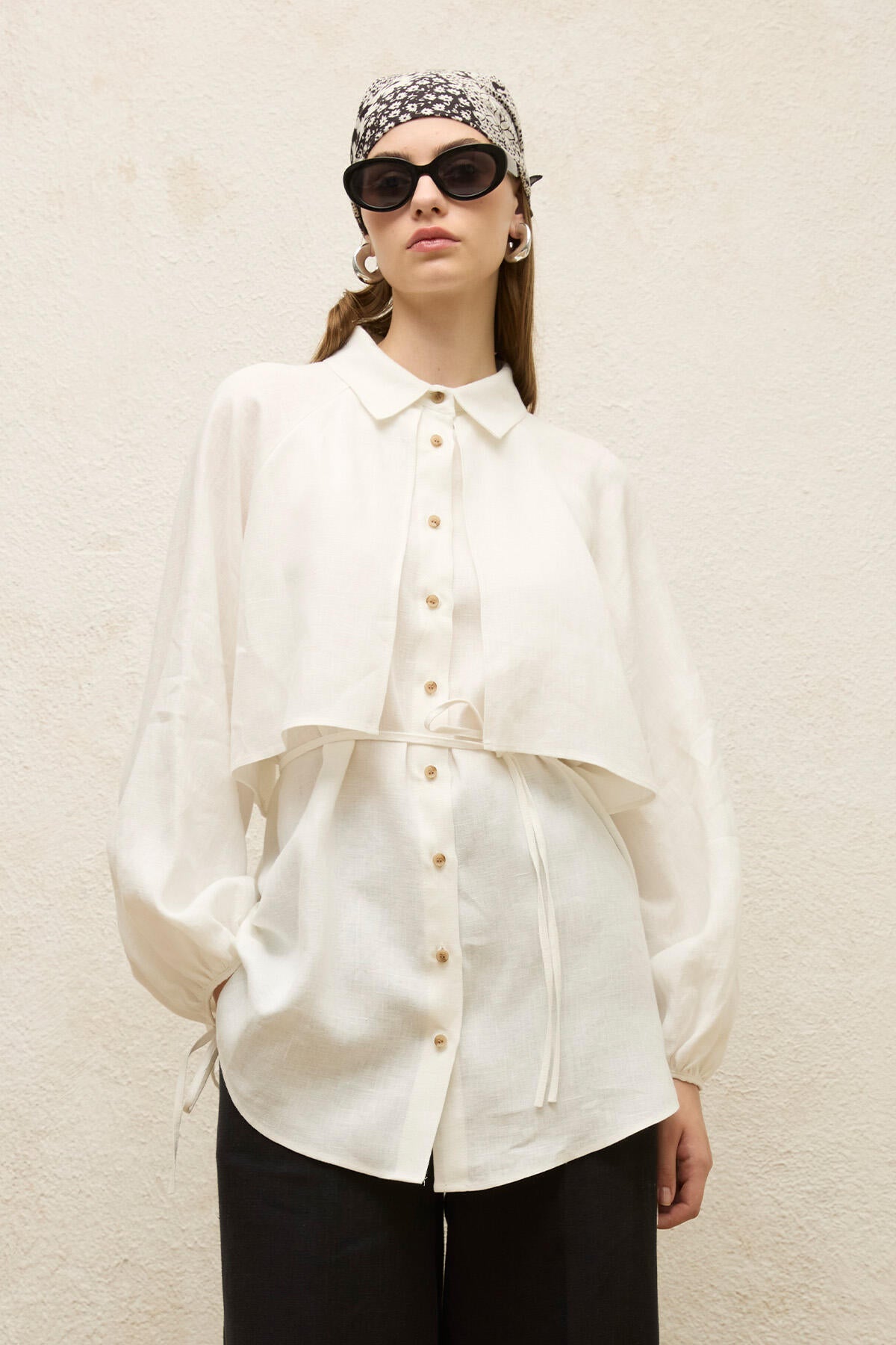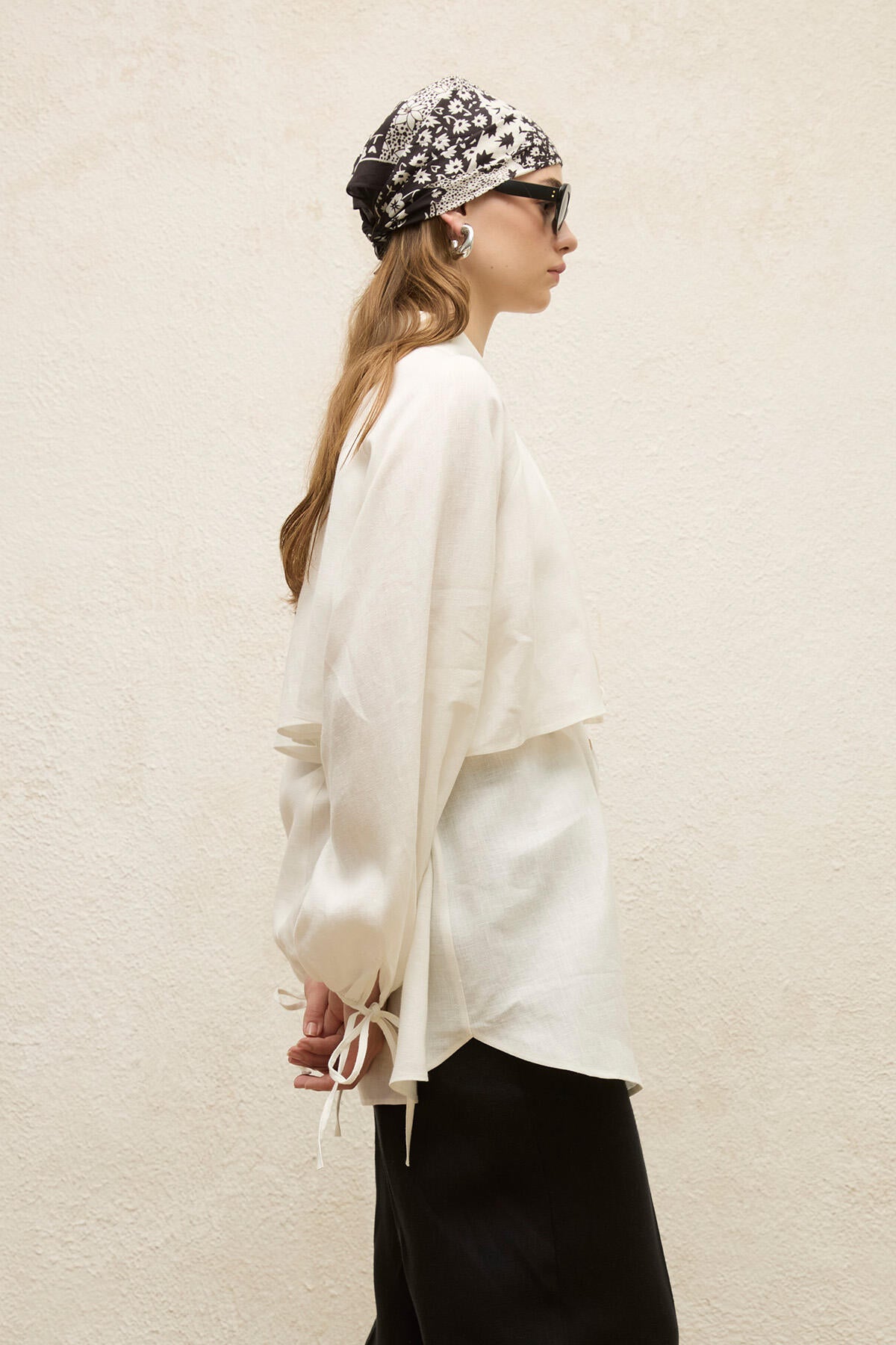 Windbreaker design, shirt collar, button closure, thin belt, raglan sleeves, tie detail at sleeve cuffs, made from 100% linen.