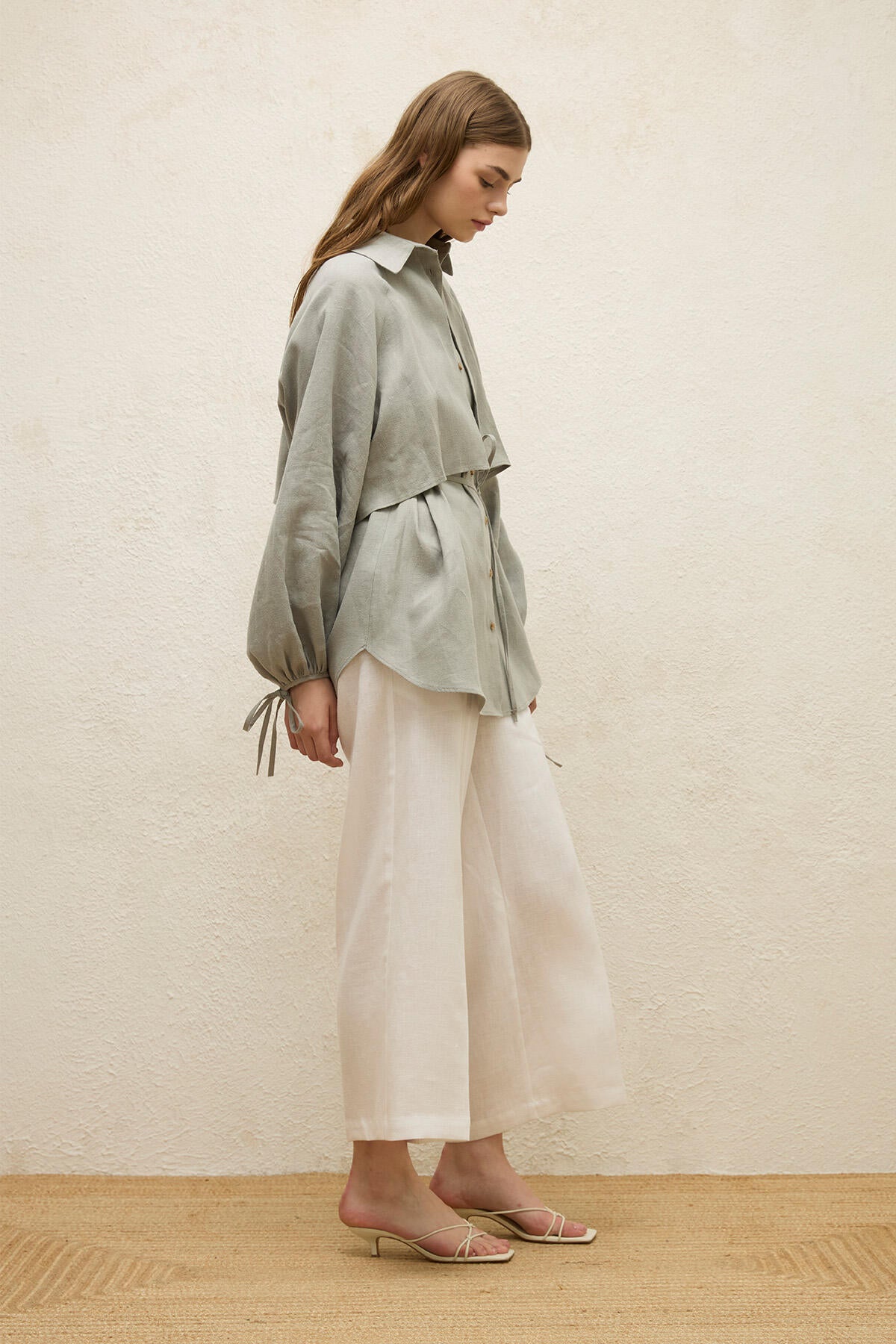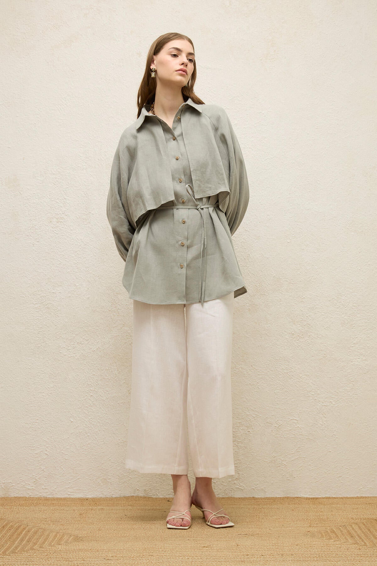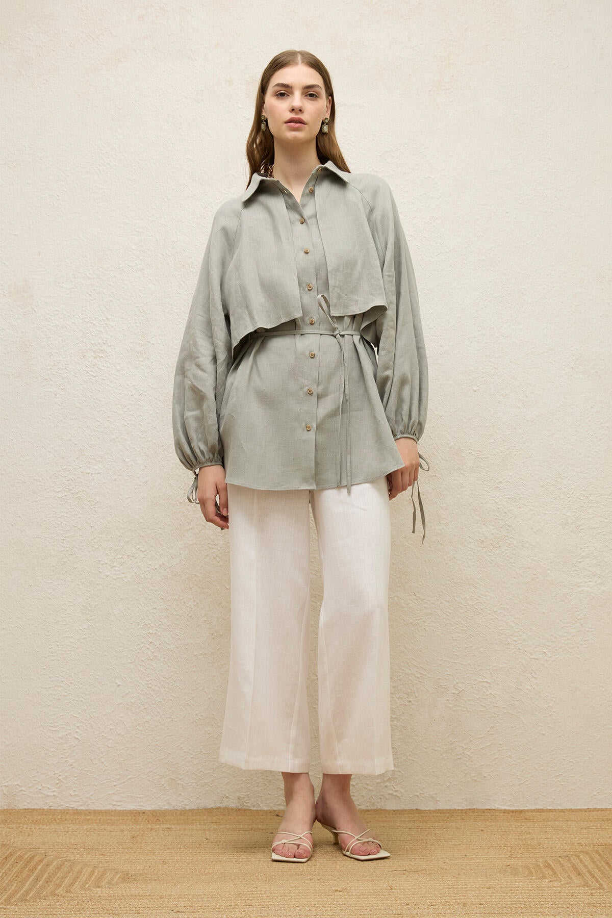 Windbreaker design, shirt collar, button closure, thin belt, raglan sleeves, tie detail at sleeve cuffs, made from 100% linen.