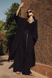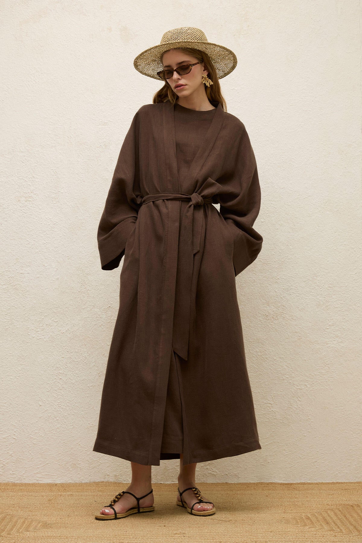 This kimono jacket features wide sleeves, side pockets, and a belt.