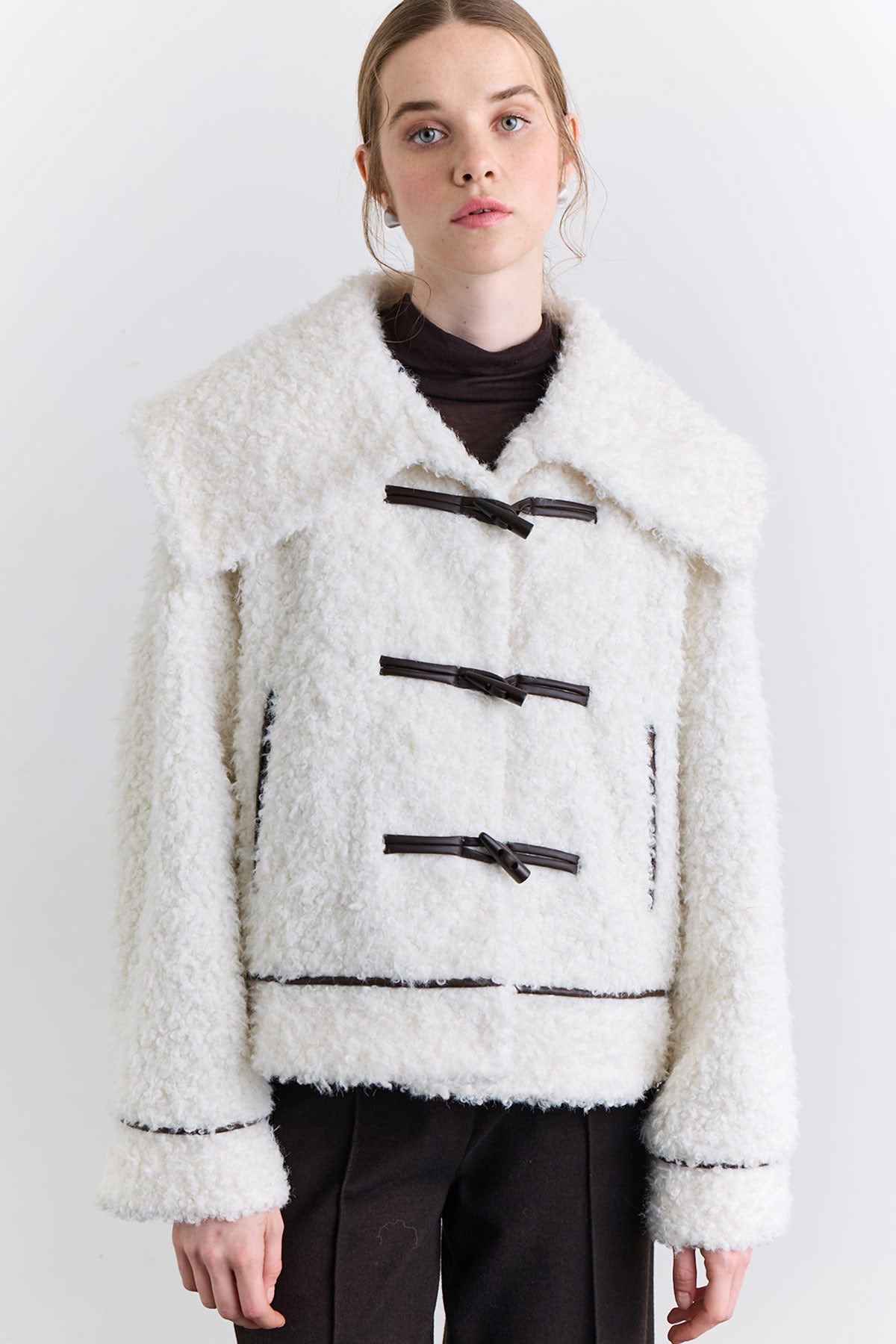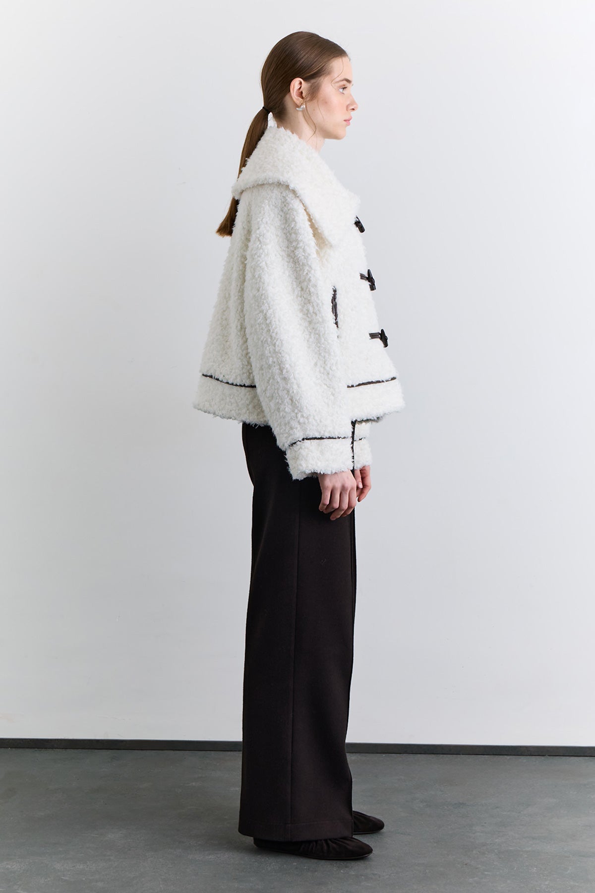 Regular kalıp, geniş yaka, uzun kol, deri şerit ve düğme kapamalı detaylı, ara boy.