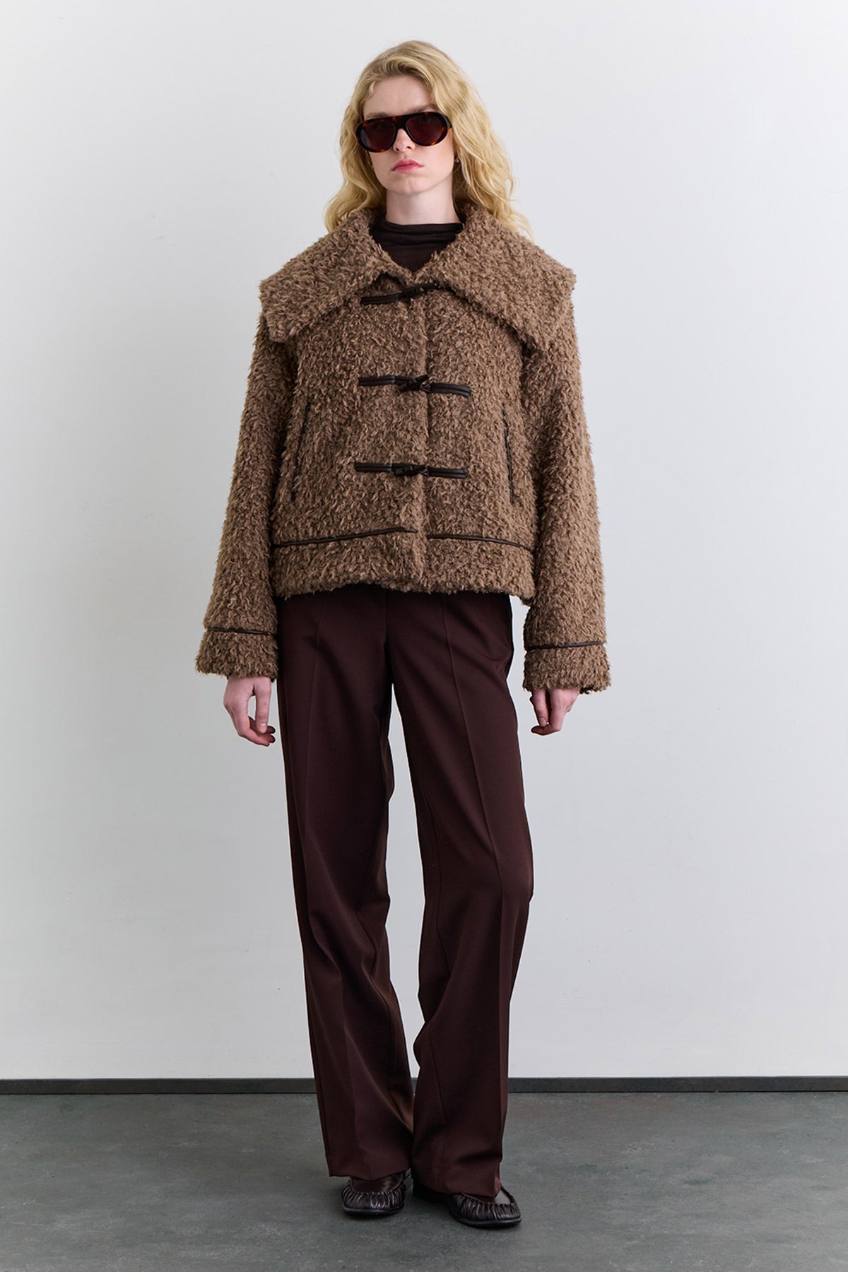 Regular kalıp, geniş yaka, uzun kol, deri şerit ve düğme kapamalı detaylı, ara boy.