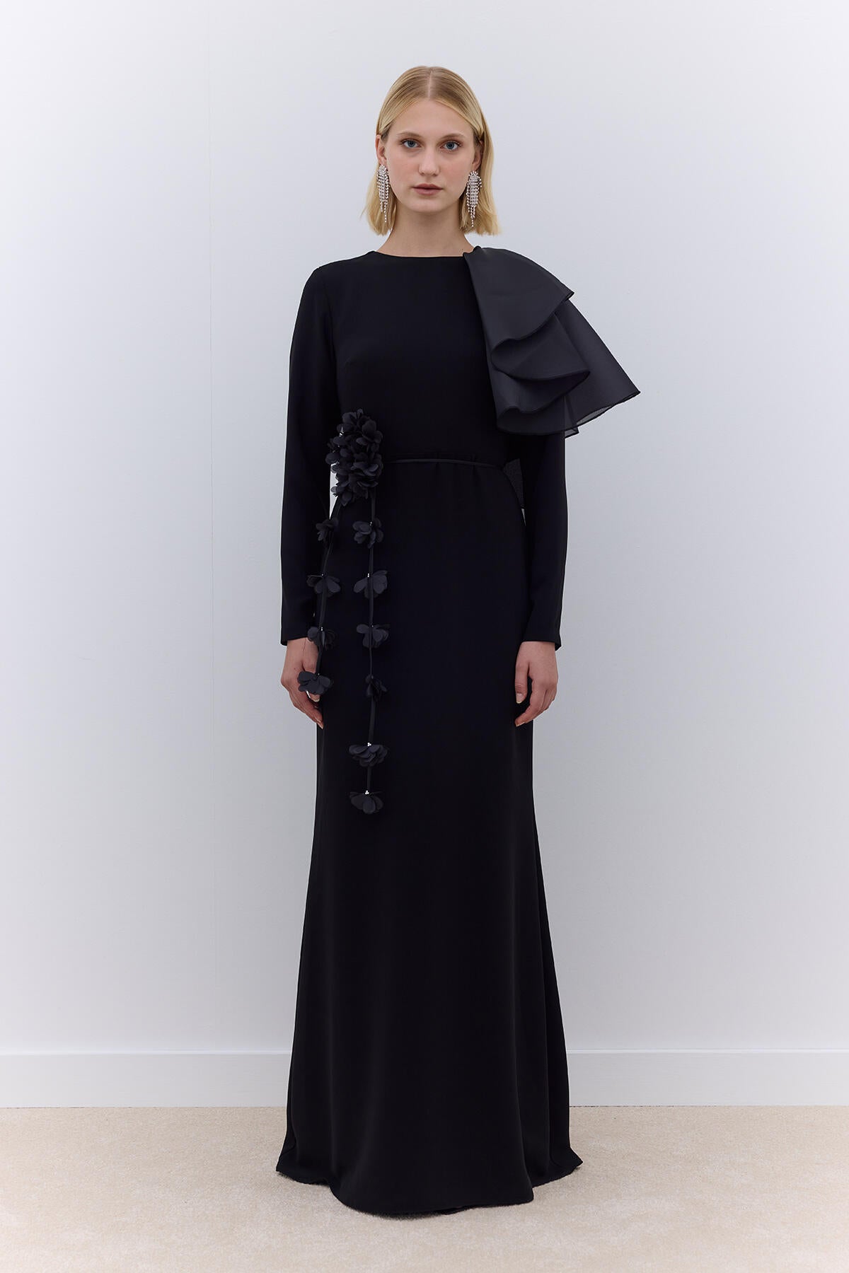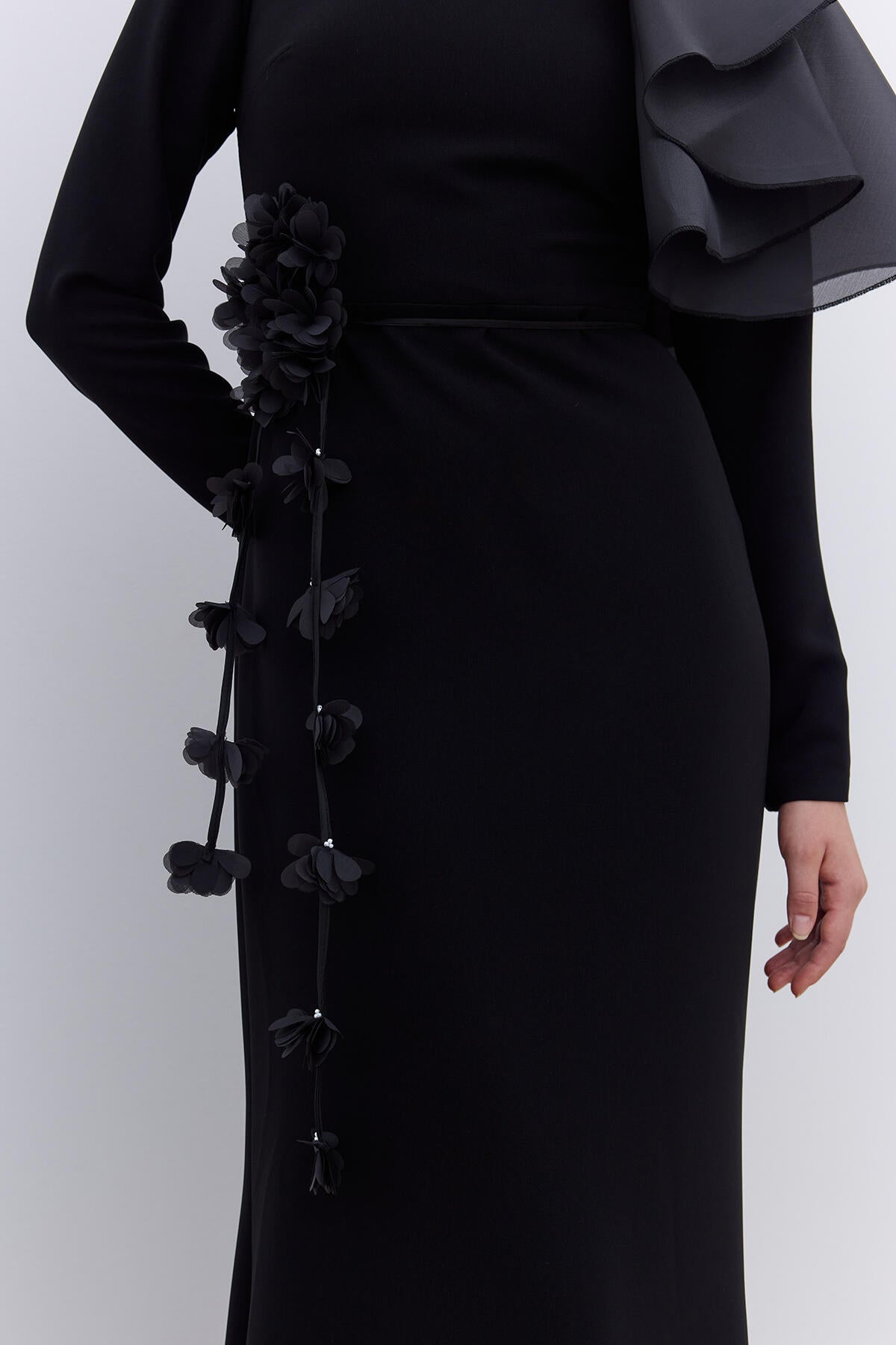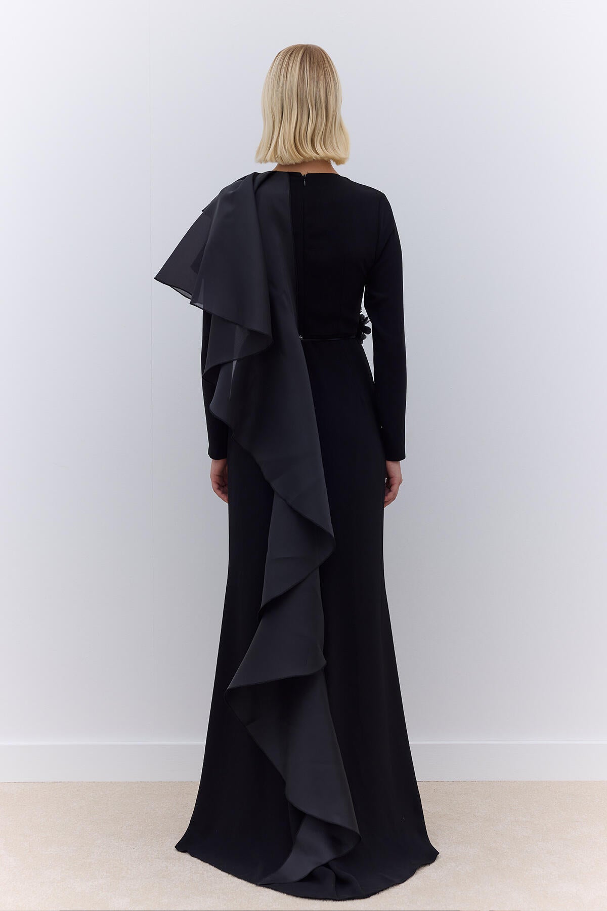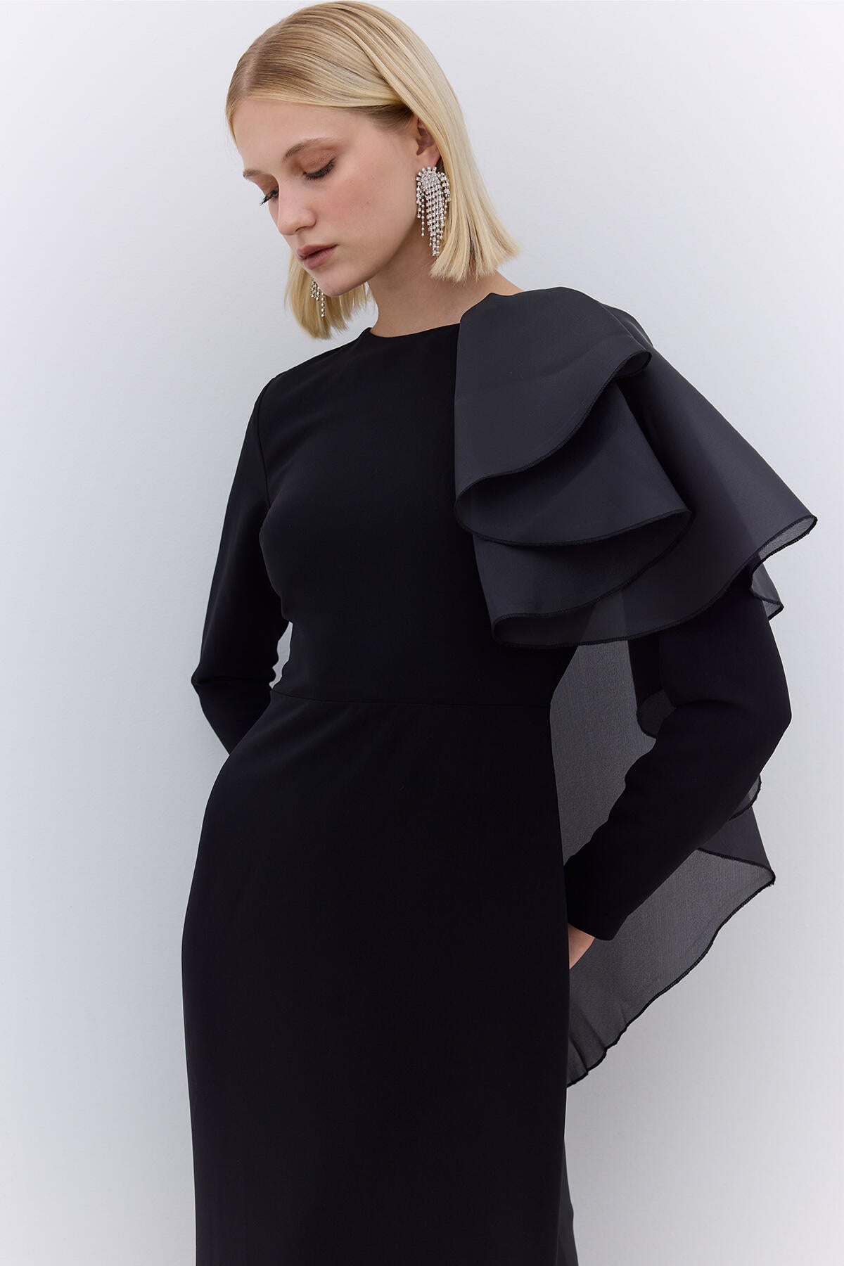 This elegant dress is designed with a body-conscious fit and features long sleeves with organza ruffle detailing on the shoulders. It is fully lined for added comfort and includes a hidden zip closure at the back.