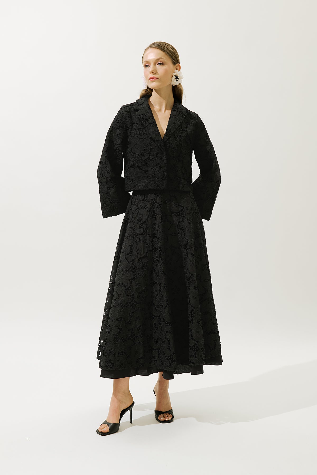 High-waisted, lace detail, concealed zipper closure, fully lined, with a wide flared skirt.