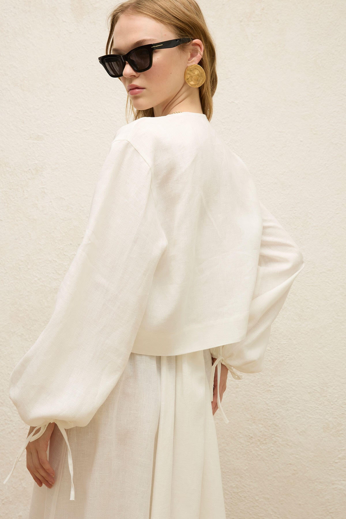 This top features a round neckline, tie detail, and balloon sleeves. Made from 100% linen fabric.