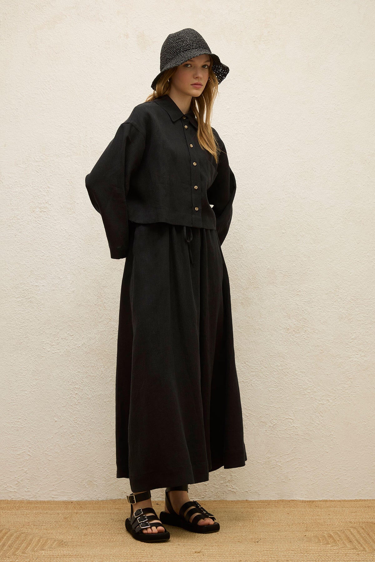 Long Sleeve Linen Crop Shirt Black