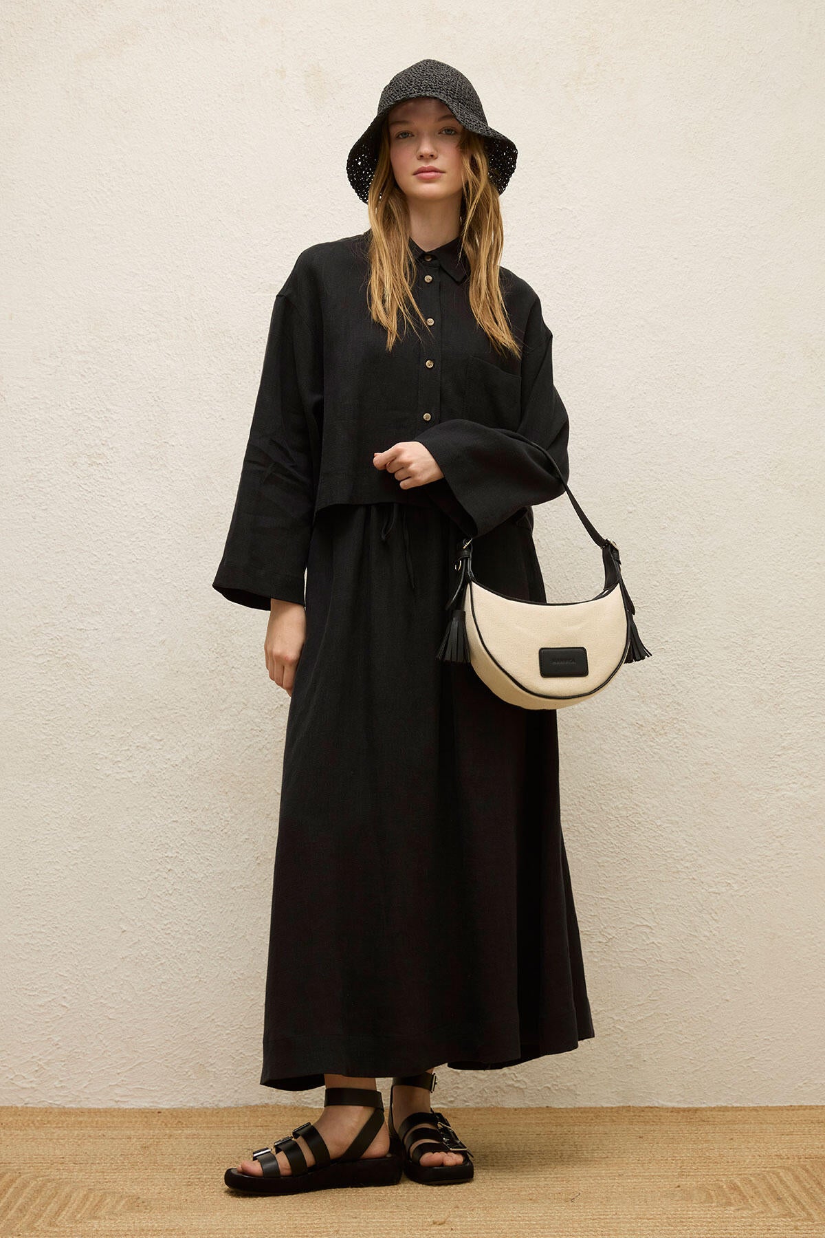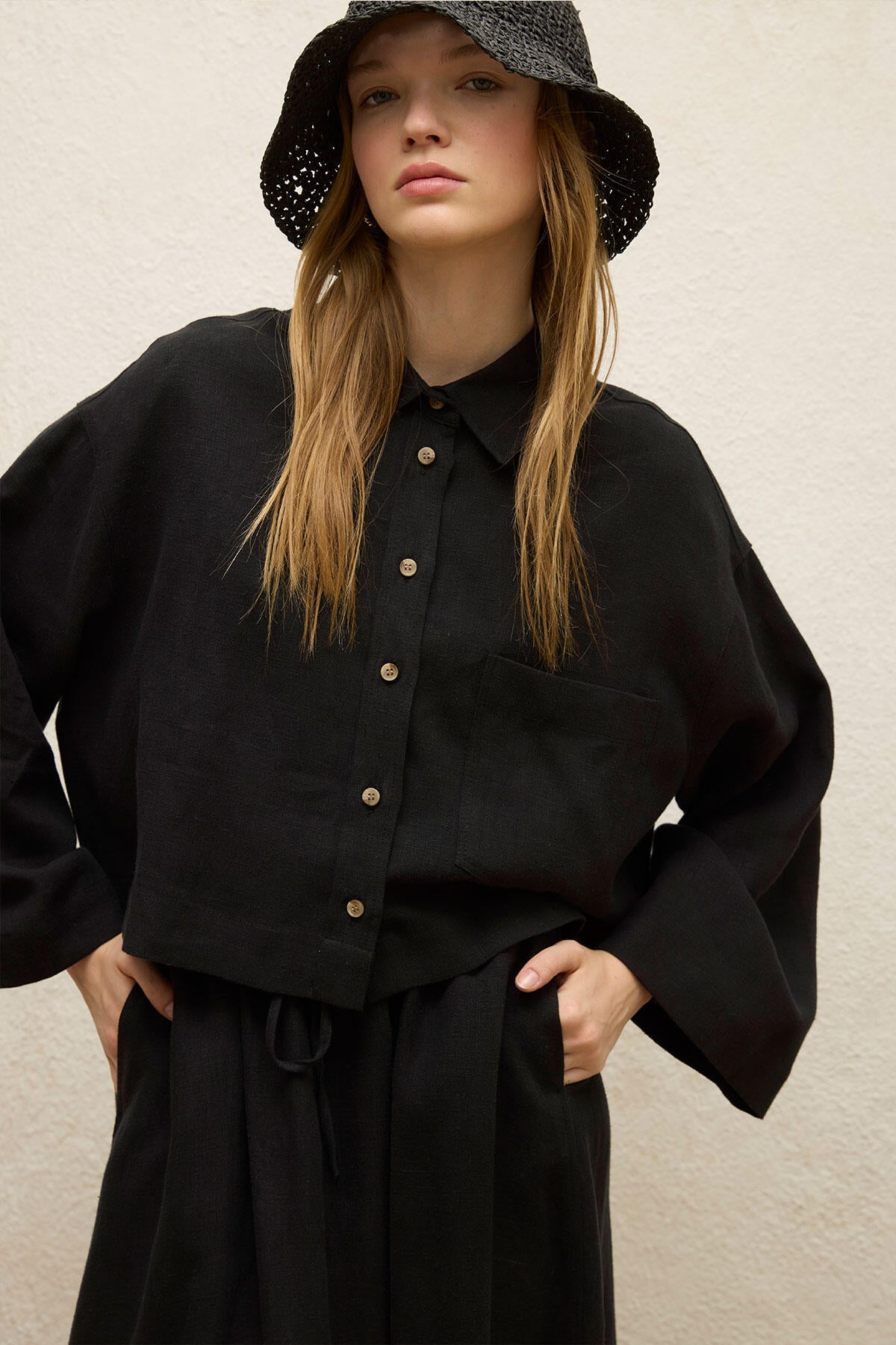Shirt collar, button closure, long and wide sleeves, chest pocket detail, made from 100% linen fabric.