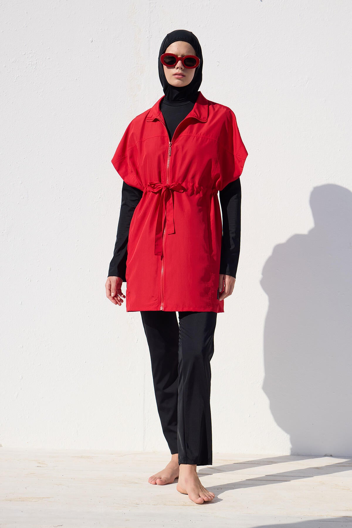 Featuring a high collar and an oversized fit, this top has low shoulders, side pockets, and drawstring elastic details at the shoulders. It is made from parachute fabric and includes a zip closure.