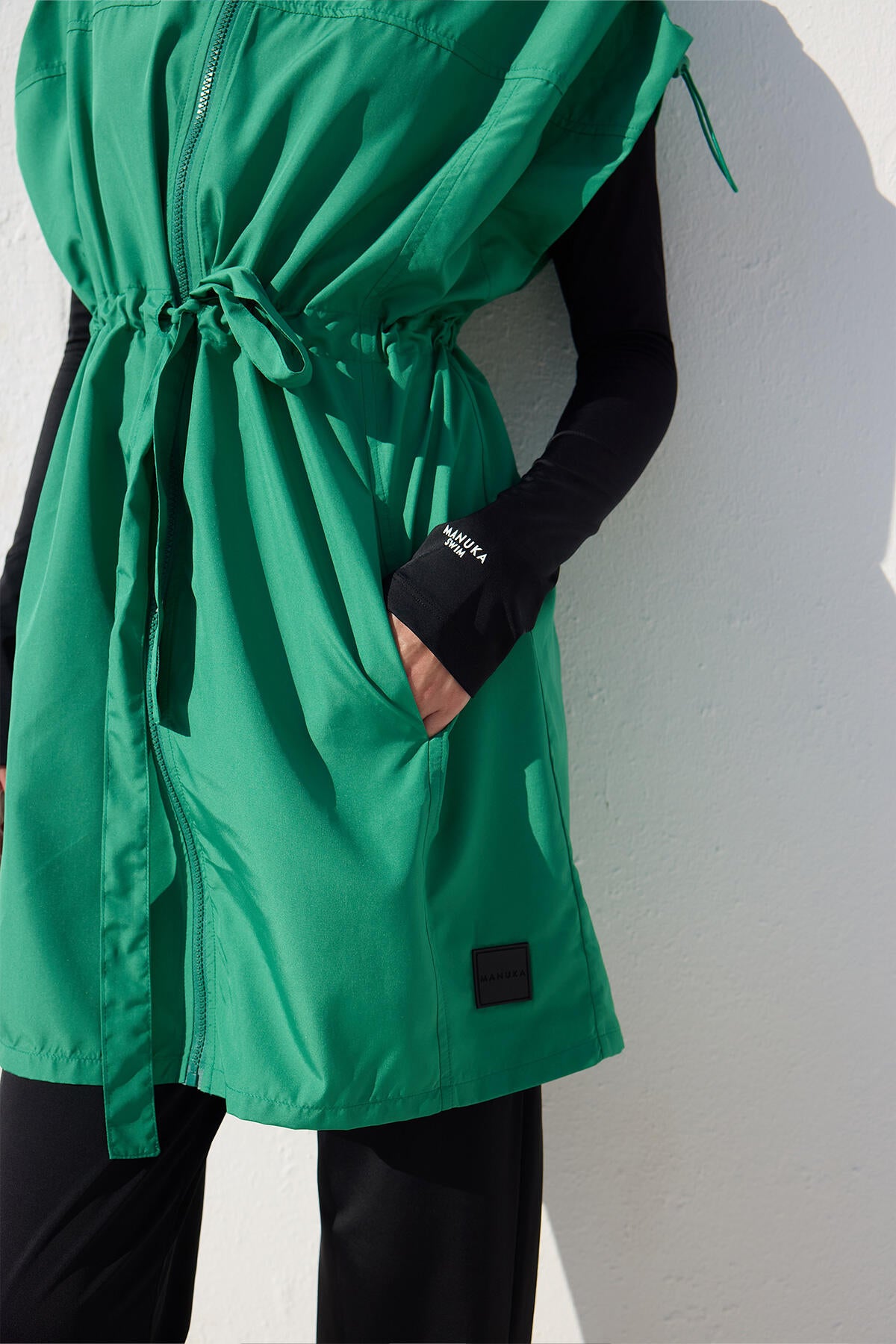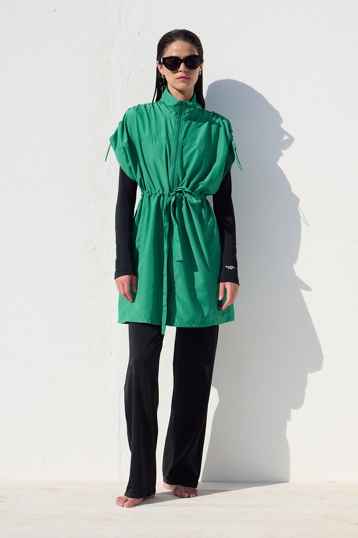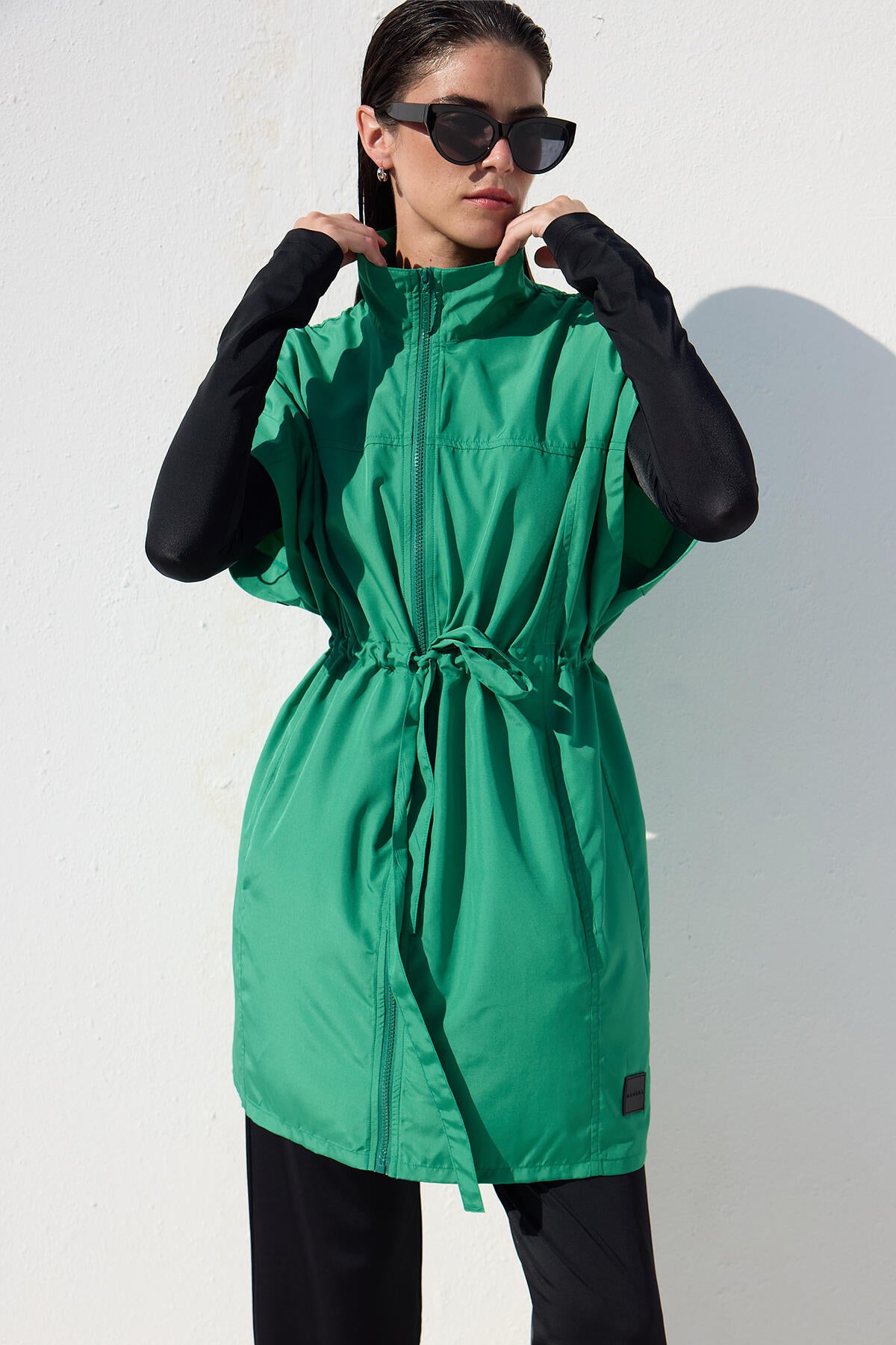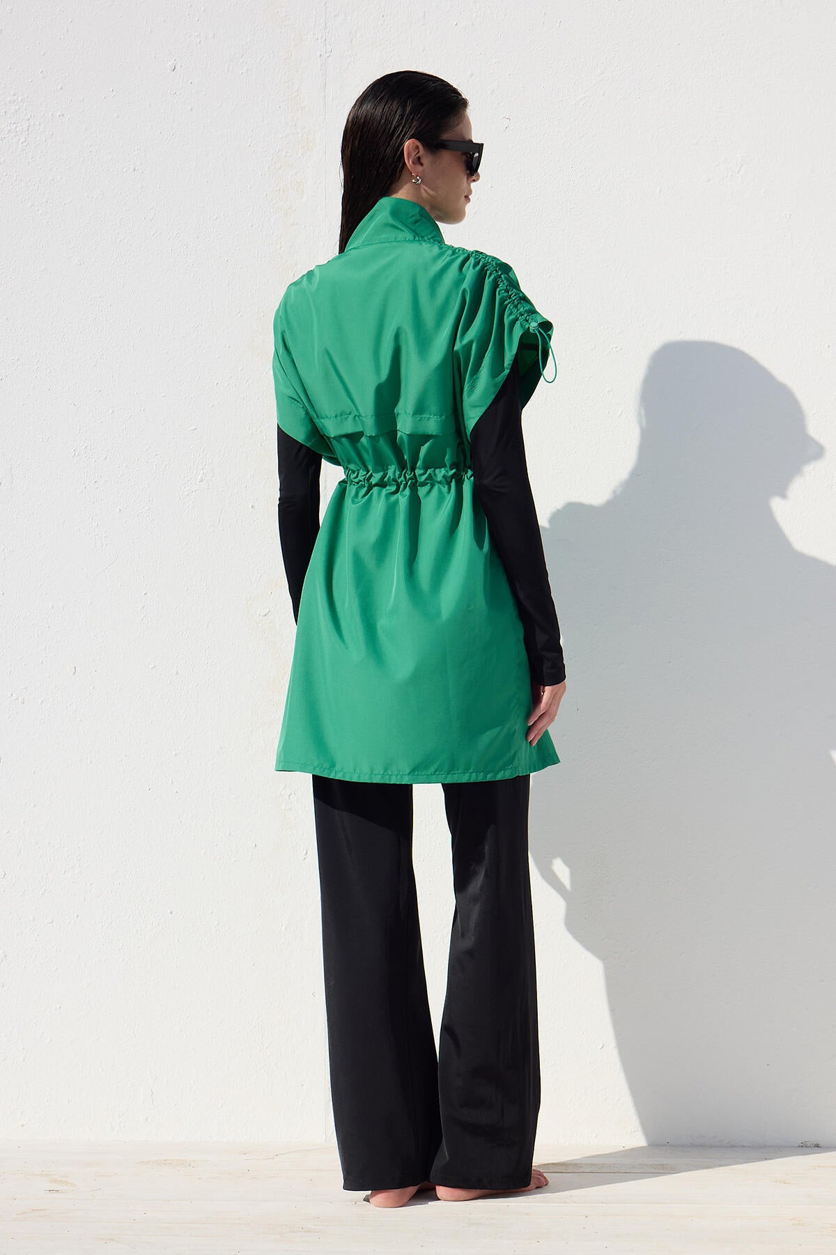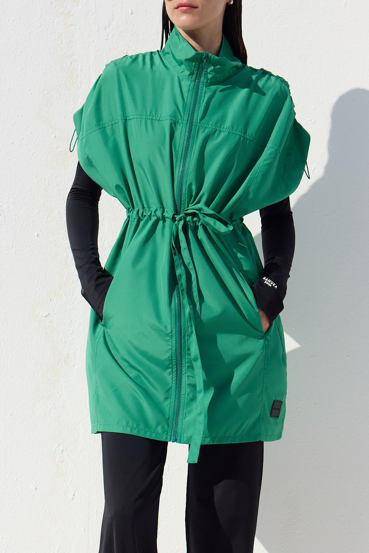 Featuring a high collar and an oversized fit, this top has low shoulders, side pockets, and drawstring elastic details at the shoulders. It is made from parachute fabric and includes a zip closure.