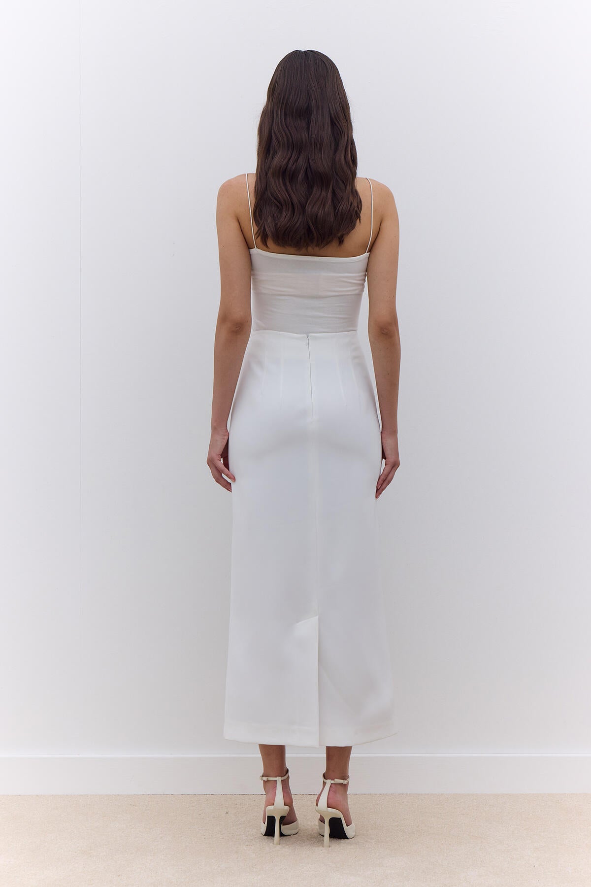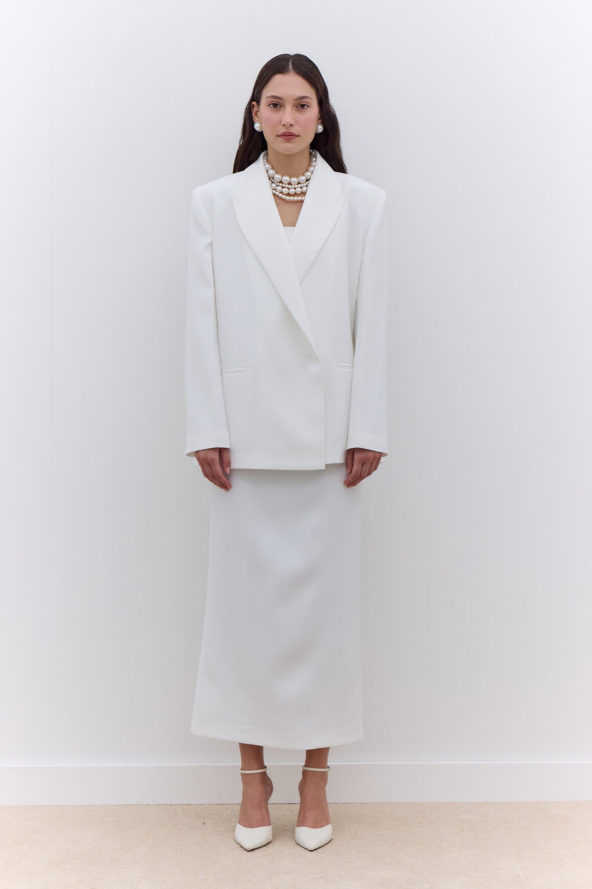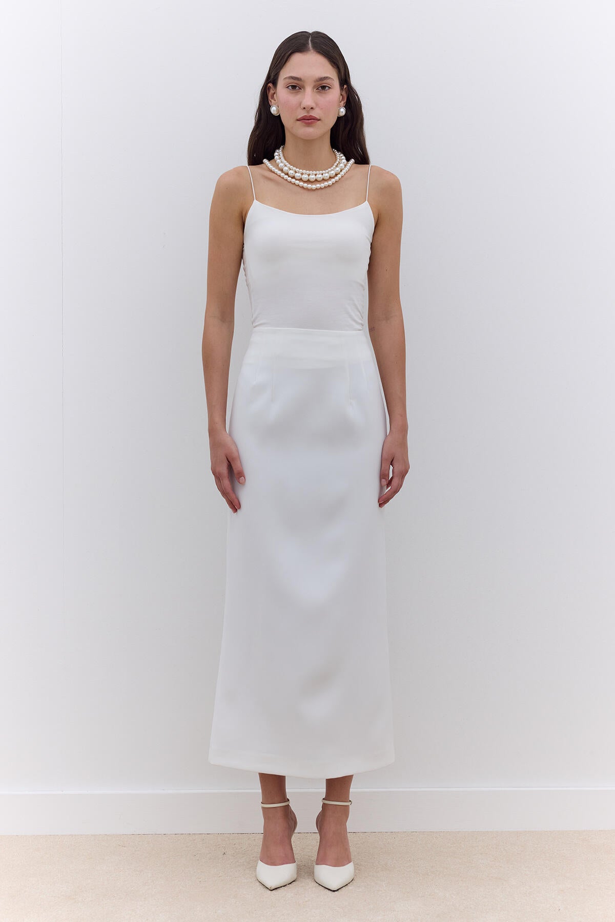This high-waist pencil skirt features a hidden zip closure and a subtle side slit, combining classic elegance with modern style. The skirt is tailored with front and back darts for a flattering fit and a smooth silhouette.