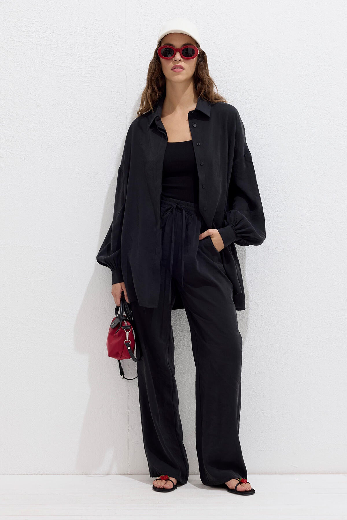 Elastic waistband, side pockets, drawstring detail, straight leg, full length.