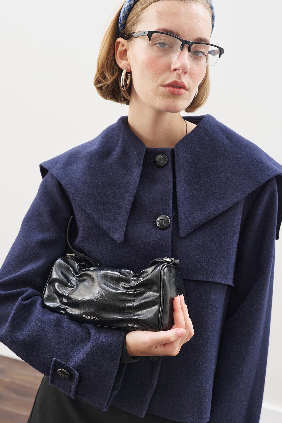 Büzgü detaylı,fermuar kapamalı,suni deri,astarlı.