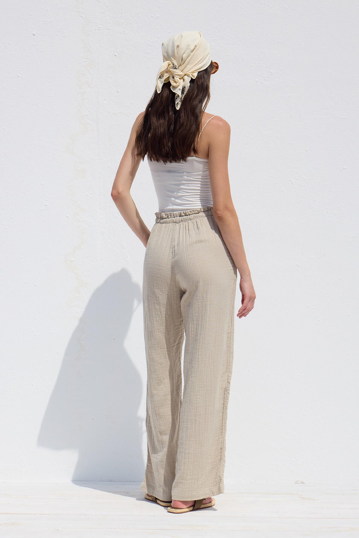 Elastic-waist muslin pants with side pockets, drawstring detail, and straight full-length legs.