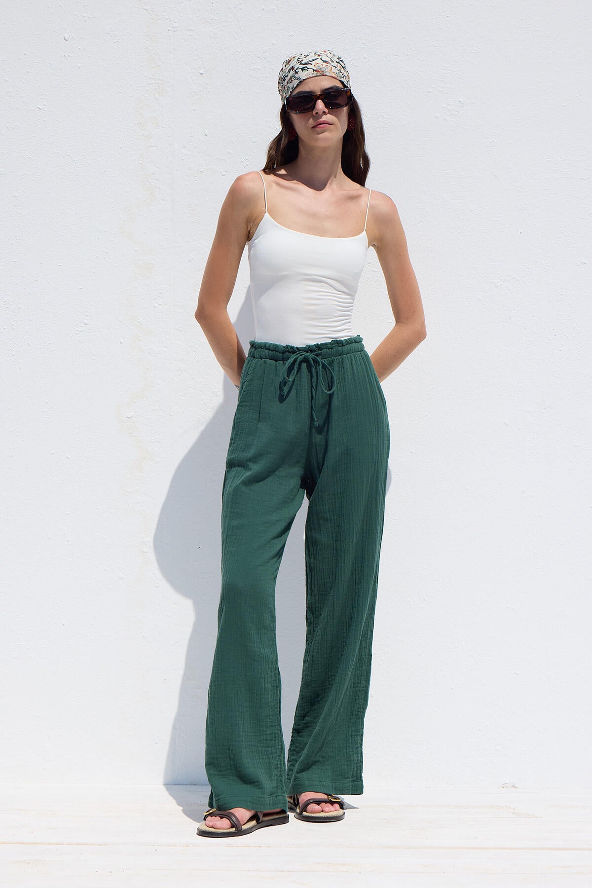 Elastic-waist muslin pants with side pockets, drawstring detail, and straight full-length legs.
