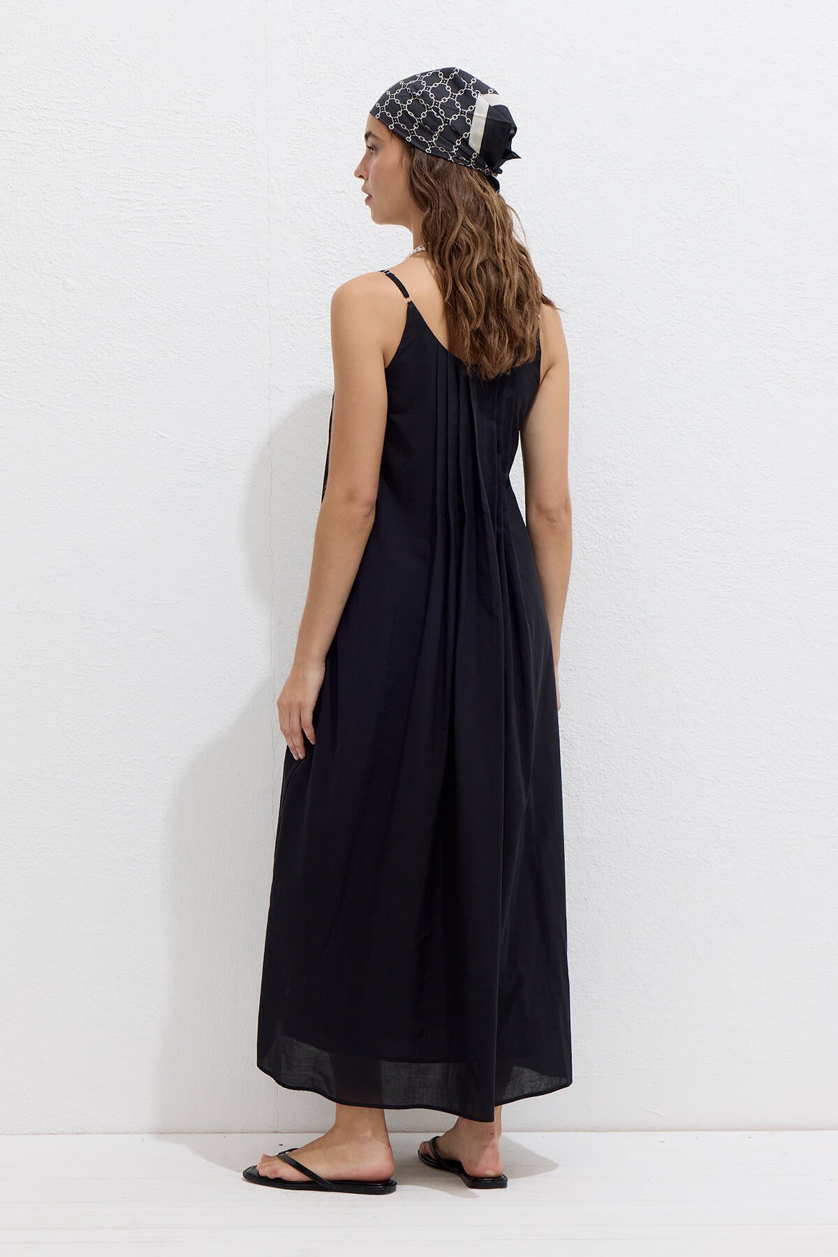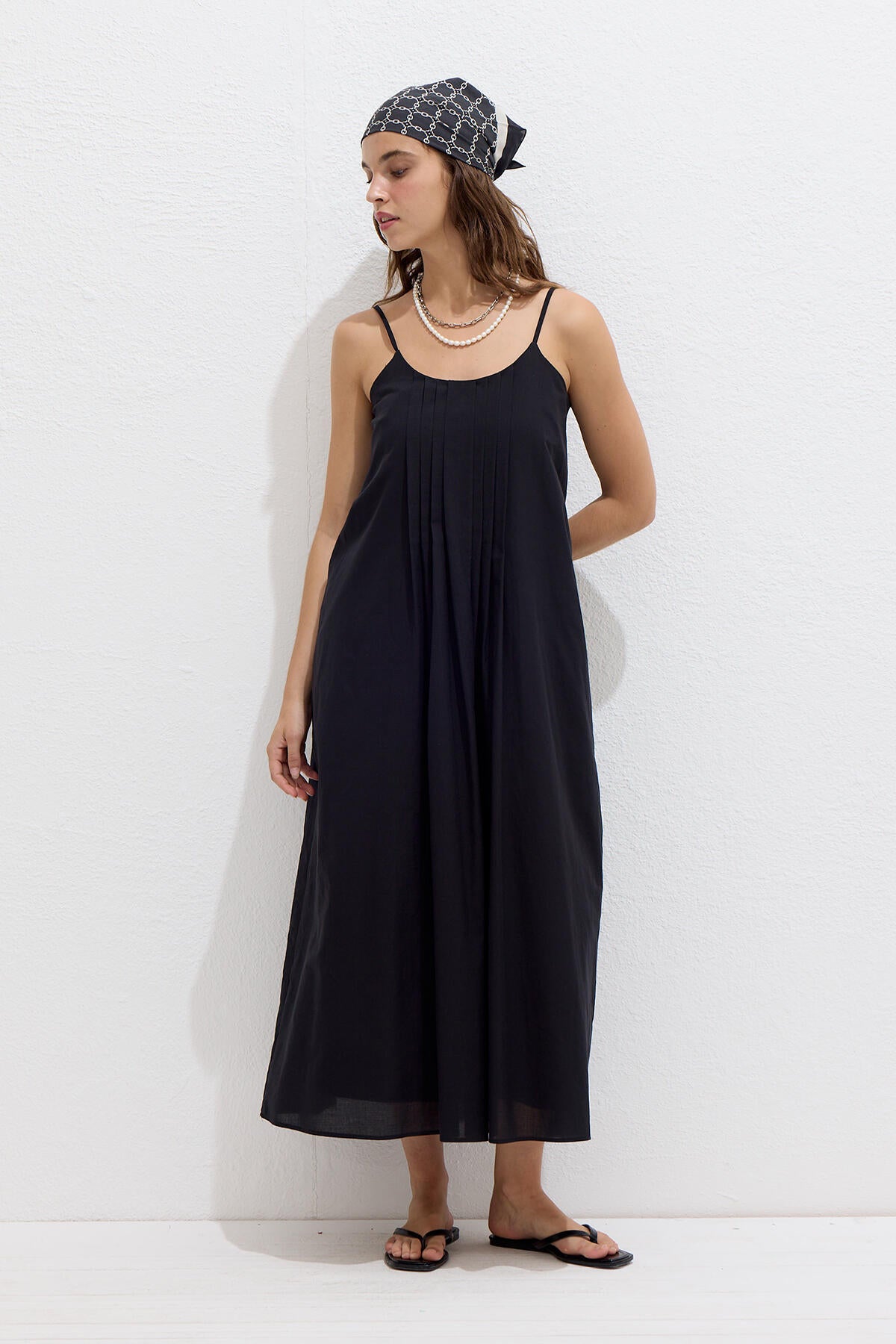 Adjustable straps, ribbed texture, wide skirt, fully lined, and a waist tie detail.