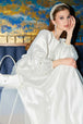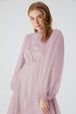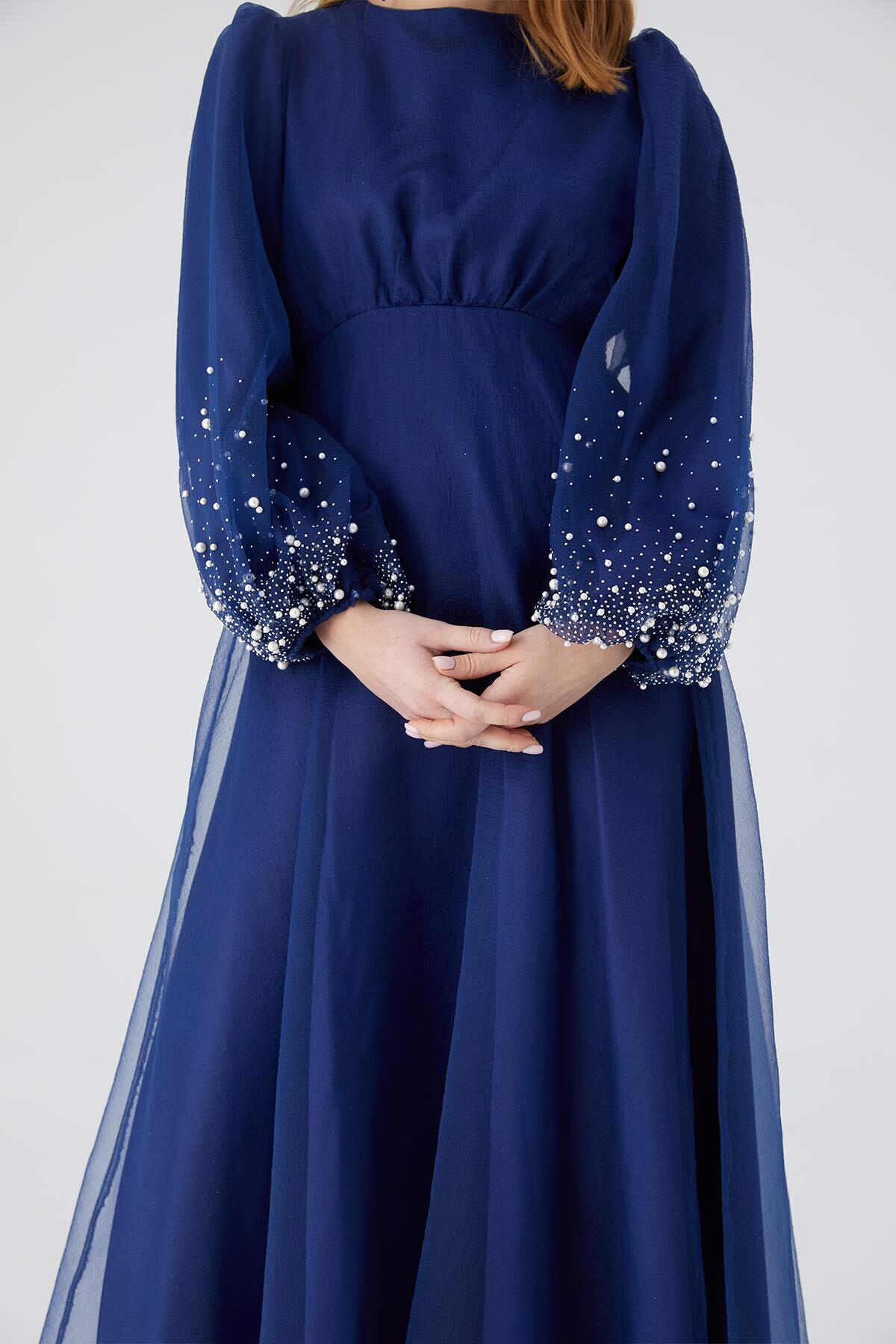 This dress features a timeless round neckline and statement balloon sleeves, adding a touch of drama to the silhouette. The voluminous skirt cascades gracefully, creating a mesmerising effect with every step. The cinched waistline, adorned with delicate gathers, enhances your figure while providing a flattering silhouette. Crafted from luxurious organza fabric, this dress boasts intricate stone and pearl embroidery along the sleeves, adding a touch of opulence and glamour. Complete with a discreet zipper closure at the back, this dress ensures a seamless fit.