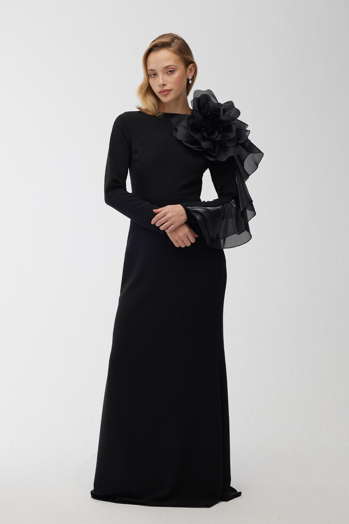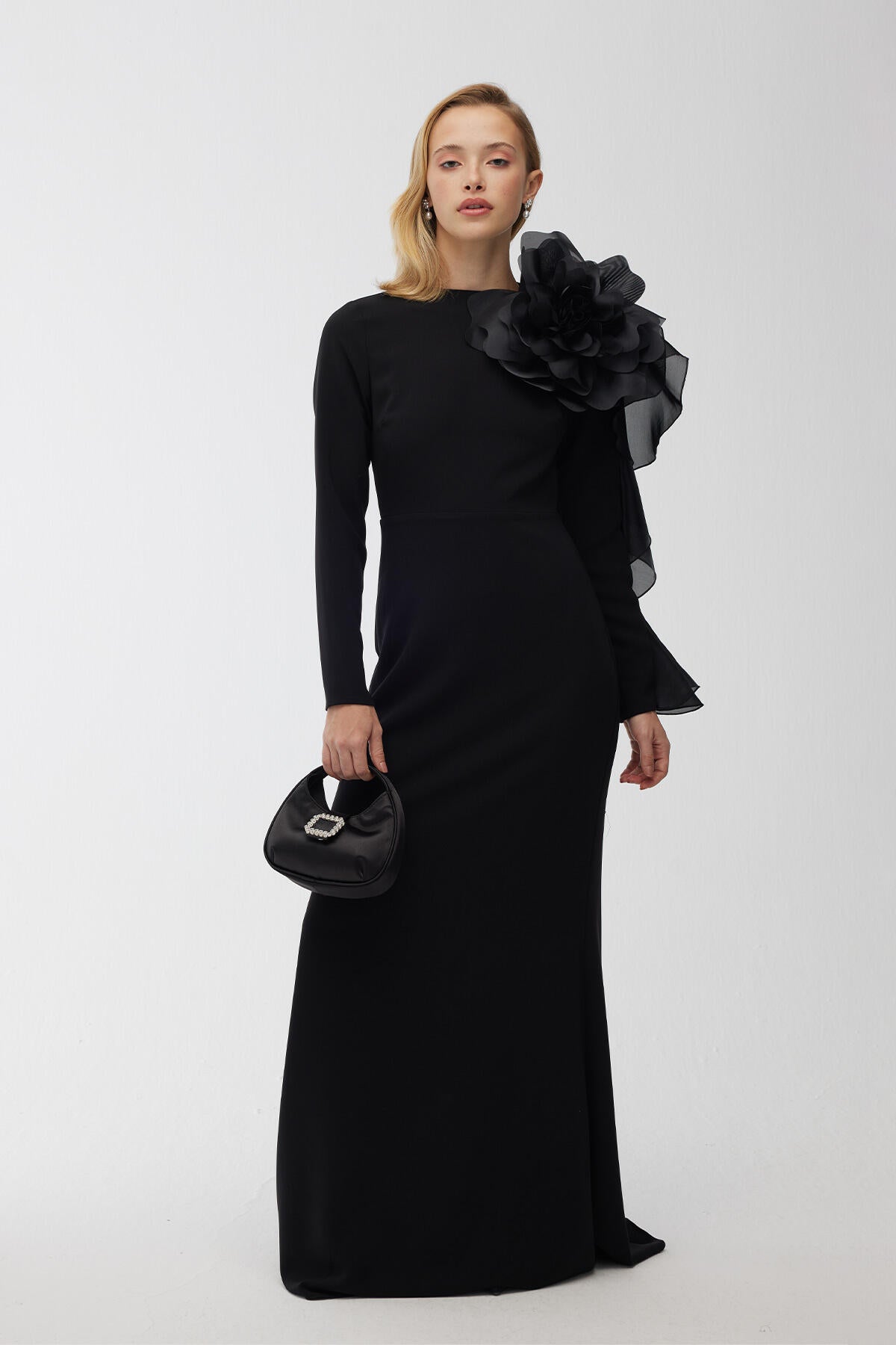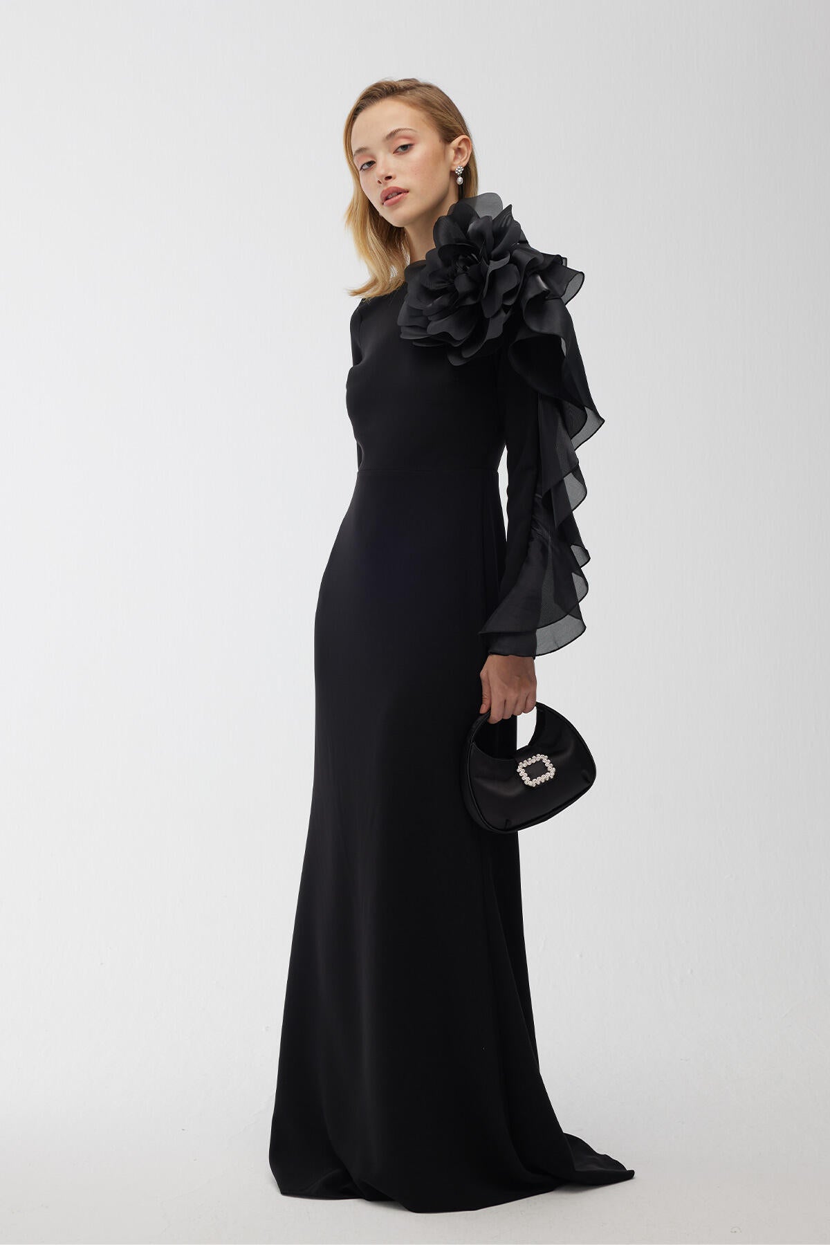 Brooch Detail Organza Evening Dress Black