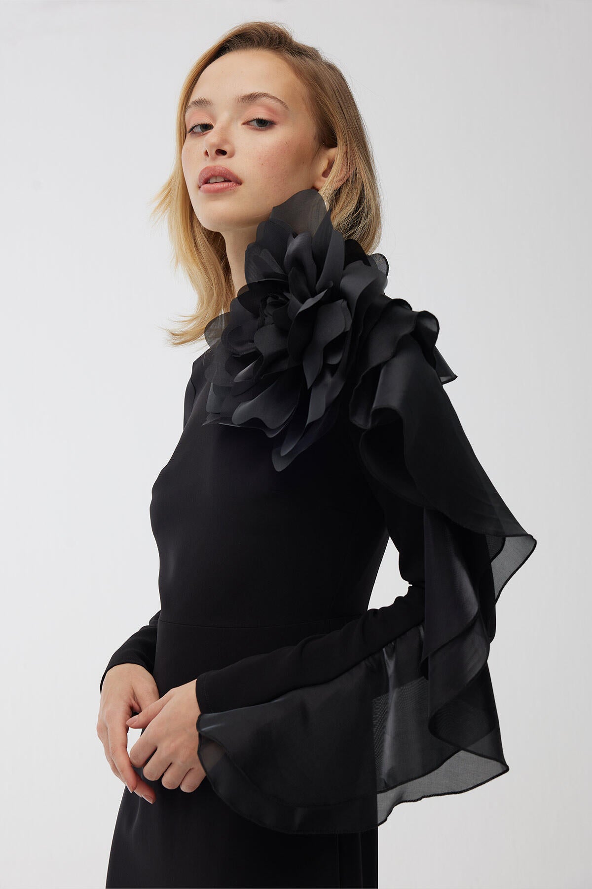 Organza ruffle detail on shoulder and sleeve