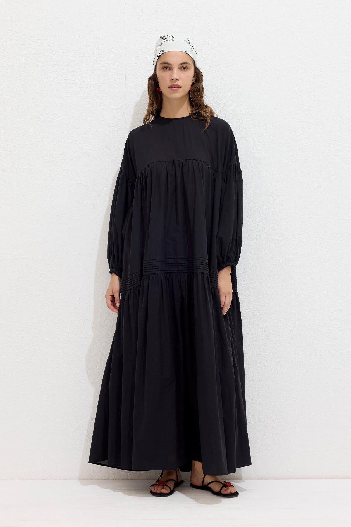 This oversized dress features a round neckline, dropped shoulders, balloon sleeves, ruching, pintuck details, and a belt. Made from cotton voile fabric. Unlined.