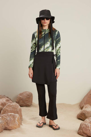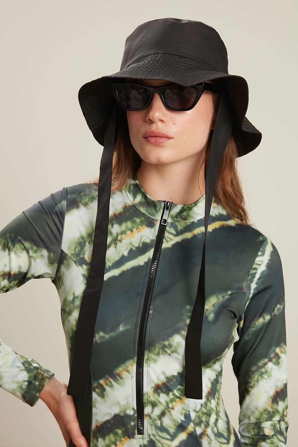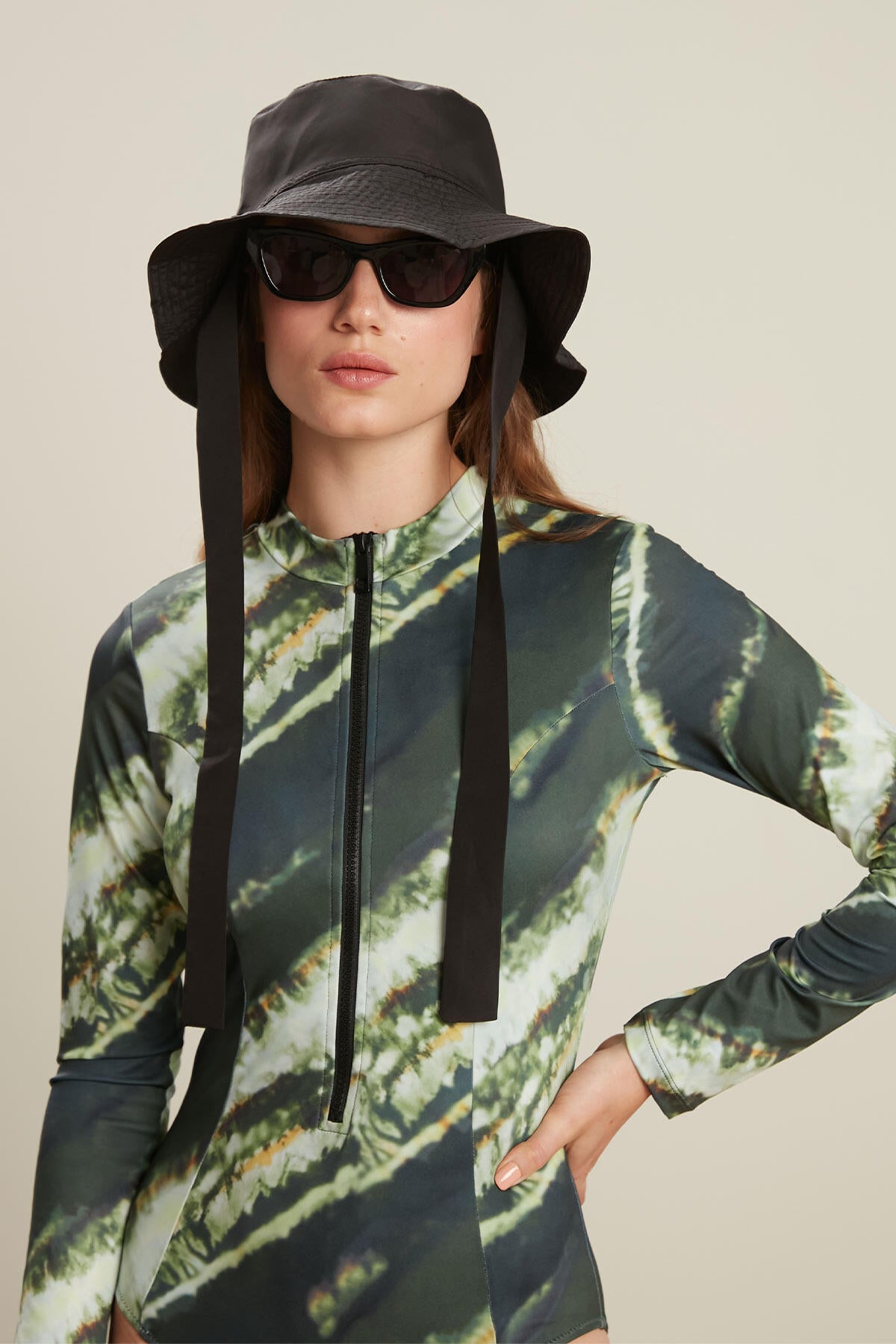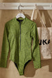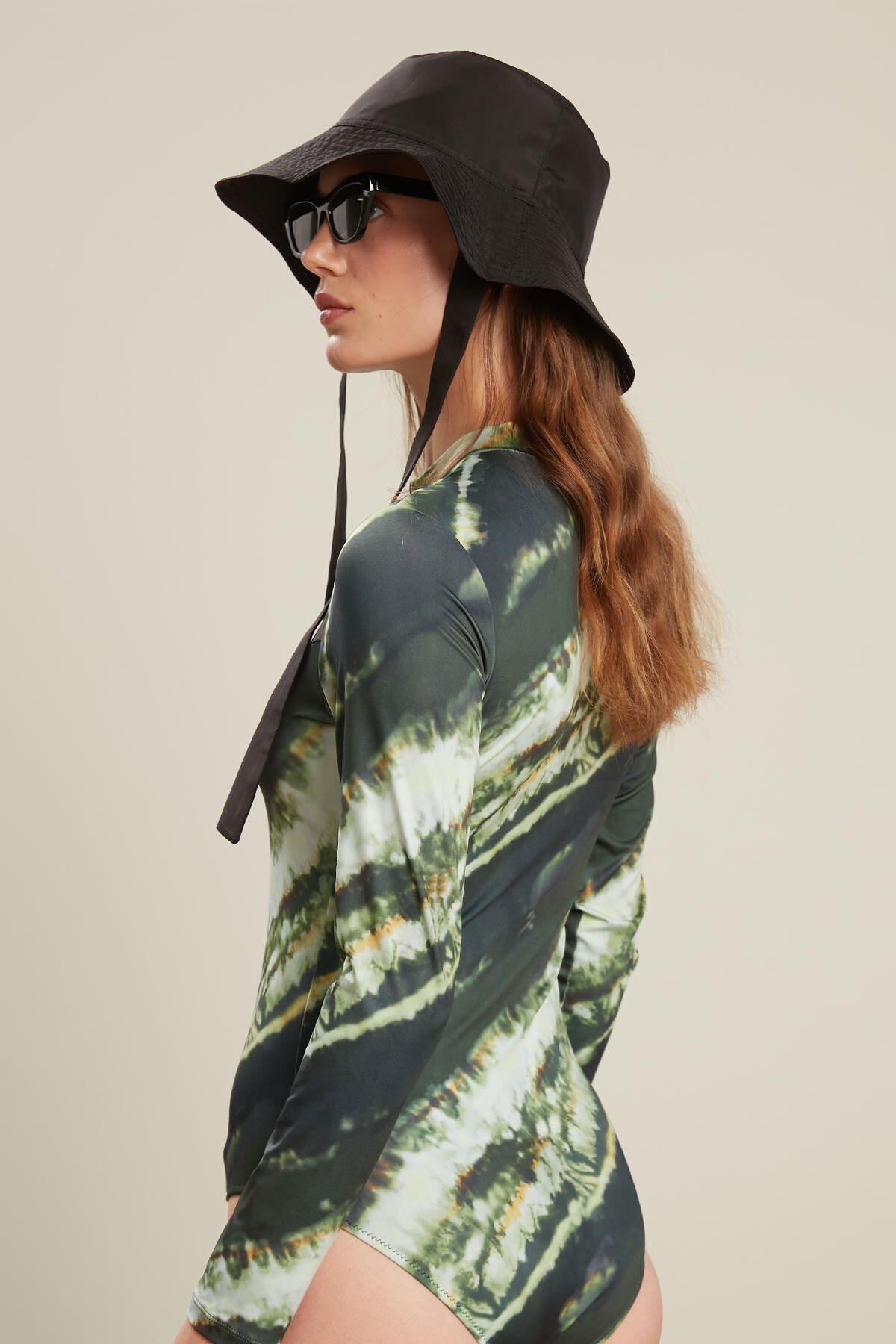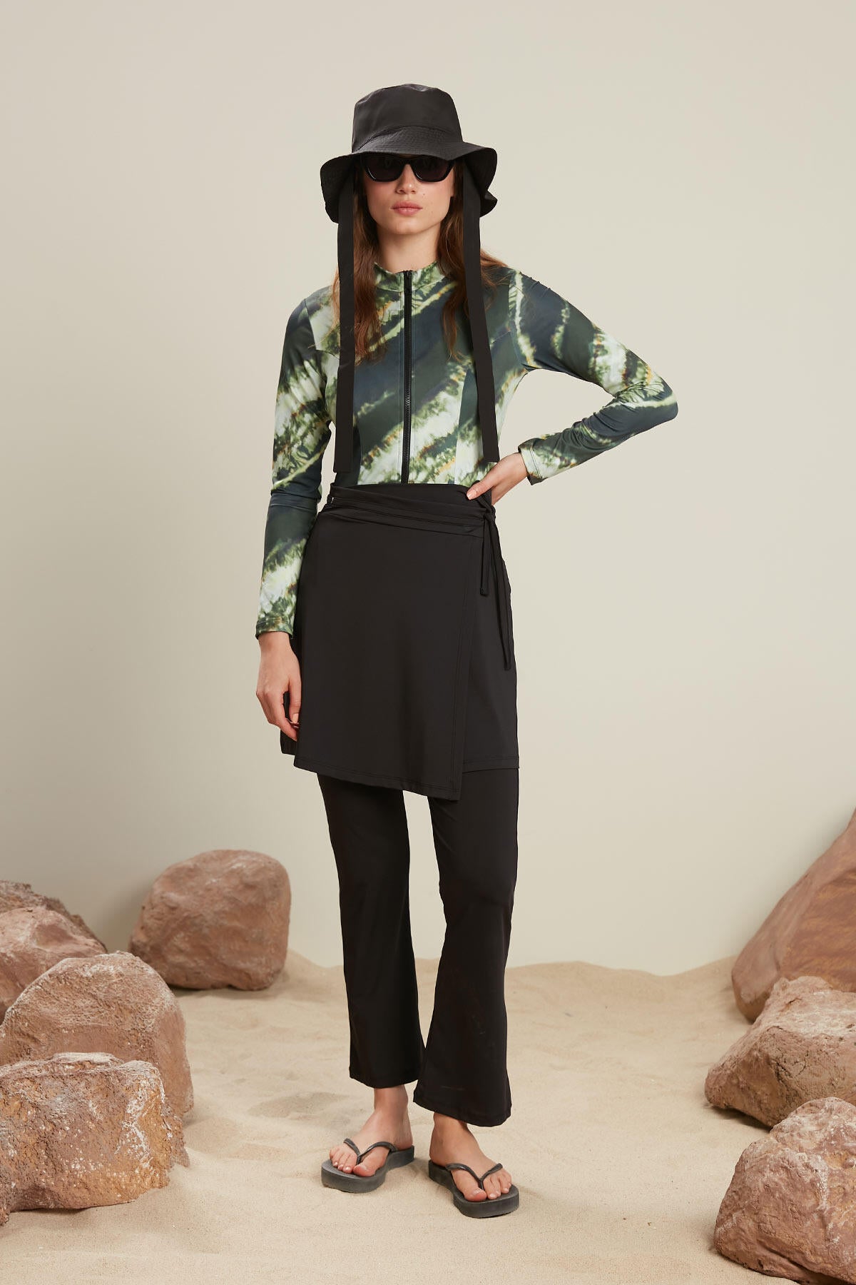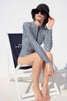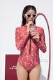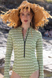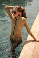 Crafted from flexible swimwear fabric with a composition of 90% polyester and 10% elastane, this swimsuit offers both comfort and stretch for a flattering fit. The high neckline and front zipper closure ensure a secure and stylish look, while the padded cups provide support and shape to the bust. Designed with a vibrant pattern, it adds a pop of color to your poolside ensemble (only includes the upper part of the swimsuit).