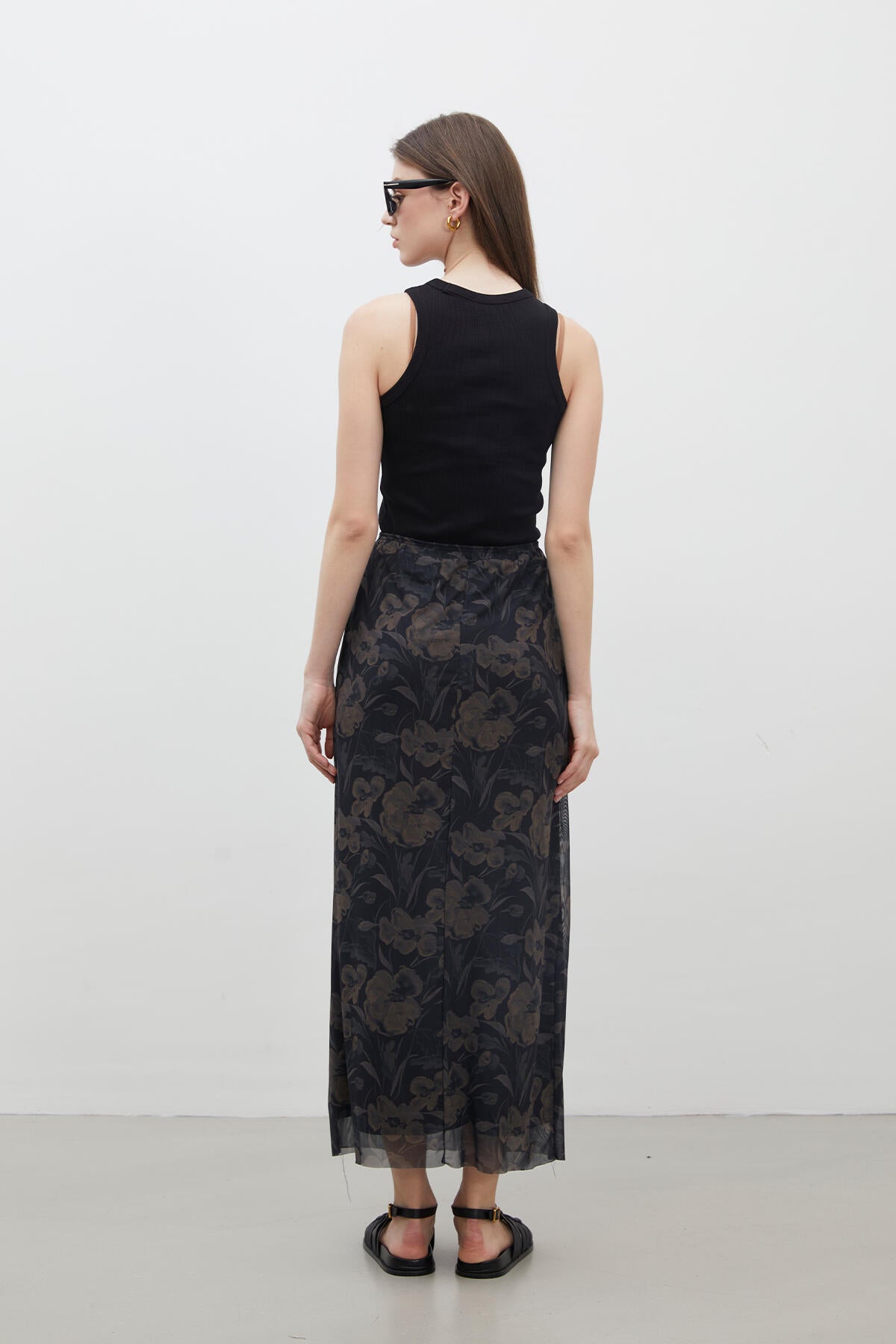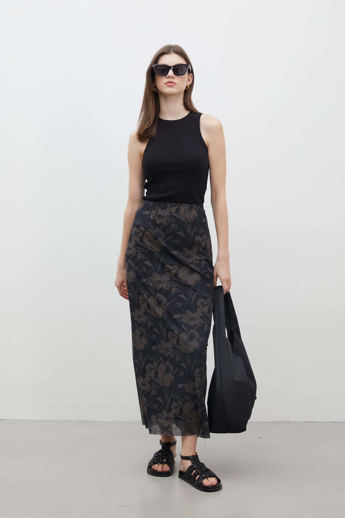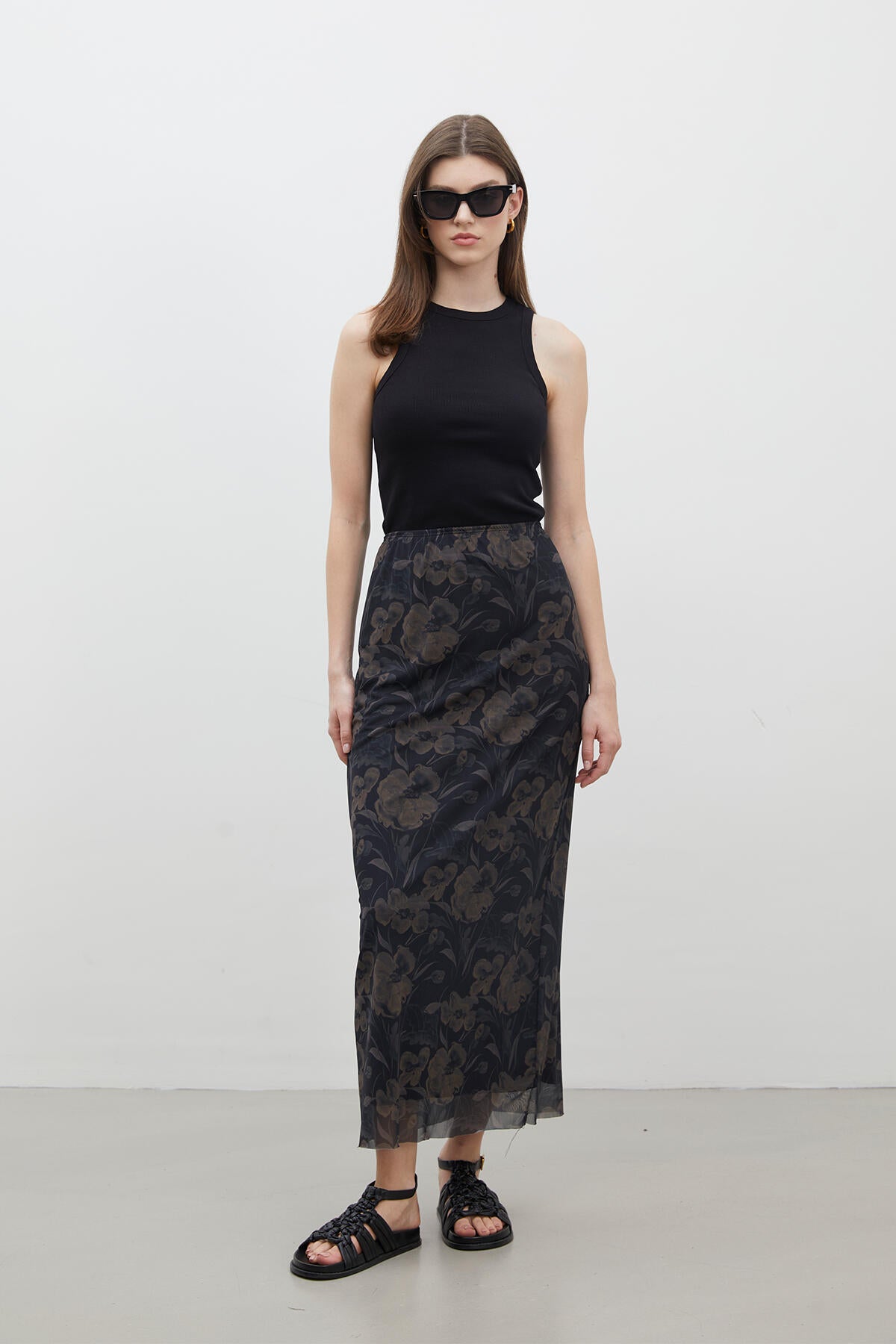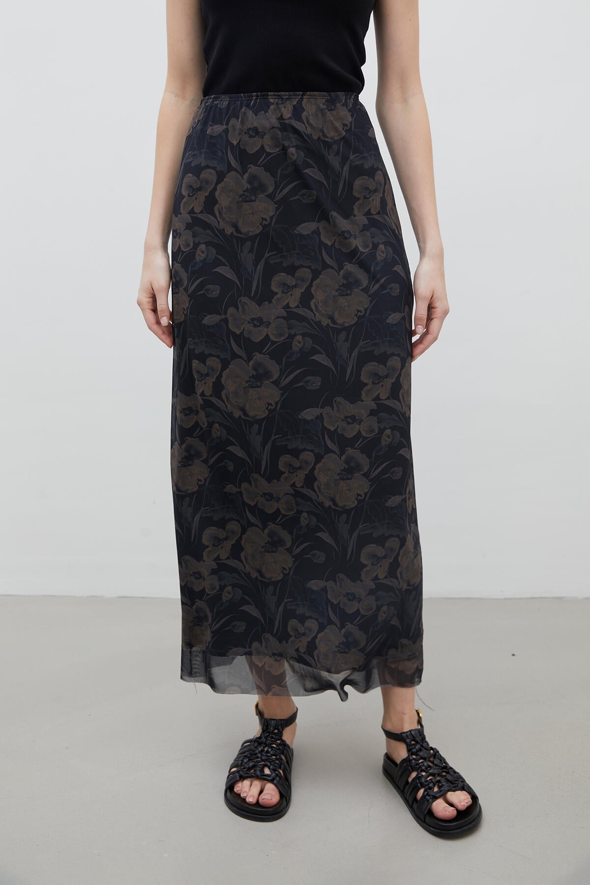 This full-length skirt sits gracefully at a high waist, secured with an elastic band for effortless wear. Lined for your comfort and crafted from beautifully patterned tulle fabric, it flows with every step you take.