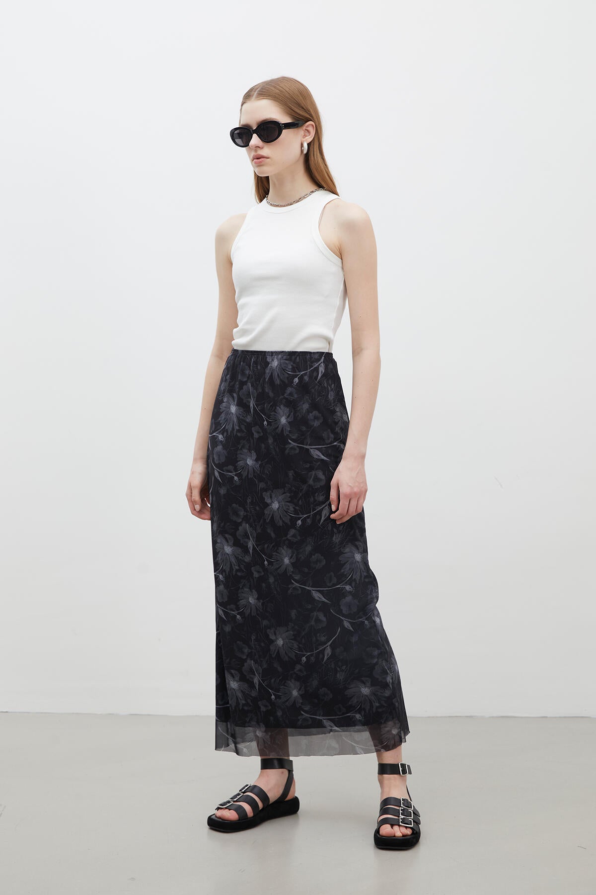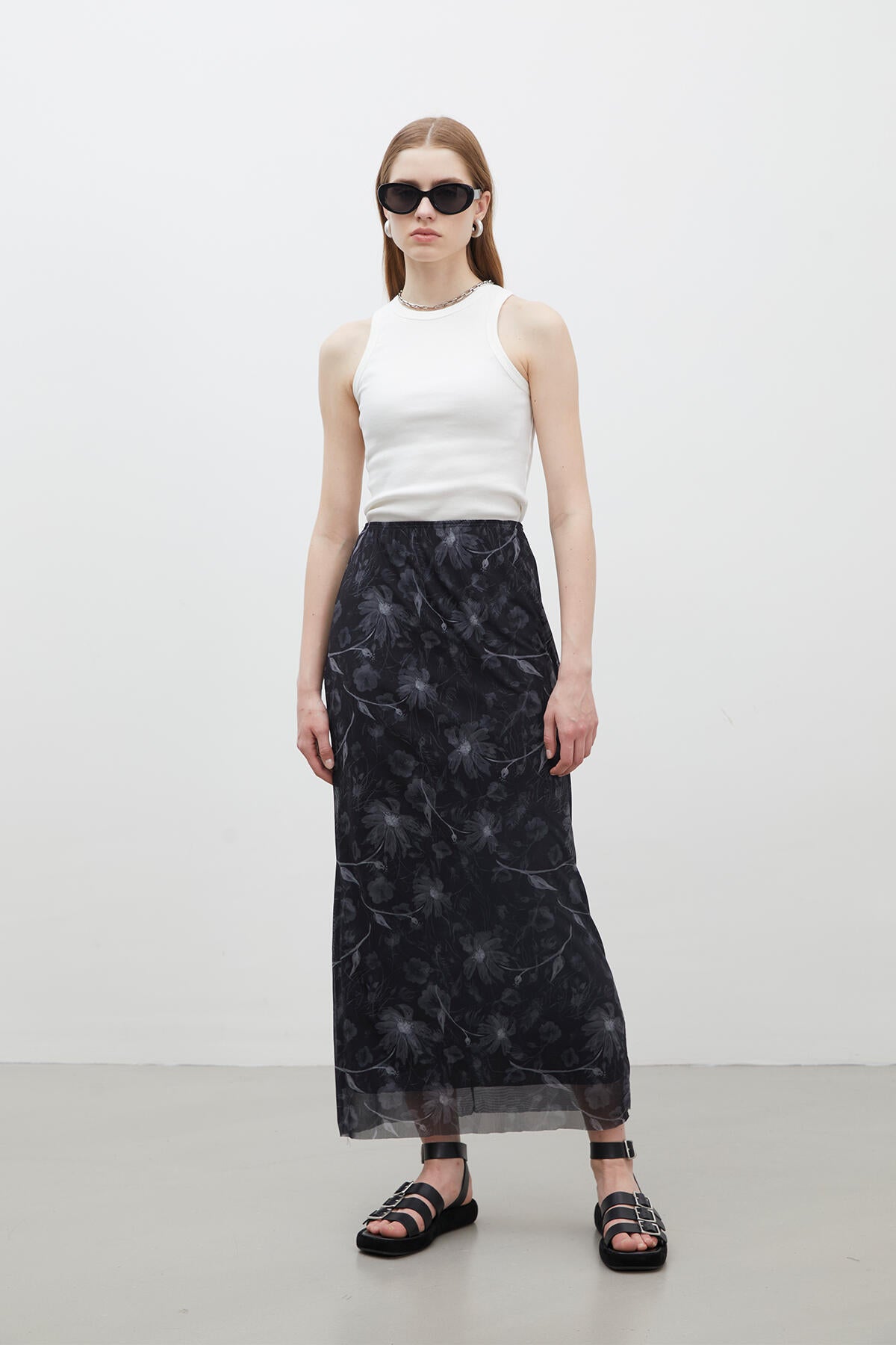 This full-length skirt sits gracefully at a high waist, secured with an elastic band for effortless wear. Lined for your comfort and crafted from beautifully patterned tulle fabric, it flows with every step you take.