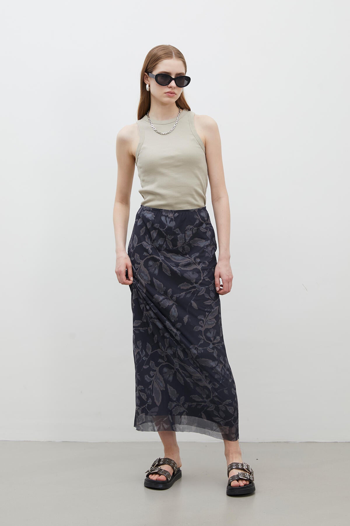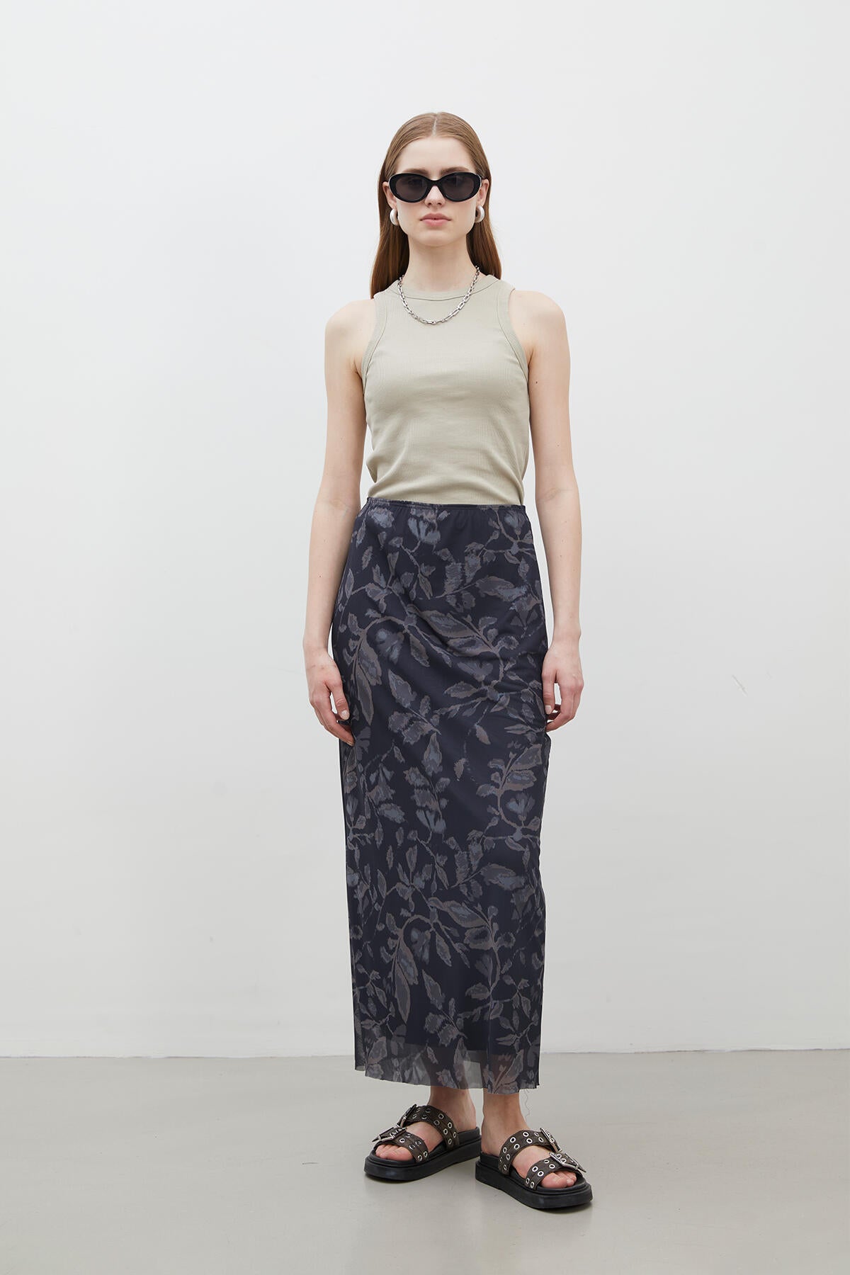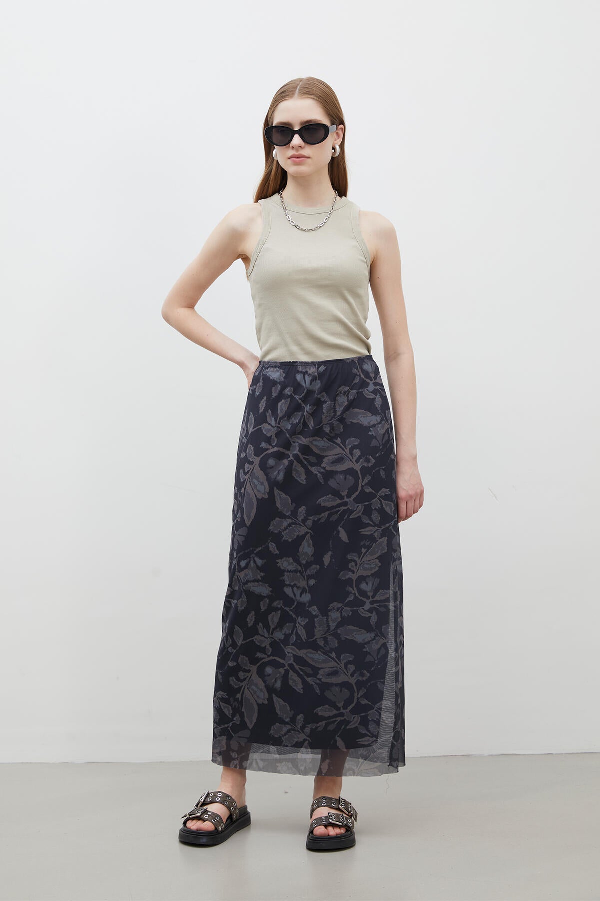 This full-length skirt sits gracefully at a high waist, secured with an elastic band for effortless wear. Lined for your comfort and crafted from beautifully patterned tulle fabric, it flows with every step you take.