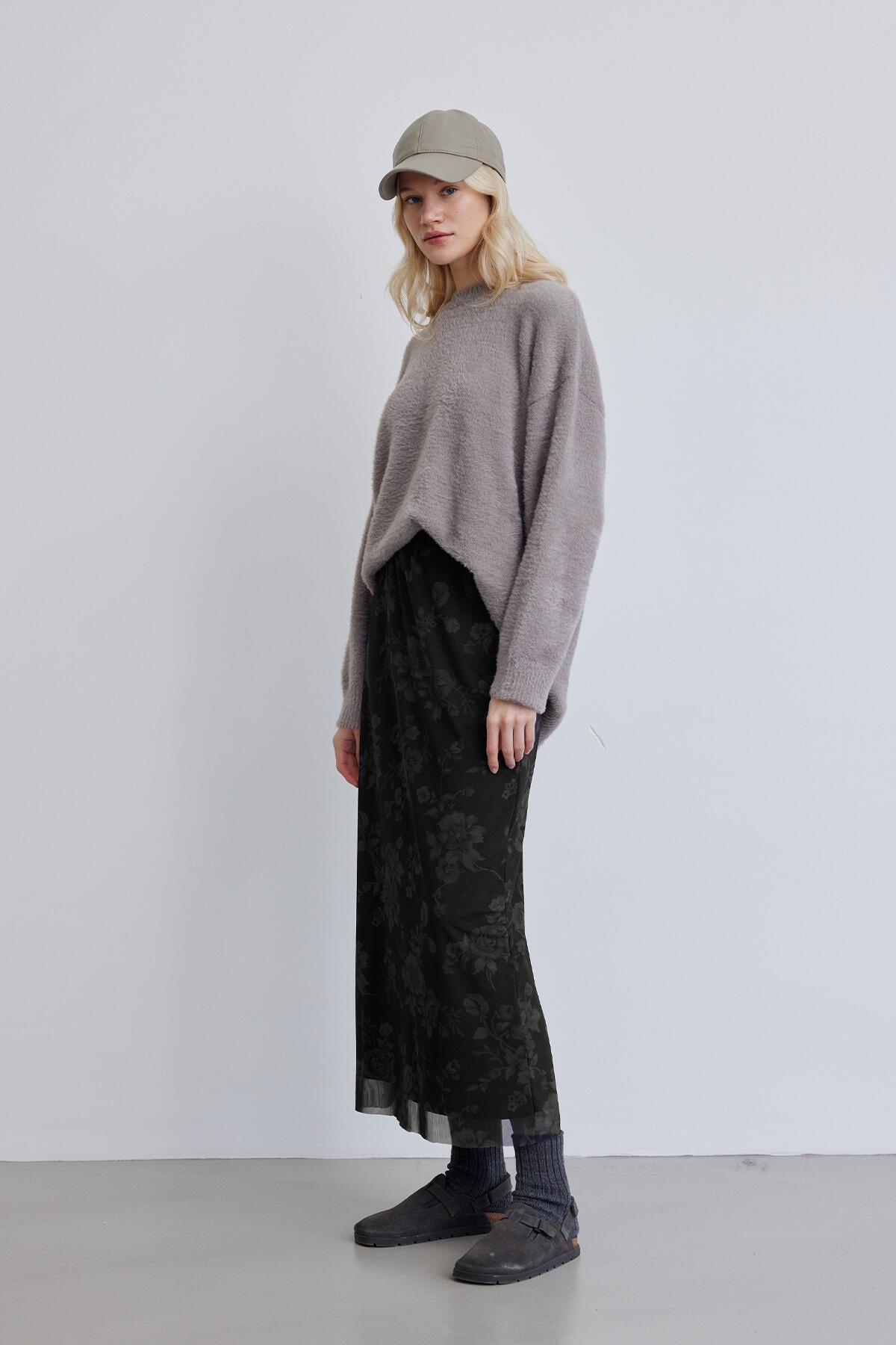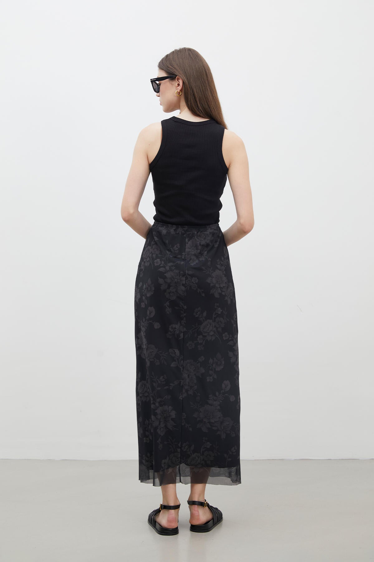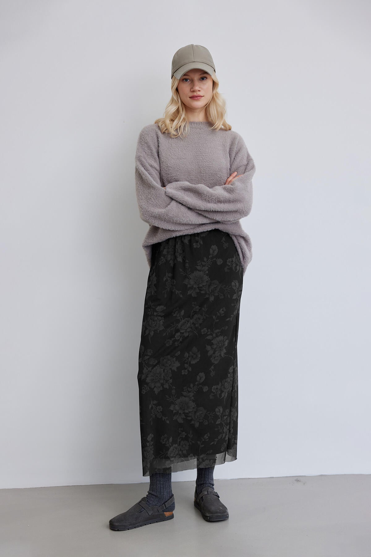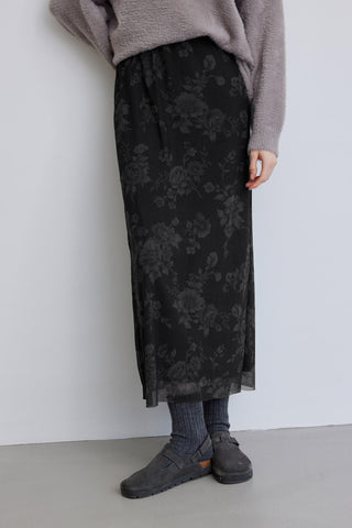 This full-length skirt sits gracefully at a high waist, secured with an elastic band for effortless wear. Lined for your comfort and crafted from beautifully patterned tulle fabric, it flows with every step you take.