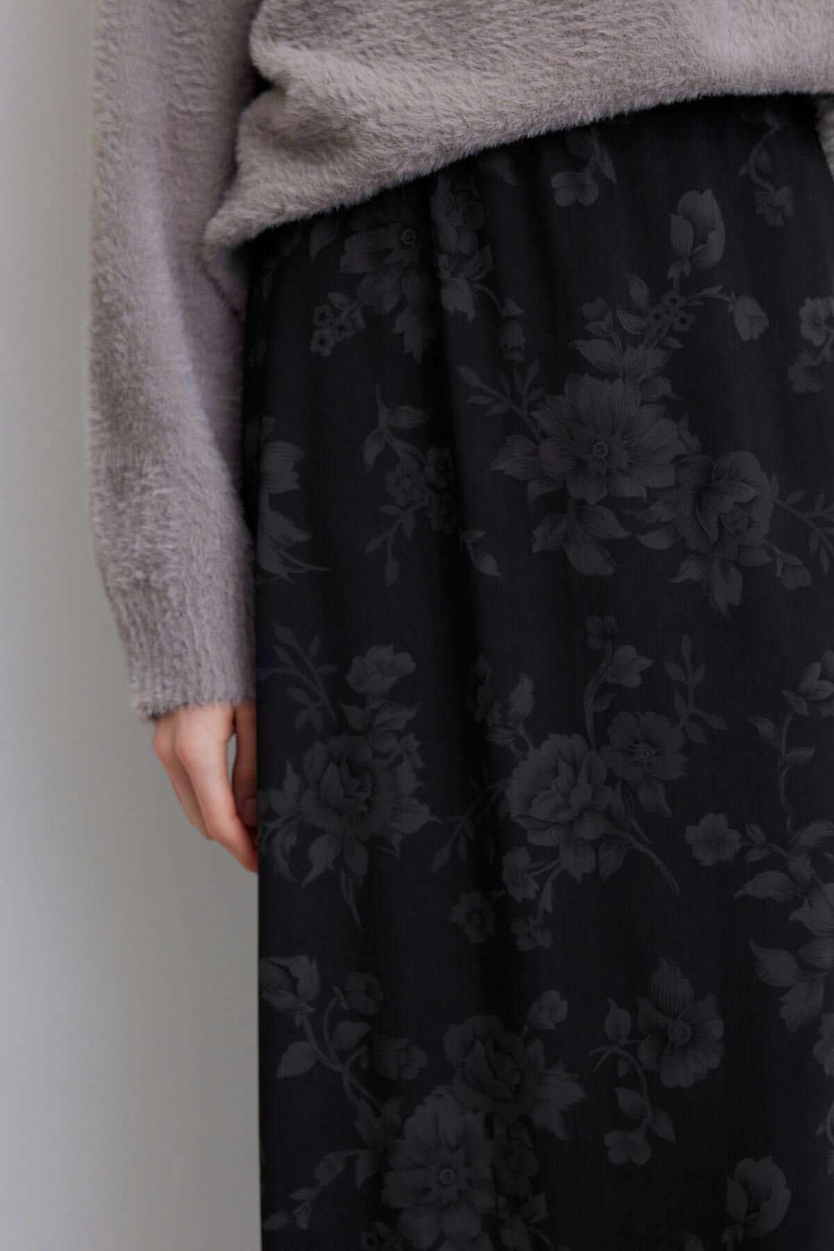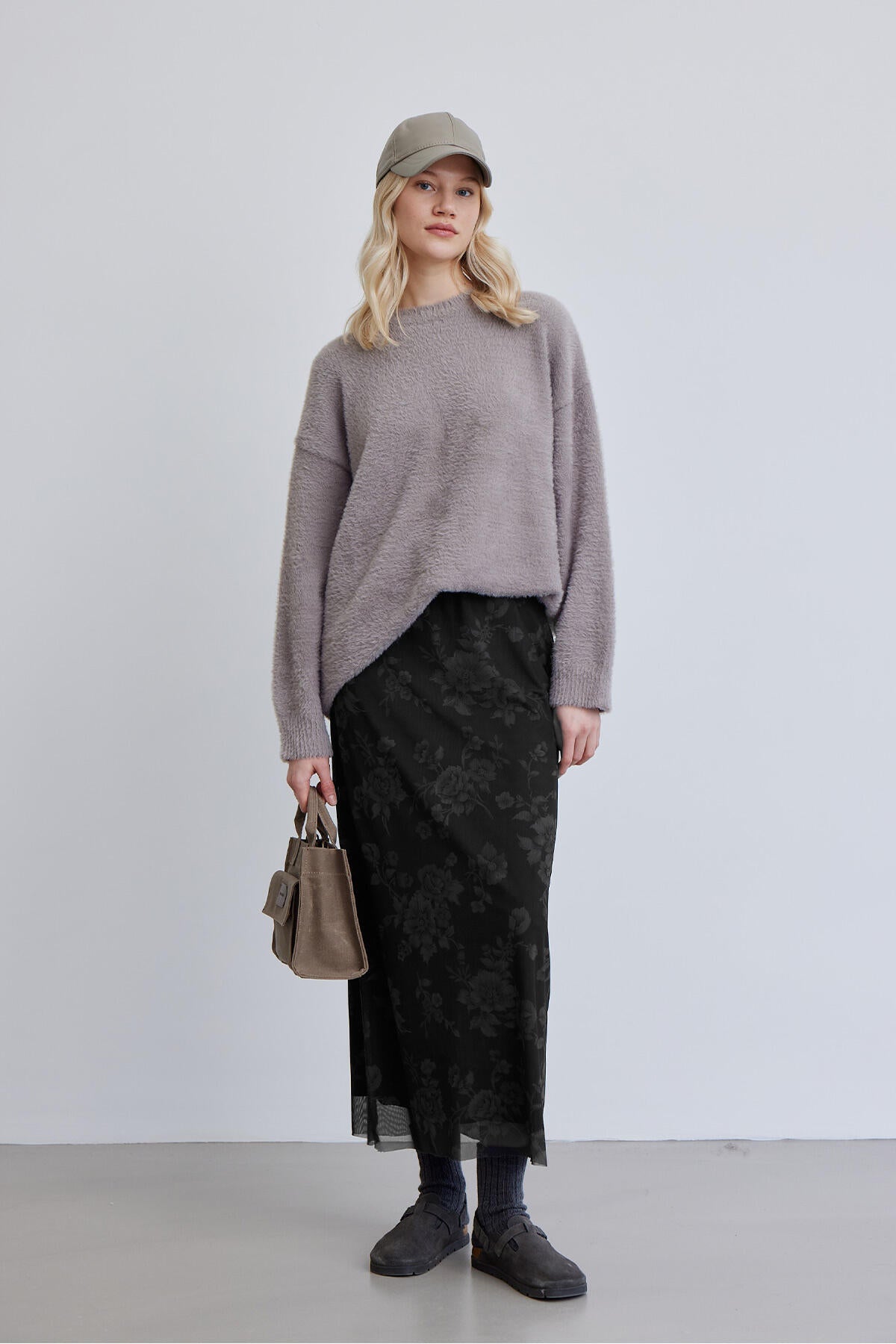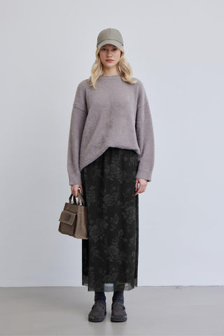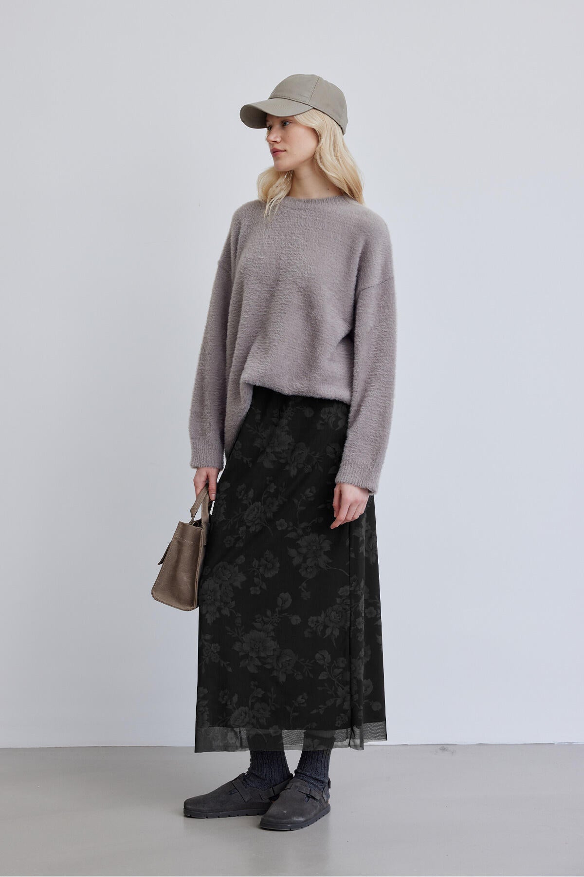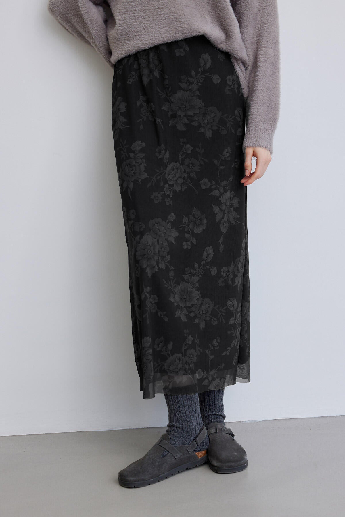 This full-length skirt sits gracefully at a high waist, secured with an elastic band for effortless wear. Lined for your comfort and crafted from beautifully patterned tulle fabric, it flows with every step you take.