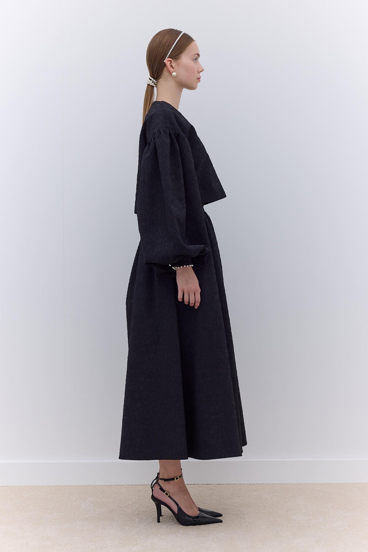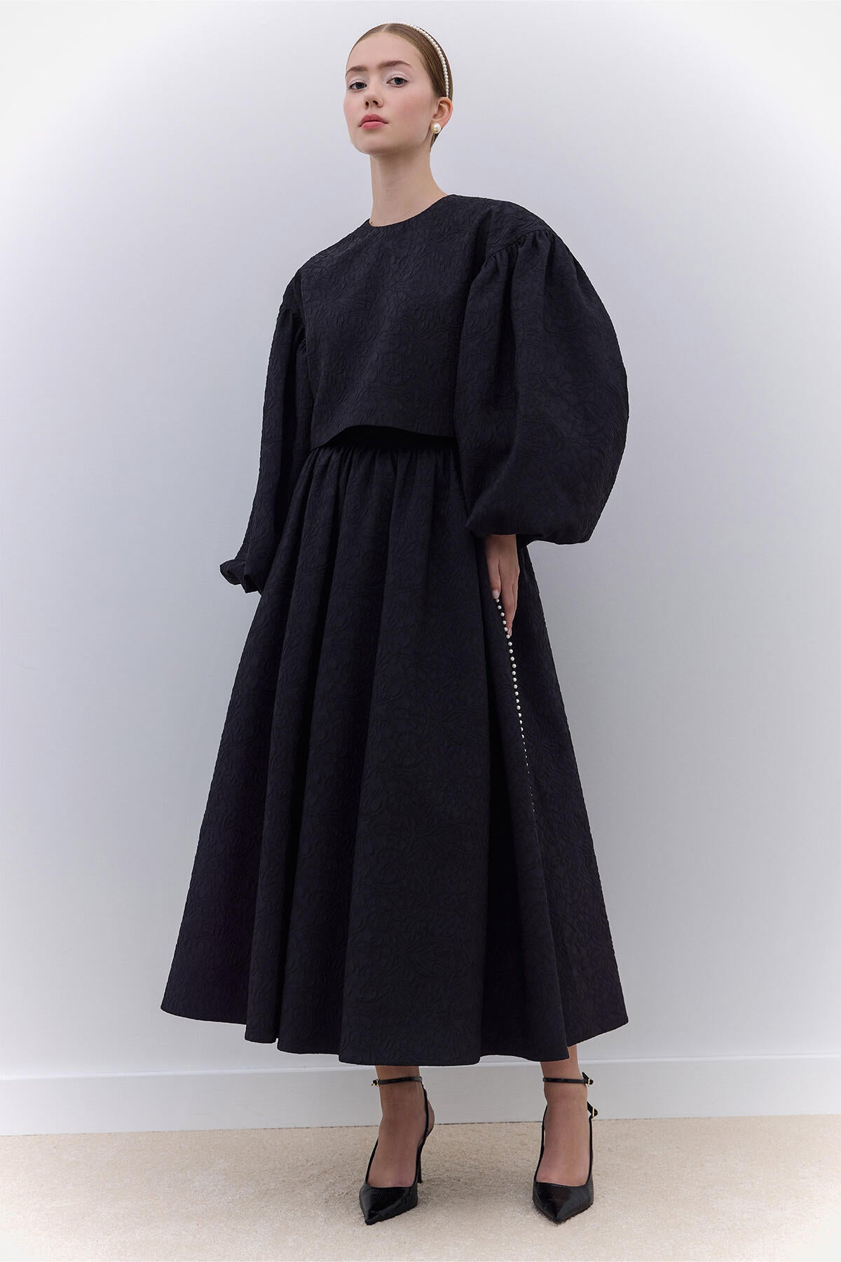 A blouse made from jacquard embossed fabric, featuring a fully lined interior, concealed zipper closure, dropped shoulders, and gathered details. The balloon sleeves are finished with pearl detailing at the cuffs.