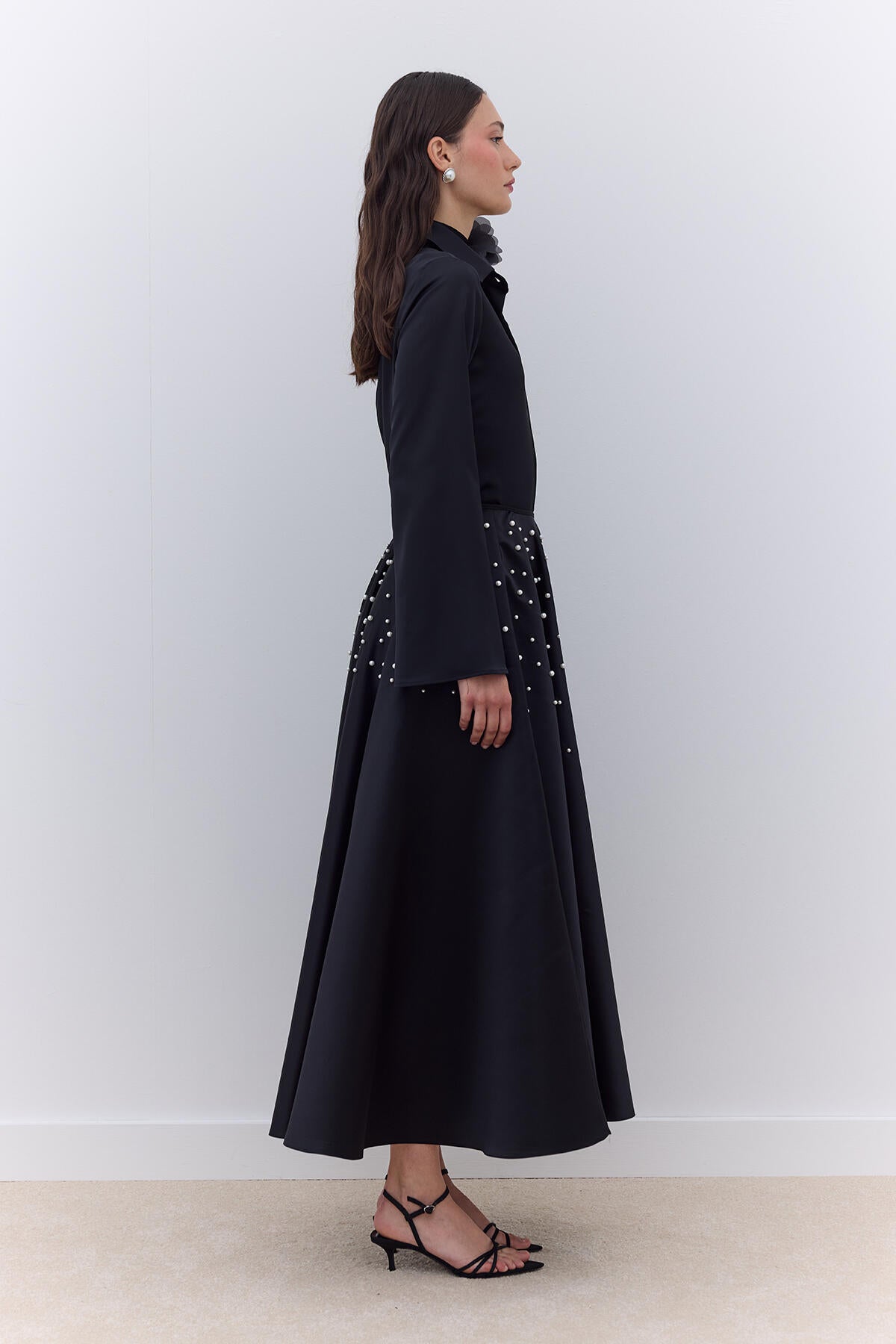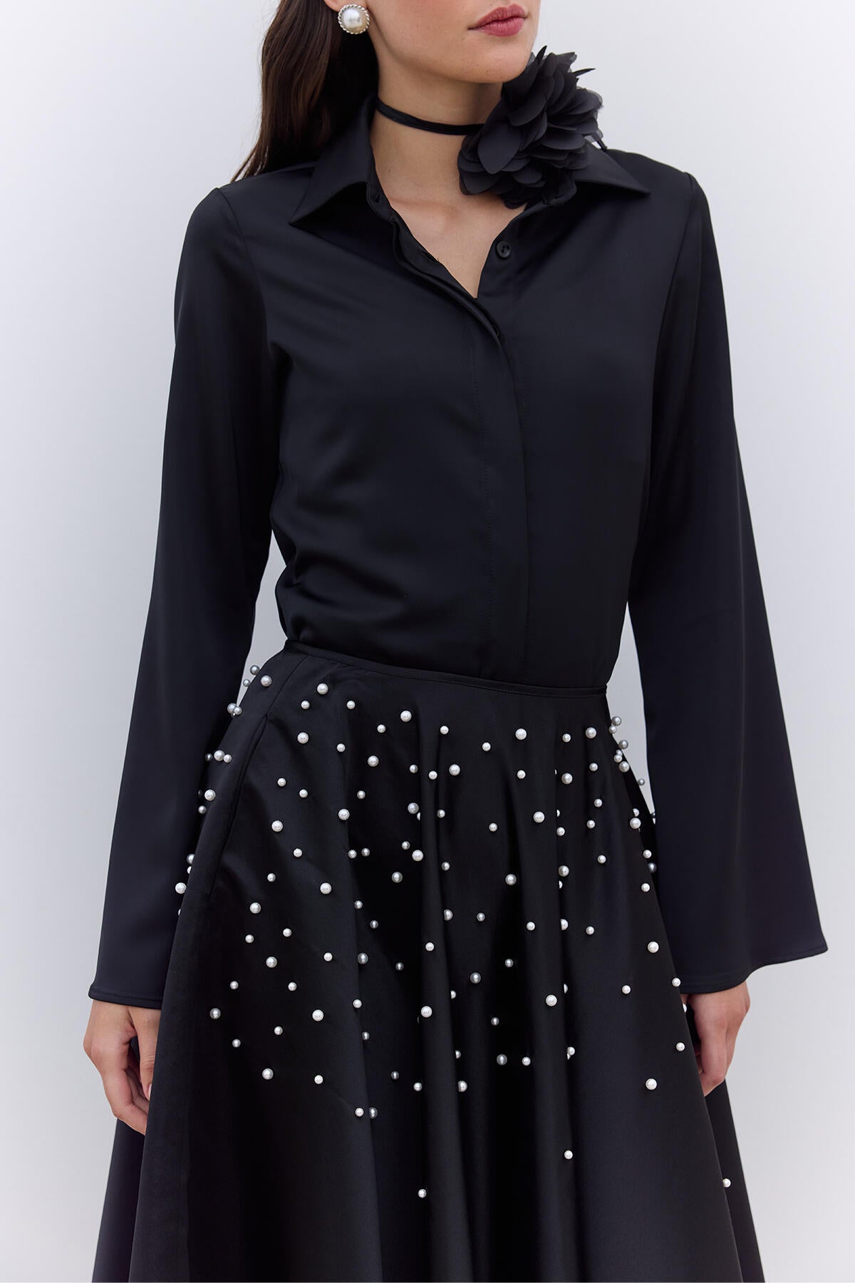 Pearl Embellished Flared Evening Skirt Black
