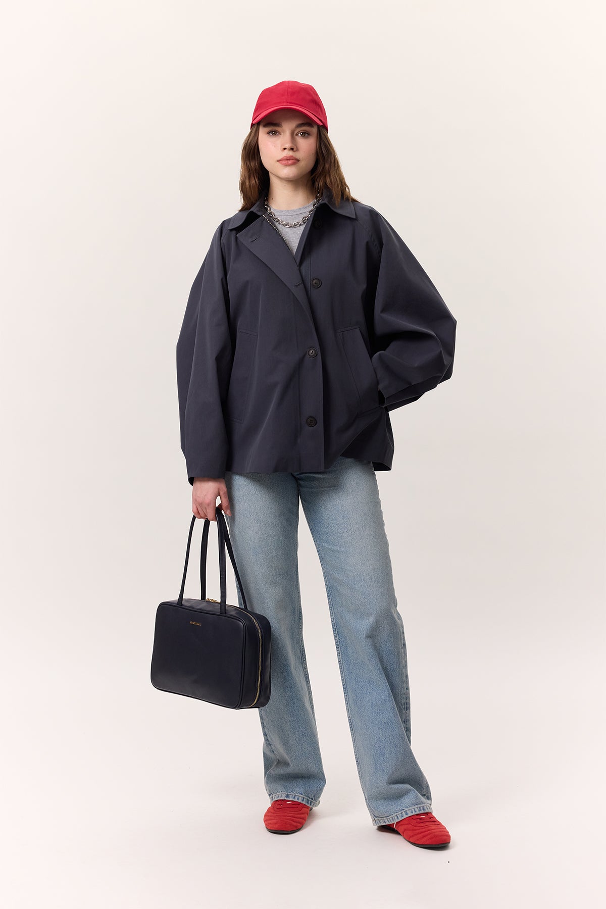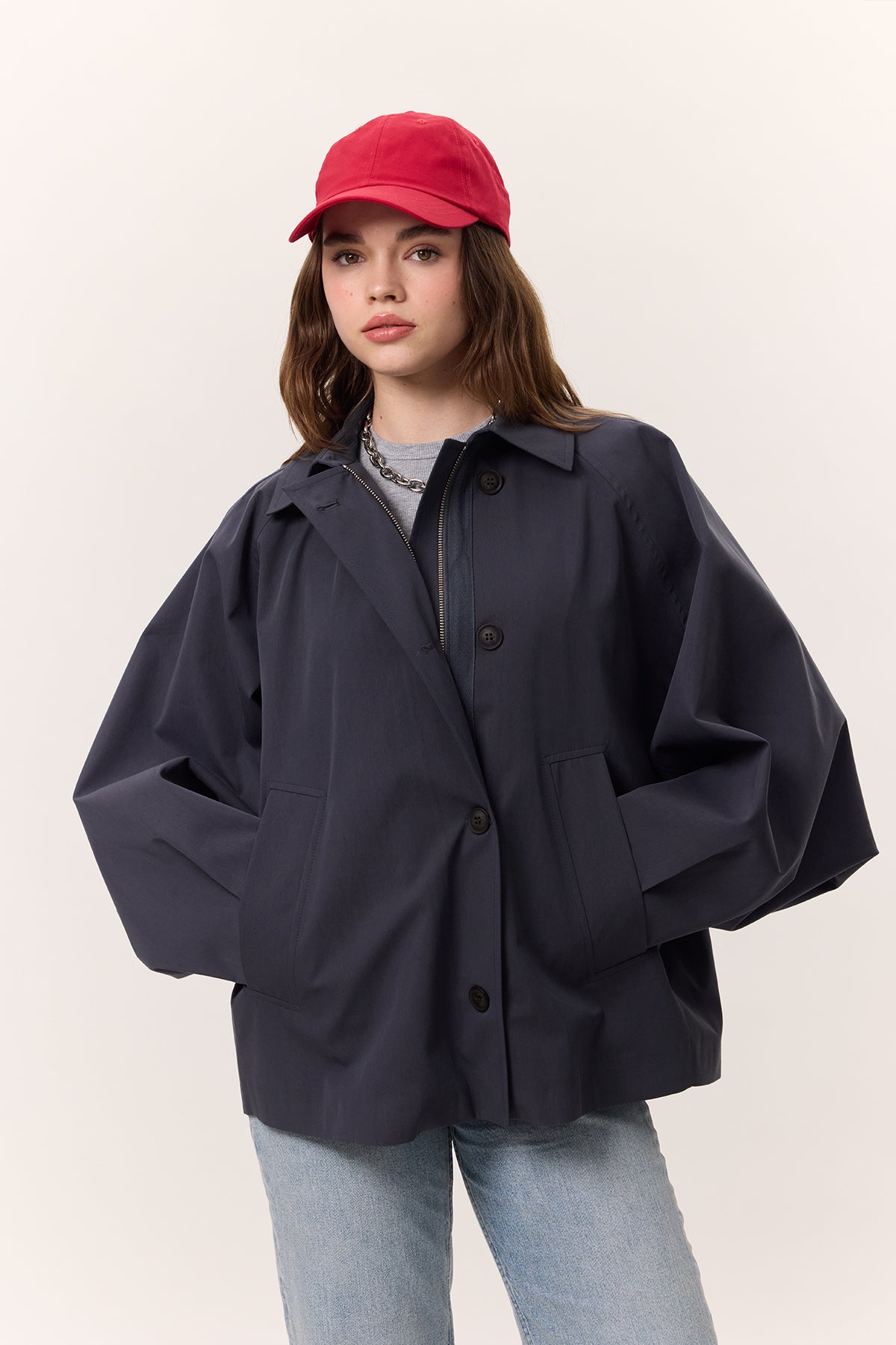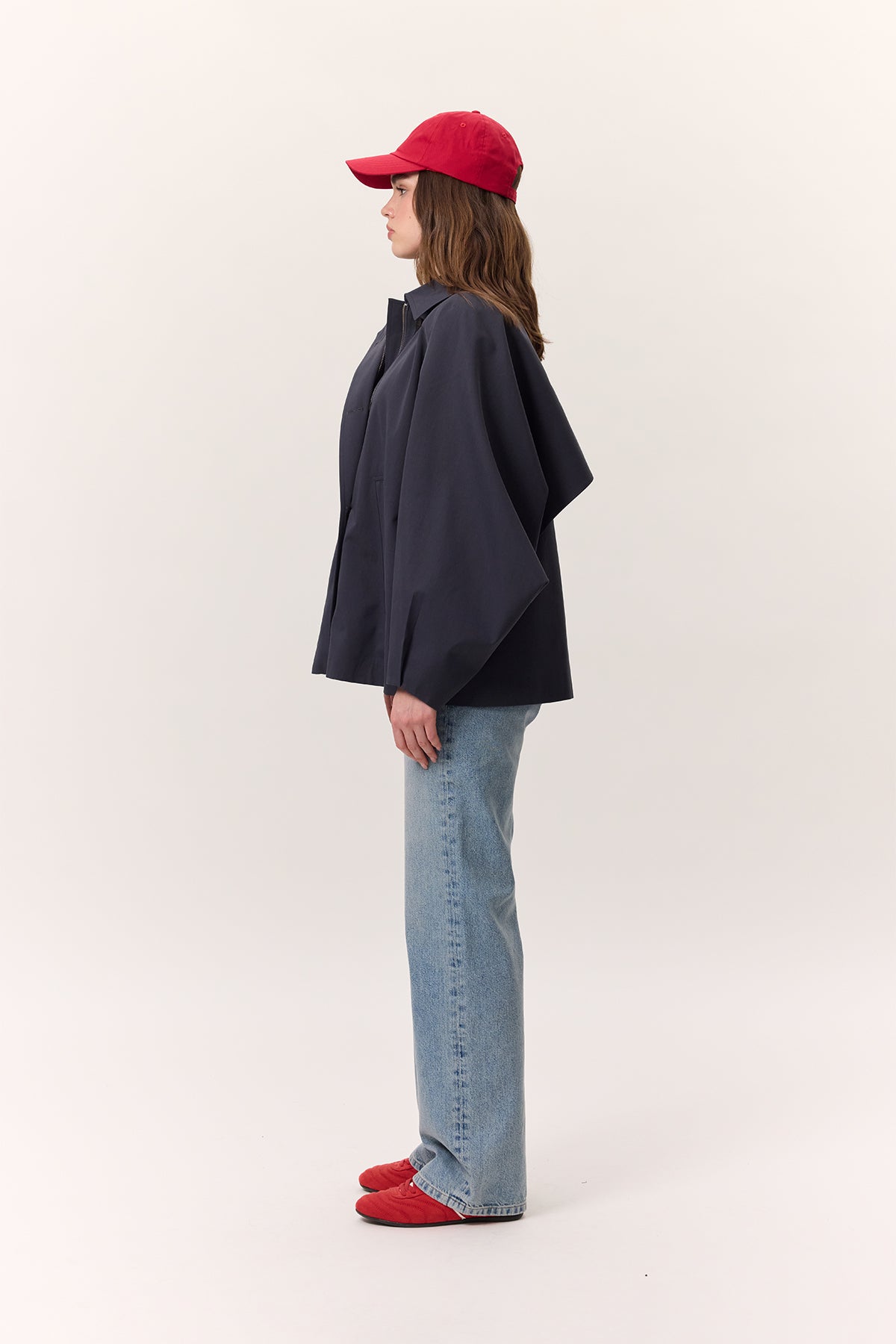 Cape Sleeve Cropped Trench Coat Navy Blue