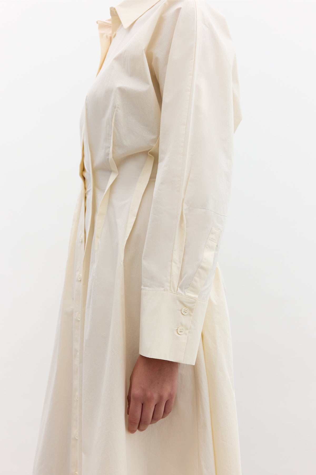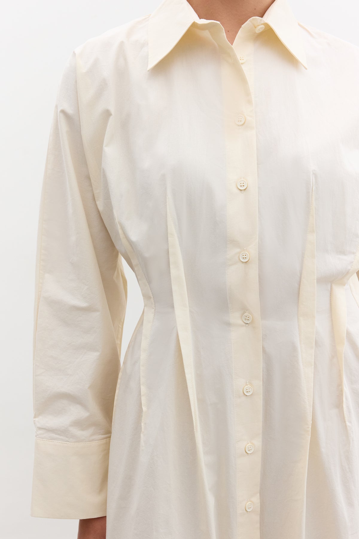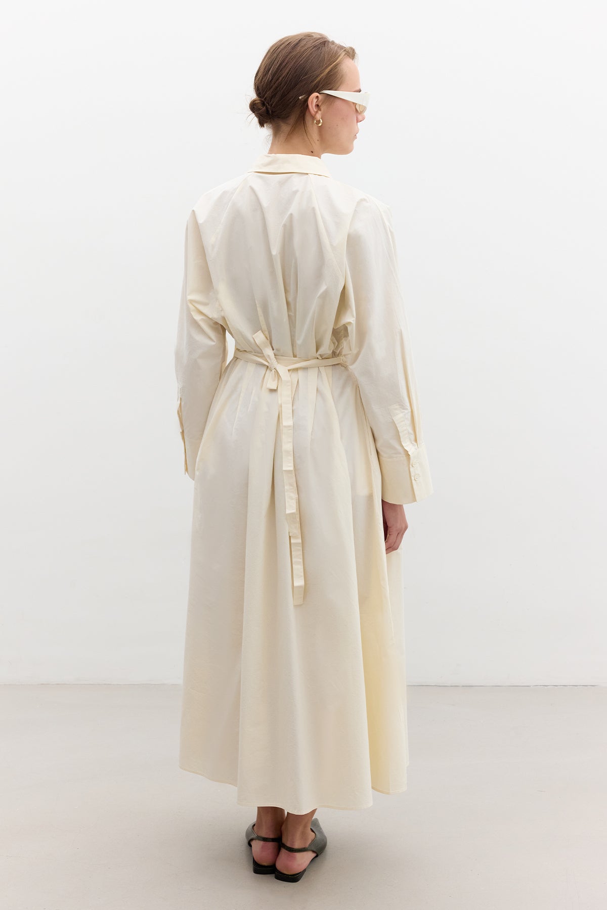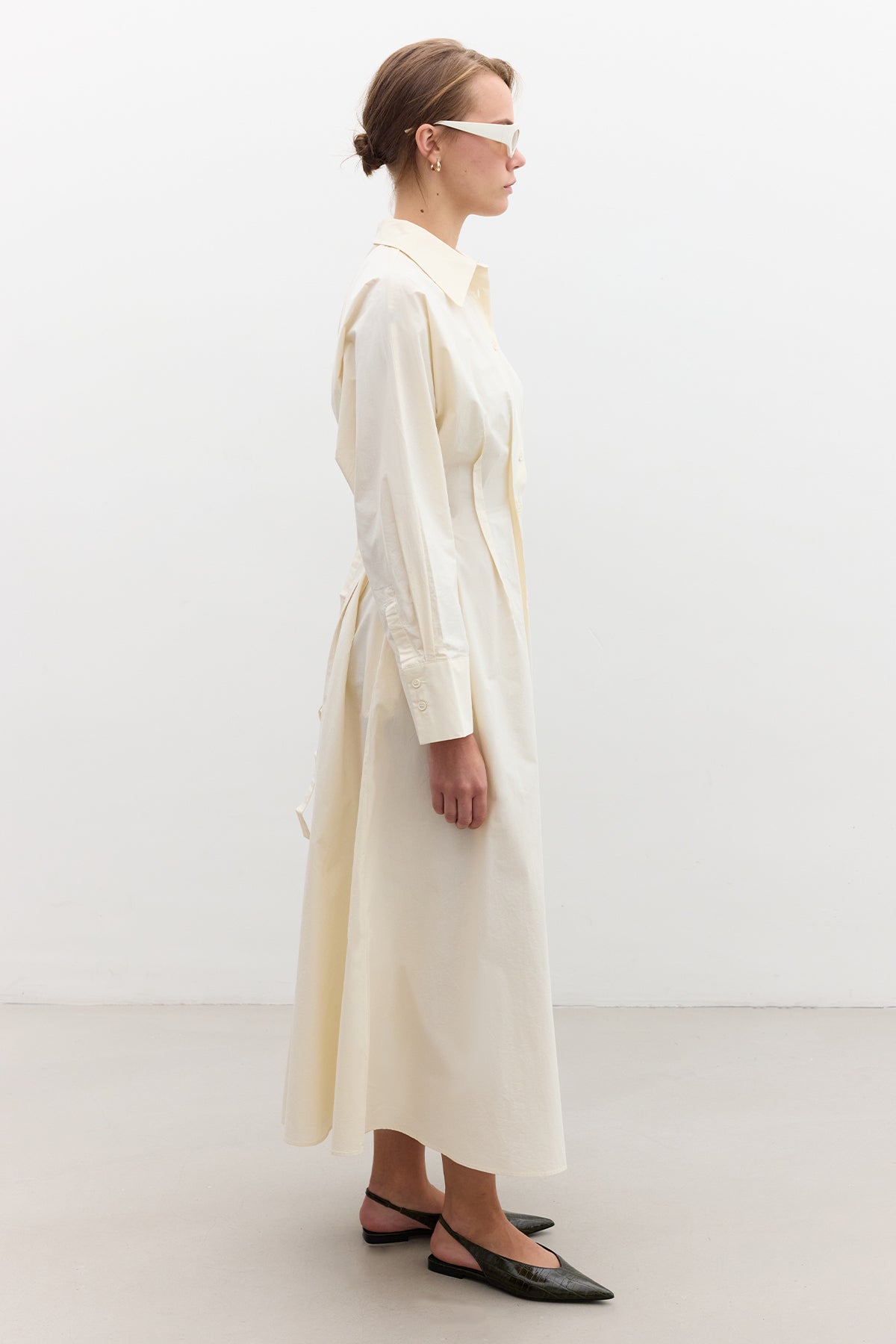 Shirt collar, button fastening, fitted at the waist, belted, long sleeves with high cuffs, flared skirt.