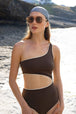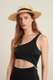 A masterpiece of asymmetrical design and contrasting elegance, this one-shoulder piece is accentuated with striking contrast piping, offering a modern twist to classic swimwear. Made from stretchy swim fabric, it ensures both comfort and a flattering fit. Fully lined for added security, with the upper part featuring removable padding for customizable support. The unique asymmetrical cut not only enhances your silhouette but also adds an artistic touch to your swimwear look.