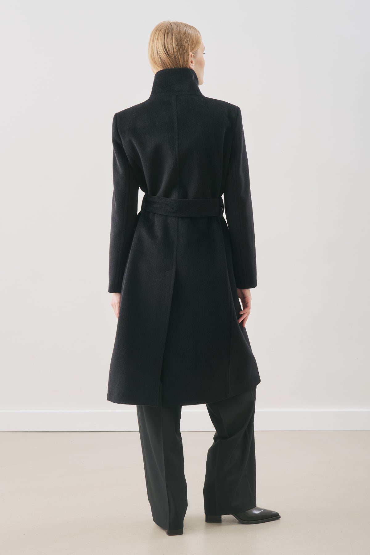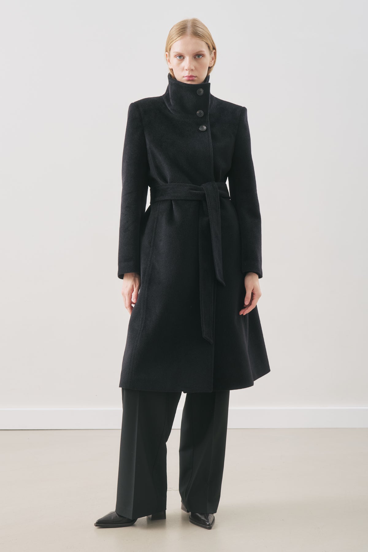 Normal kalıp,yüksek yakalı,beli bağlamalı,kuşak detaylı,uzun kol,diz alt boy,düğme kapamalı.