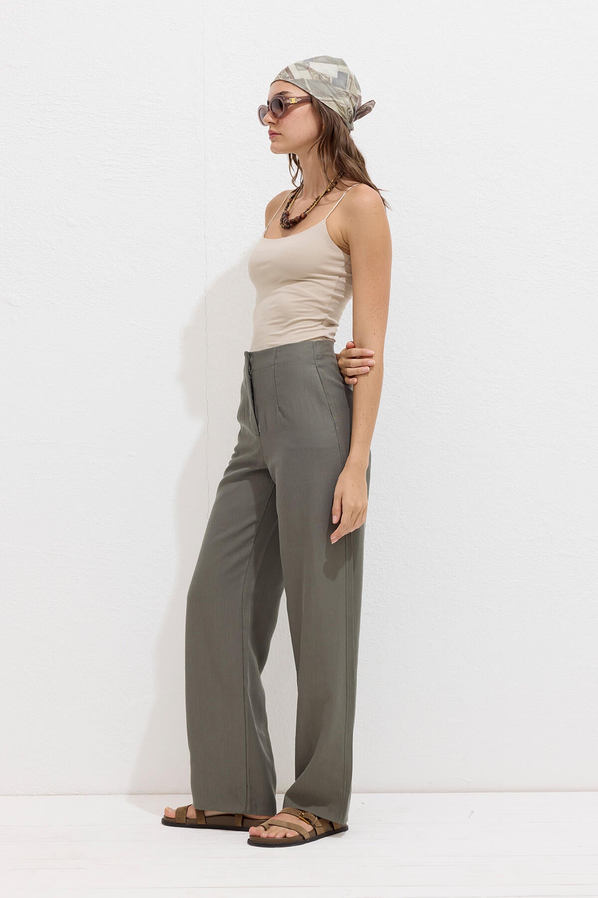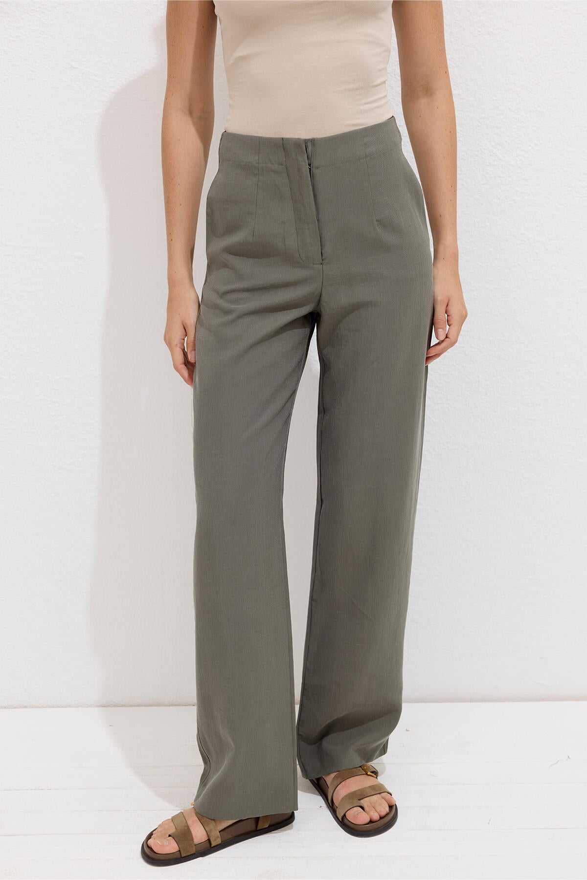 High-waisted, side pockets, zipper closure, straight leg, full length.