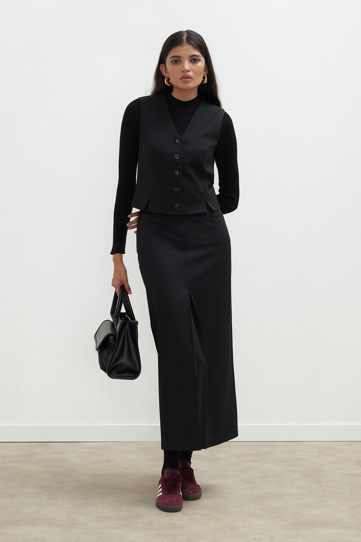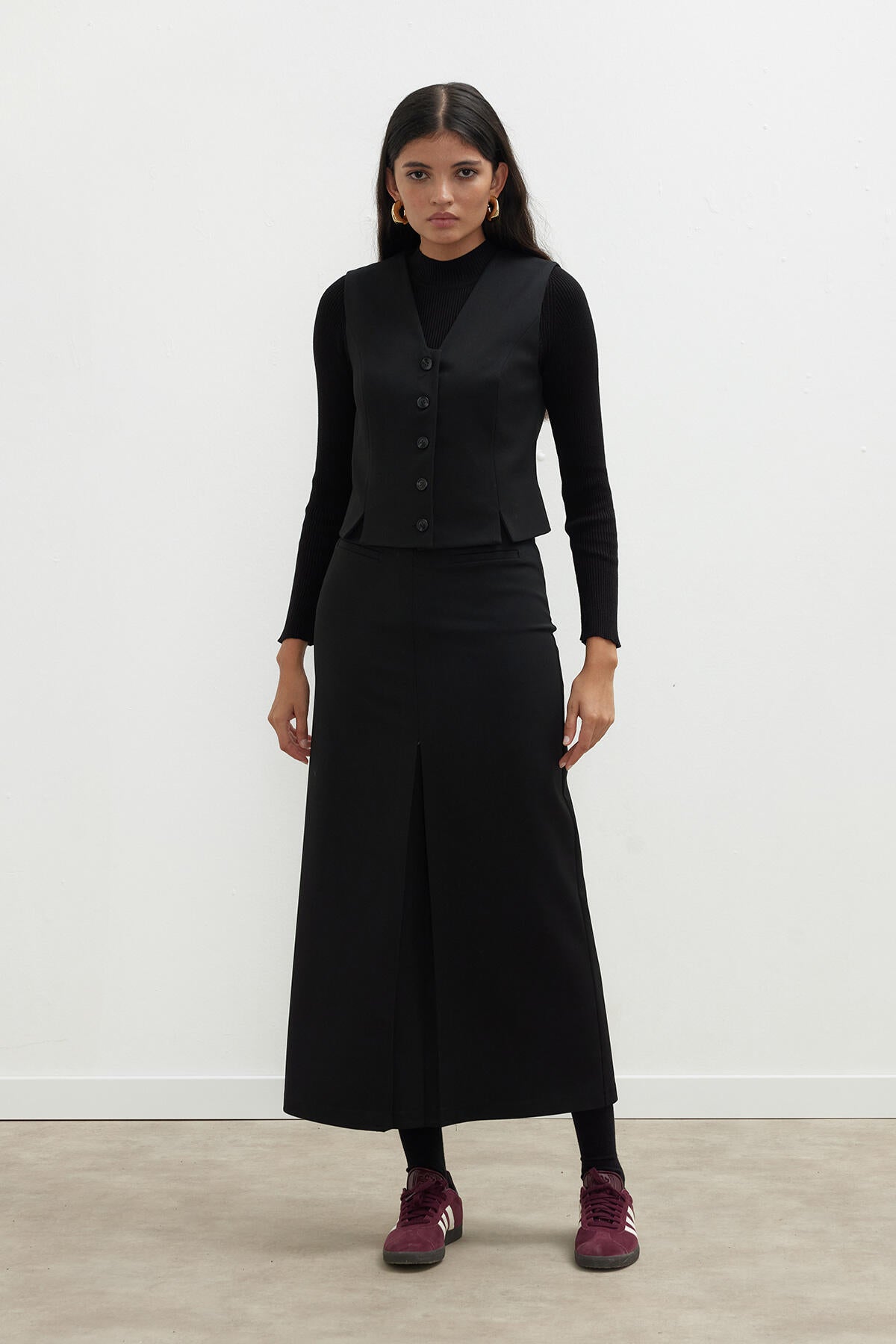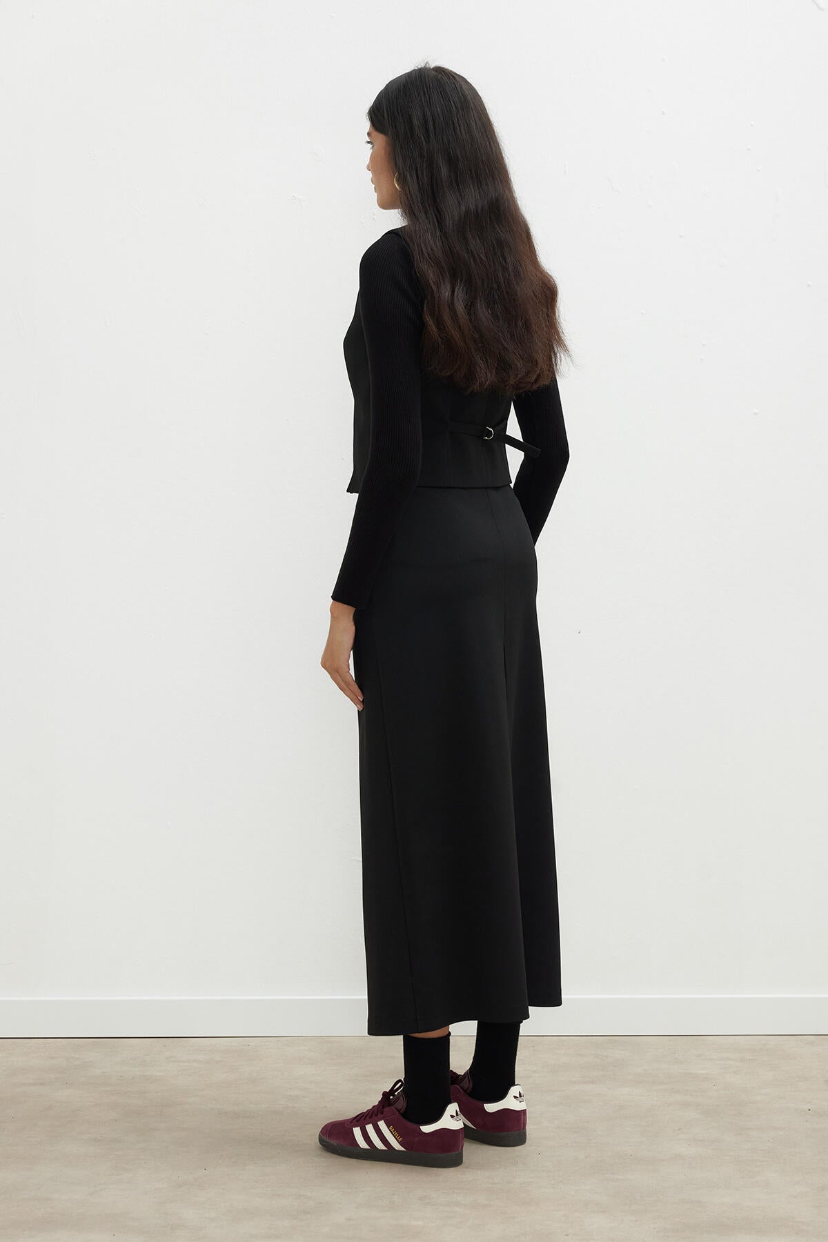 Designed with meticulous pleat detailing, this skirt features ornamental pockets that add a touch of sophistication to its streamlined pencil silhouette. Crafted to fall gracefully at ankle length, it's made from a fabric blend enriched with viscose, offering both comfort and a flattering drape.