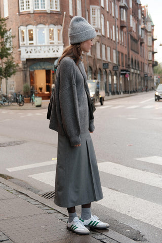 Designed with meticulous pleat detailing, this skirt features ornamental pockets that add a touch of sophistication to its streamlined pencil silhouette. Crafted to fall gracefully at ankle length, it's made from a fabric blend enriched with viscose, offering both comfort and a flattering drape.