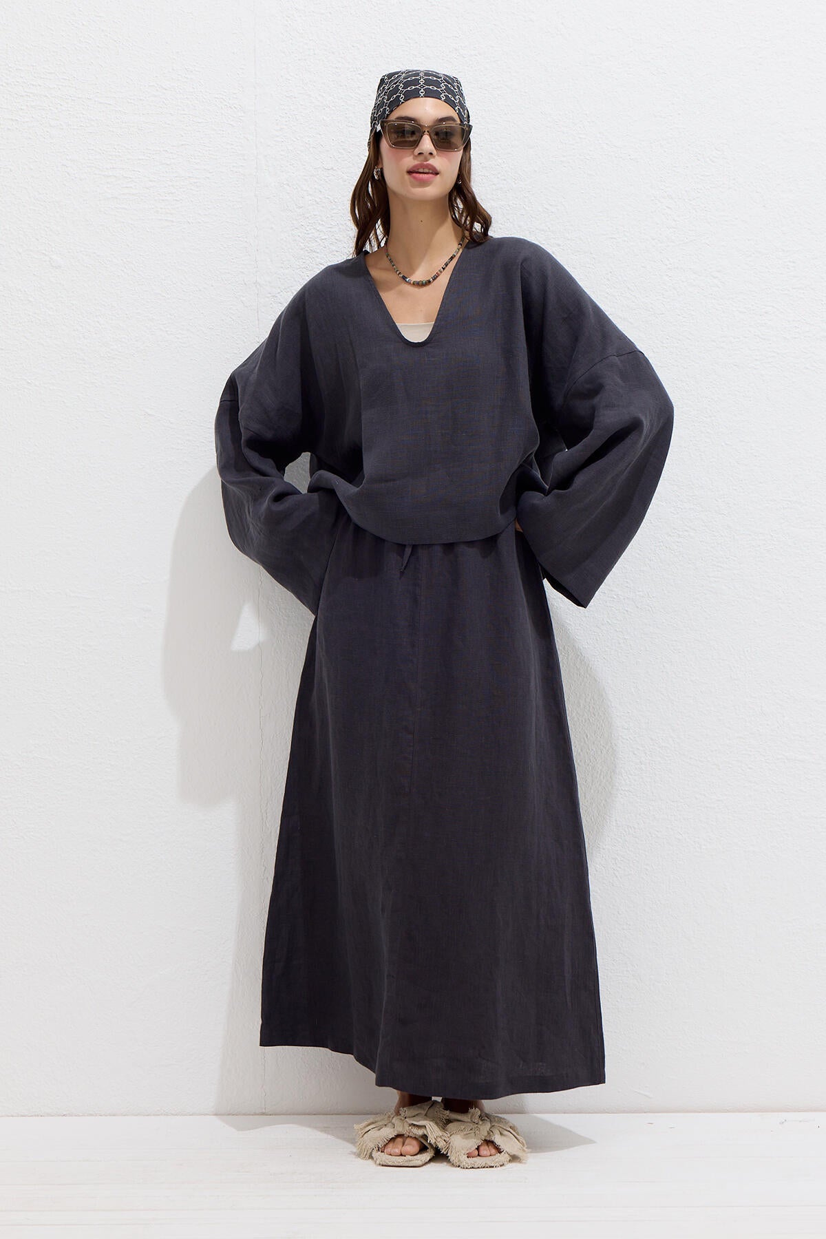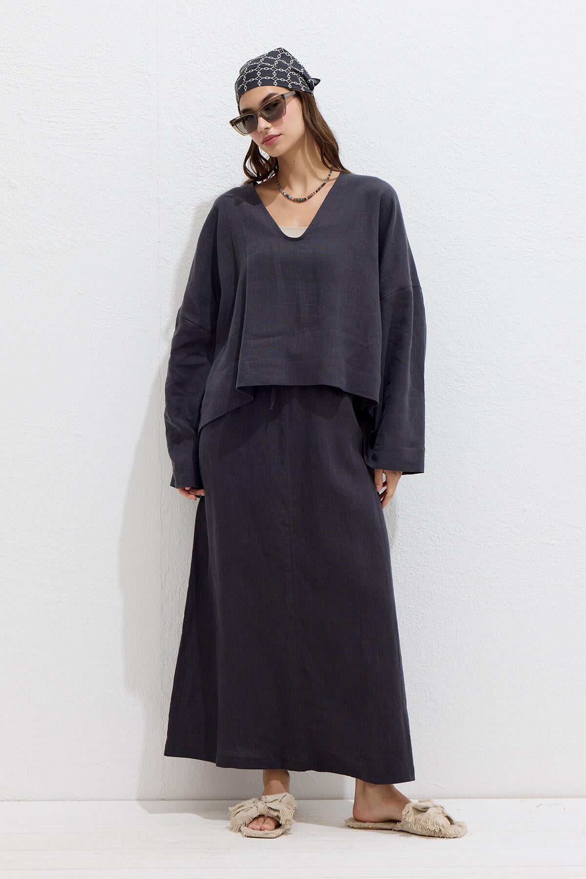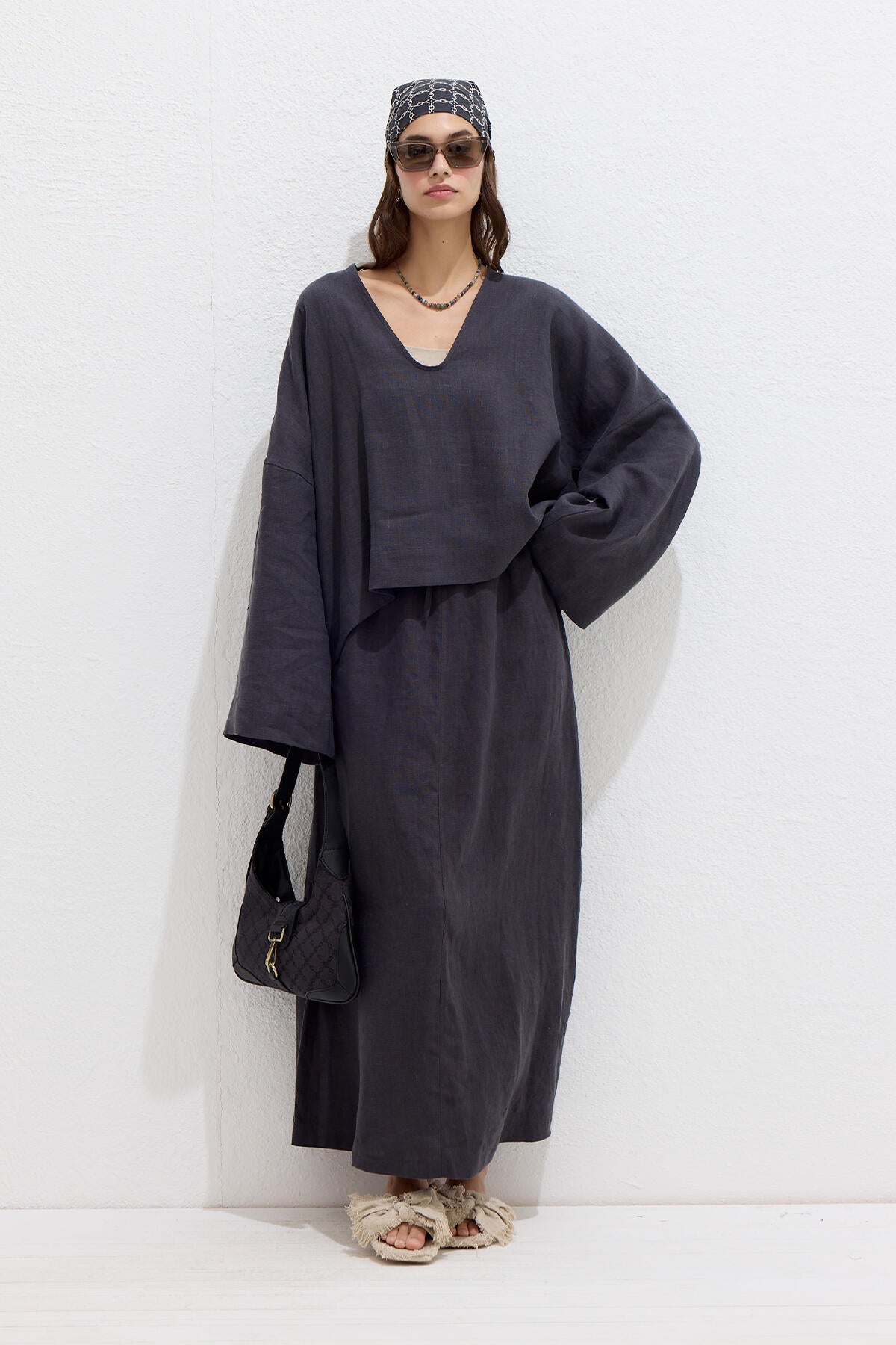 Dropped shoulder, long sleeves, V-neck, with a tie detail at the back.
