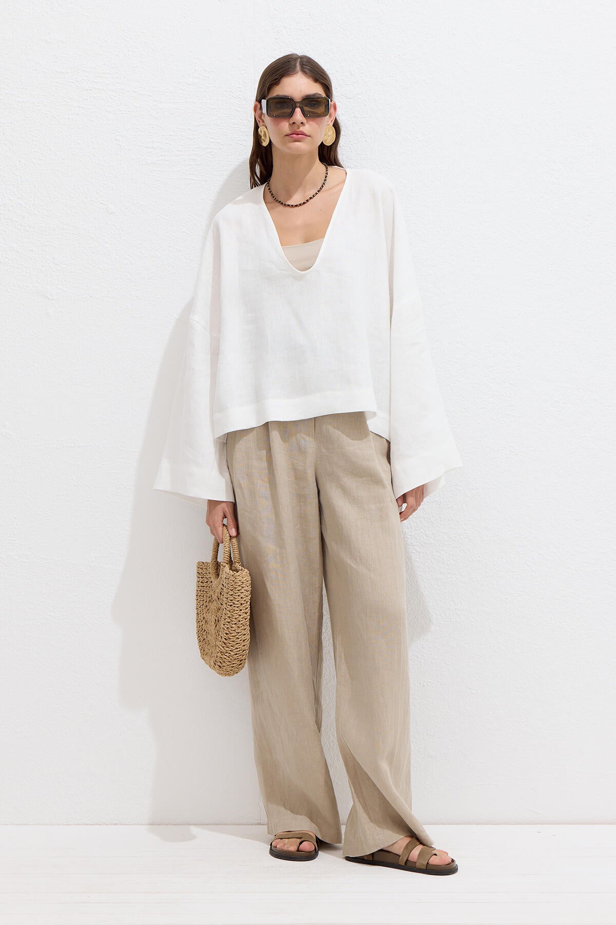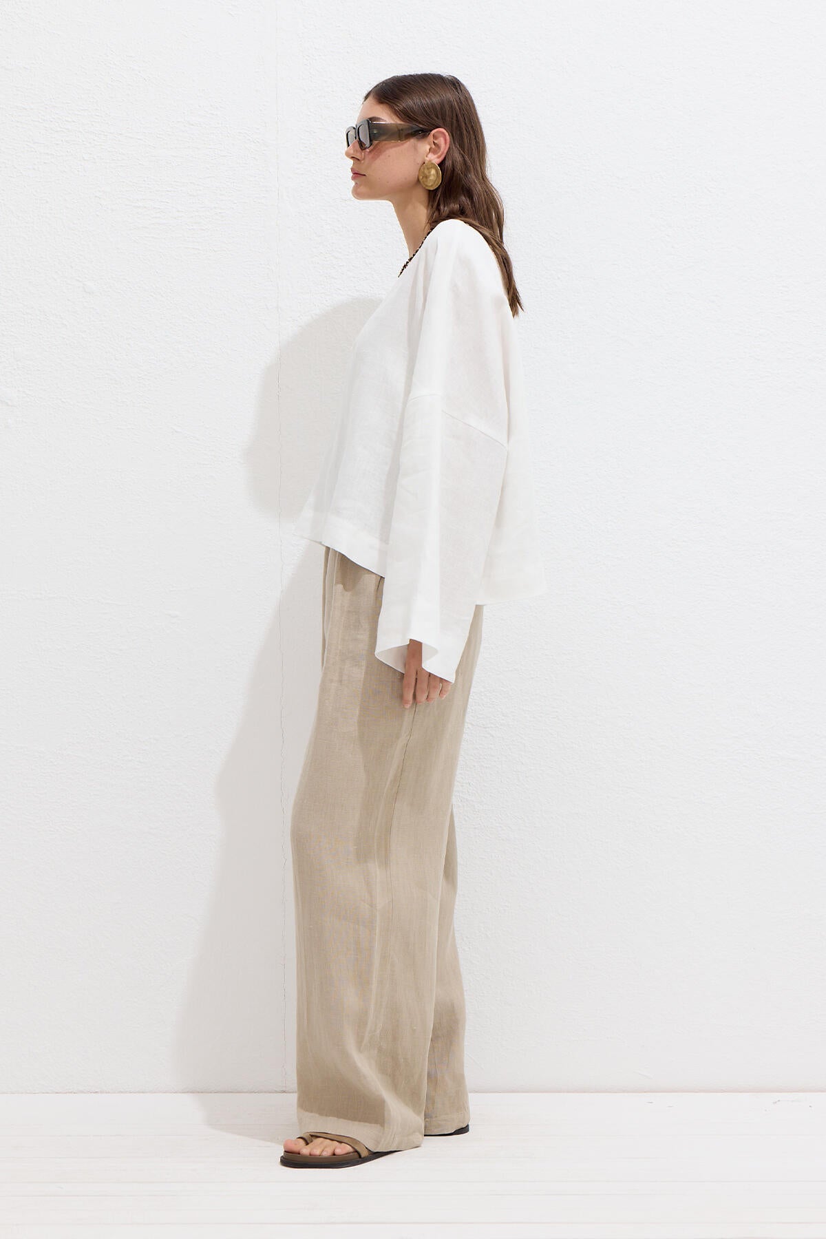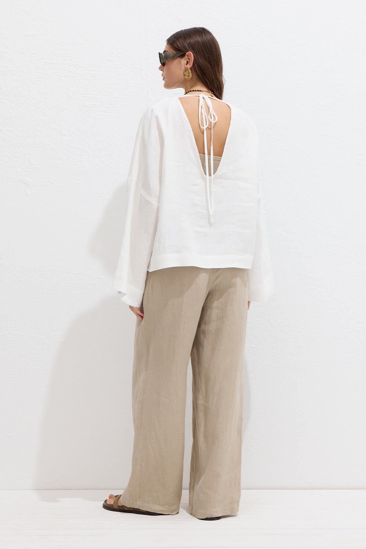 Dropped shoulder, long sleeves, V-neck, with a tie detail at the back.