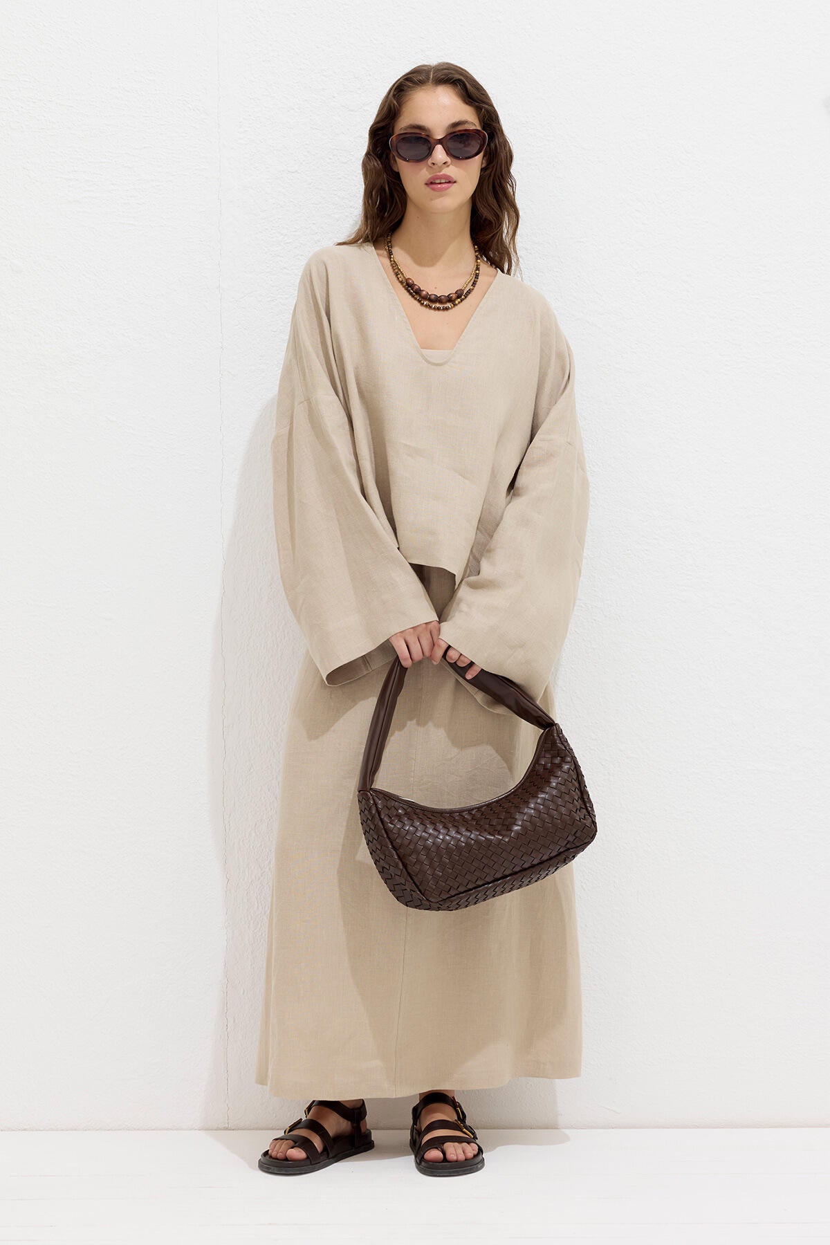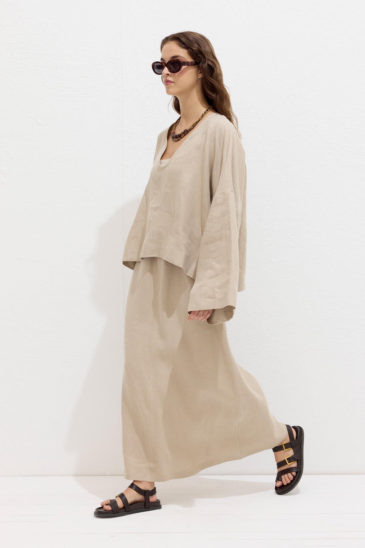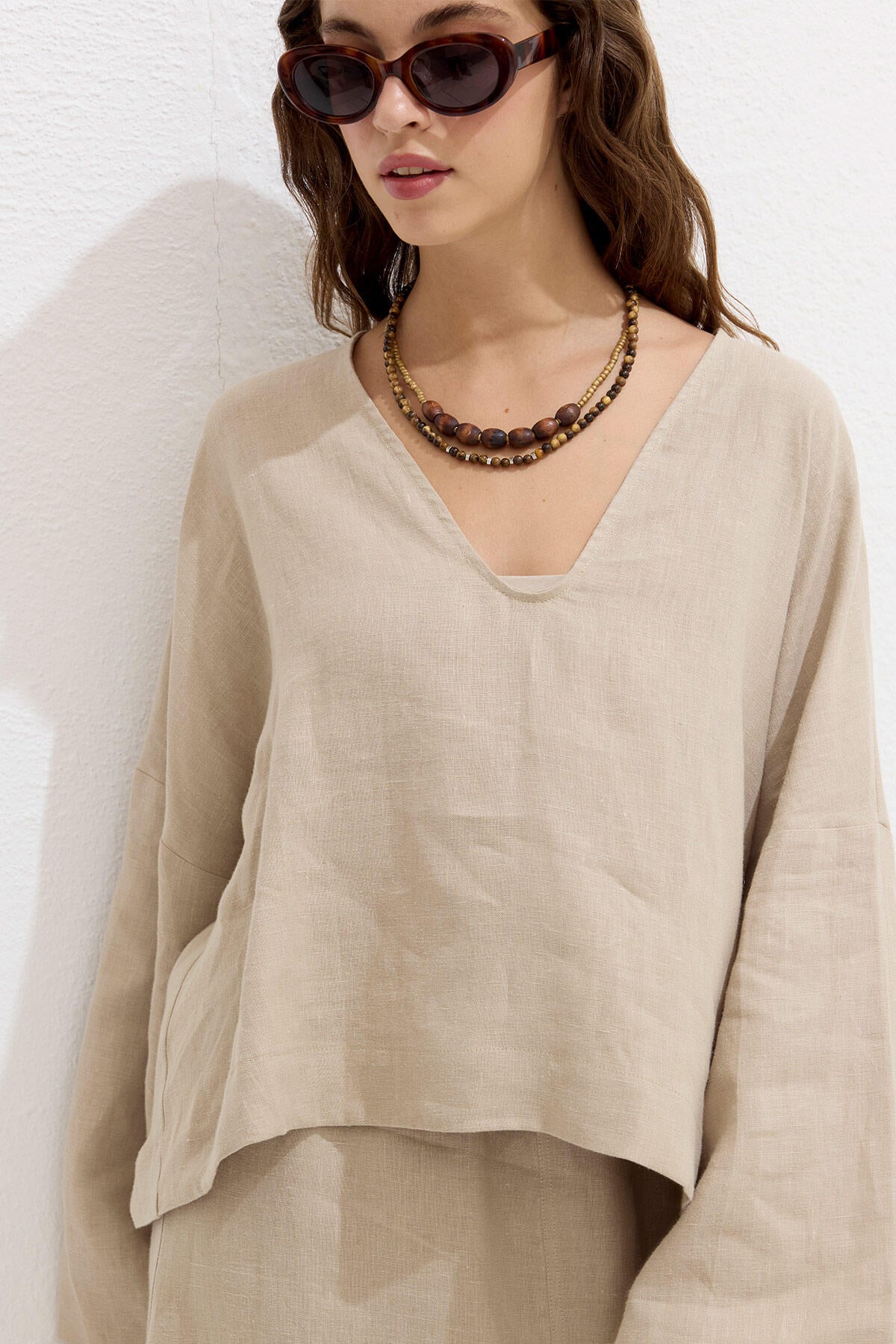 Dropped shoulder, long sleeves, V-neck, with a tie detail at the back.