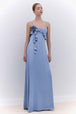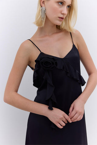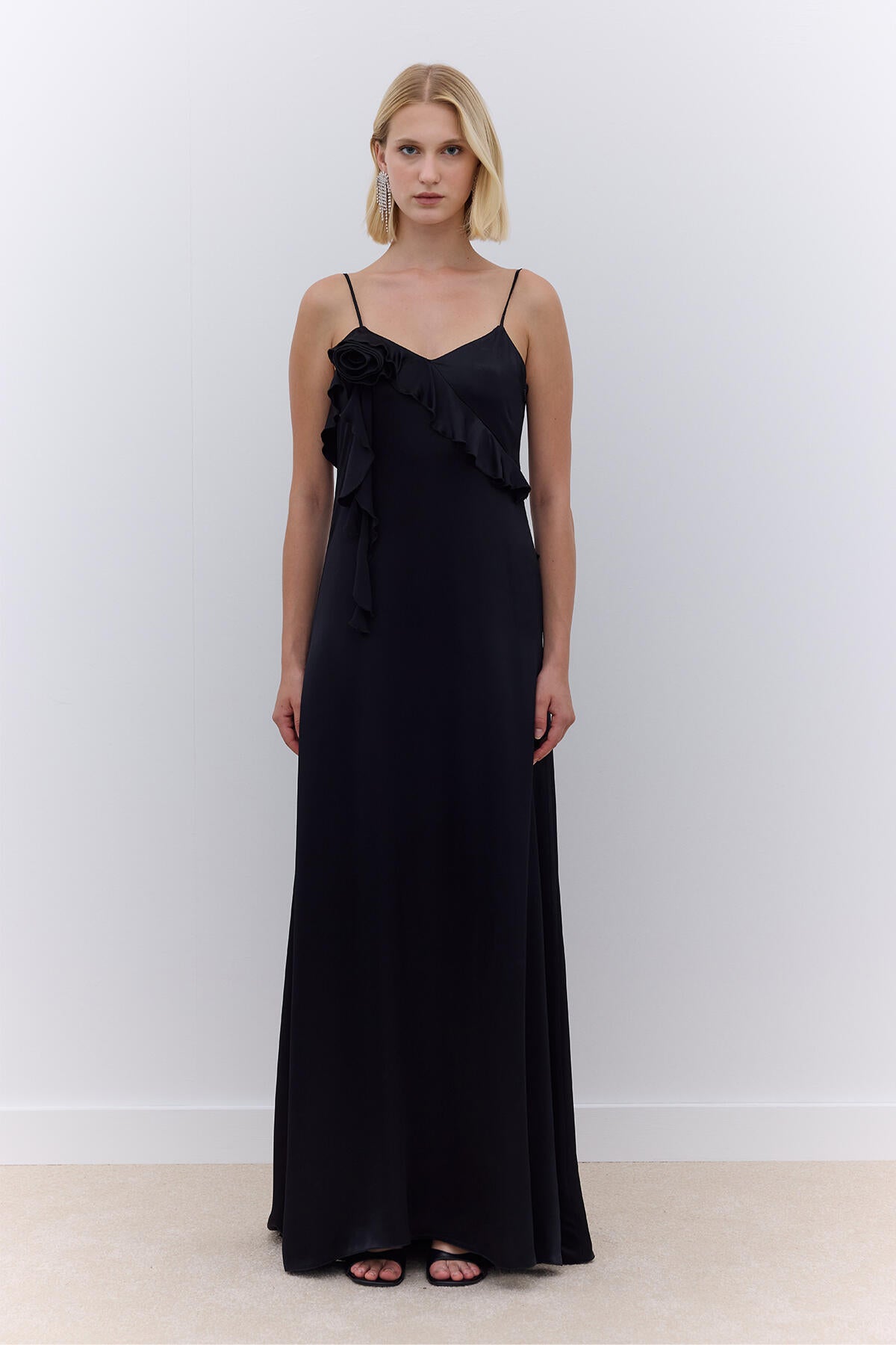 A delicate dress made from soft-textured satin fabric, featuring straps and floral details crafted from the same fabric. It has a concealed zipper closure and is fully lined.