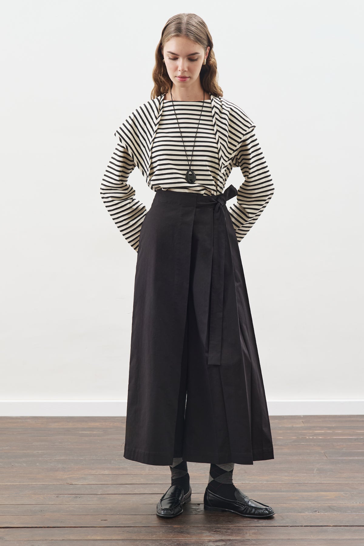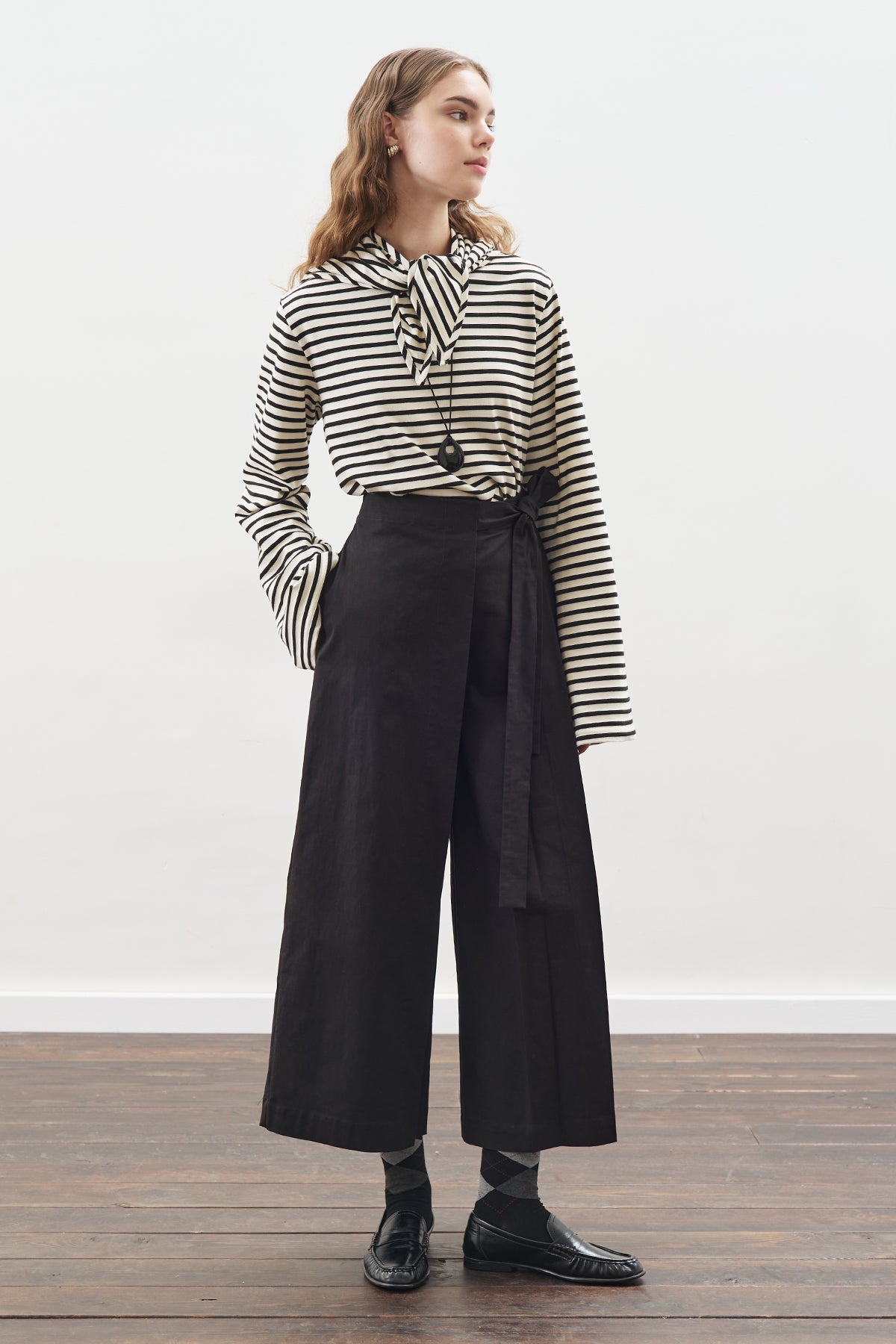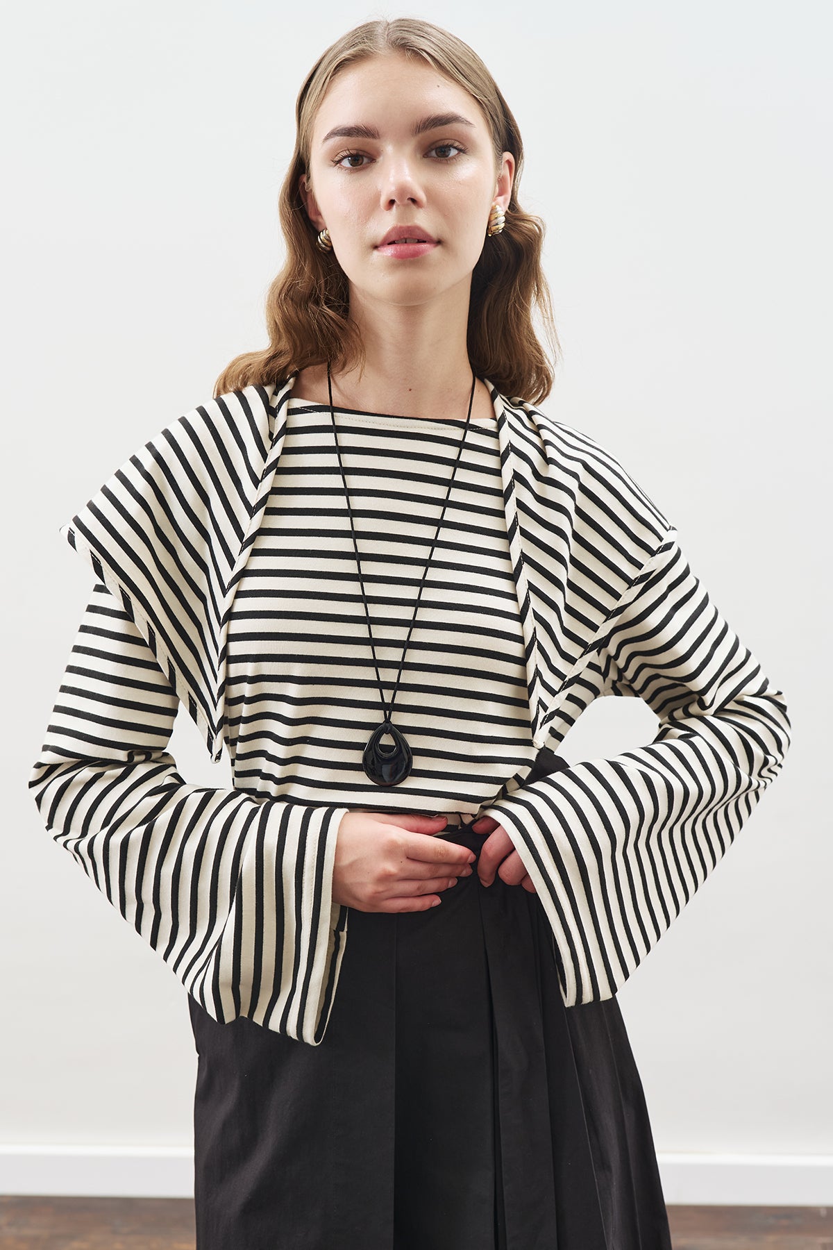 Hafif kayık yaka, uzun kol,çizgili model şal detaylı,crop boy, normal kalıp.