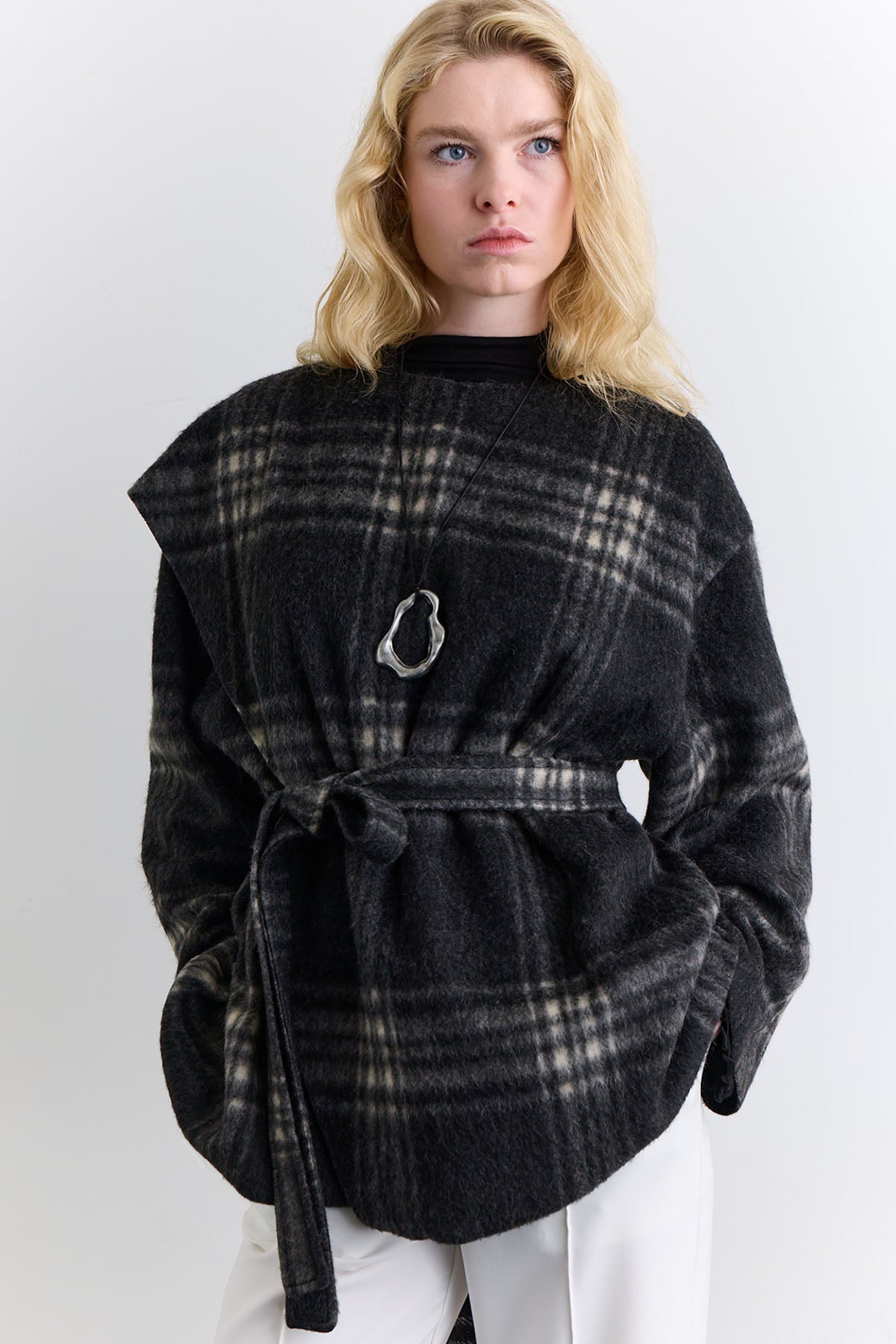Regular kalıp, yuvarlak yaka, uzun kol, şal detaylı, ara boy, düğme kapamalı.