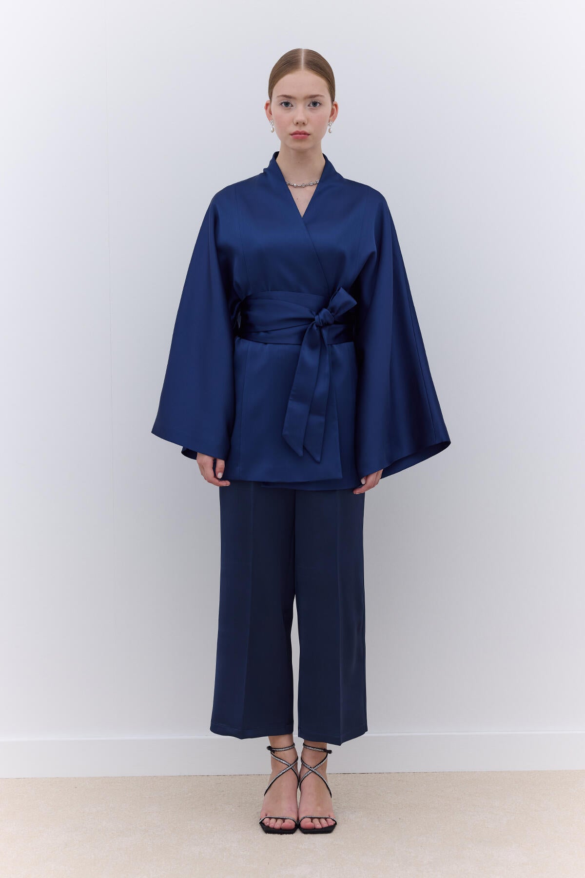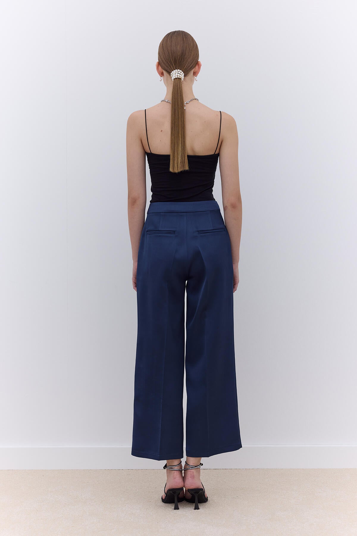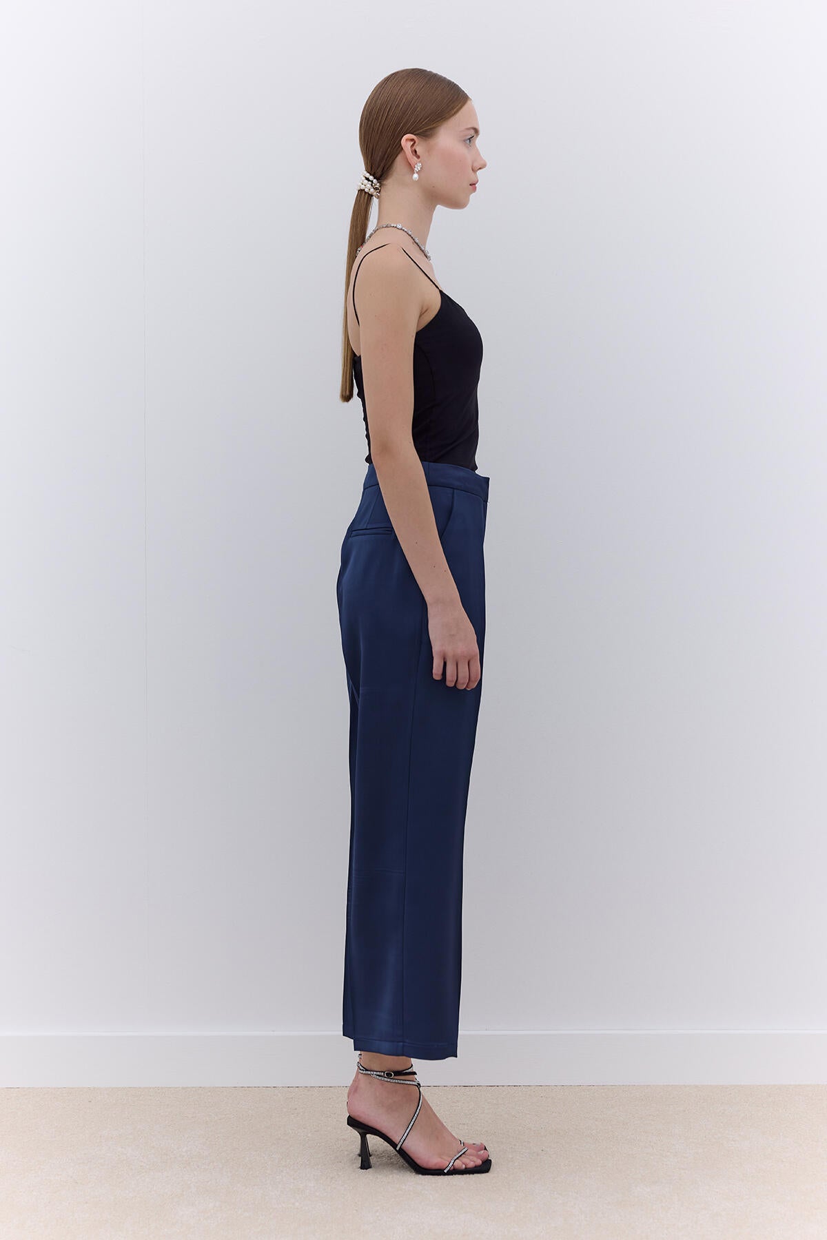 Satin Straight Leg Trousers Navy Blue
