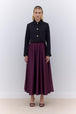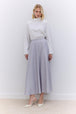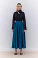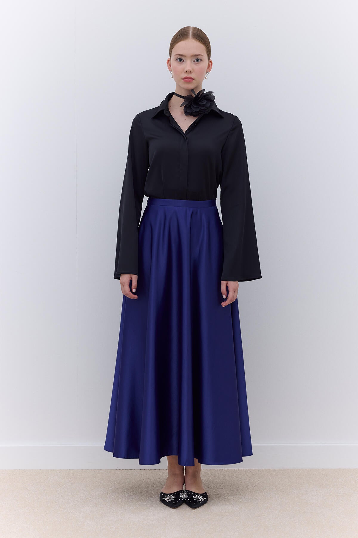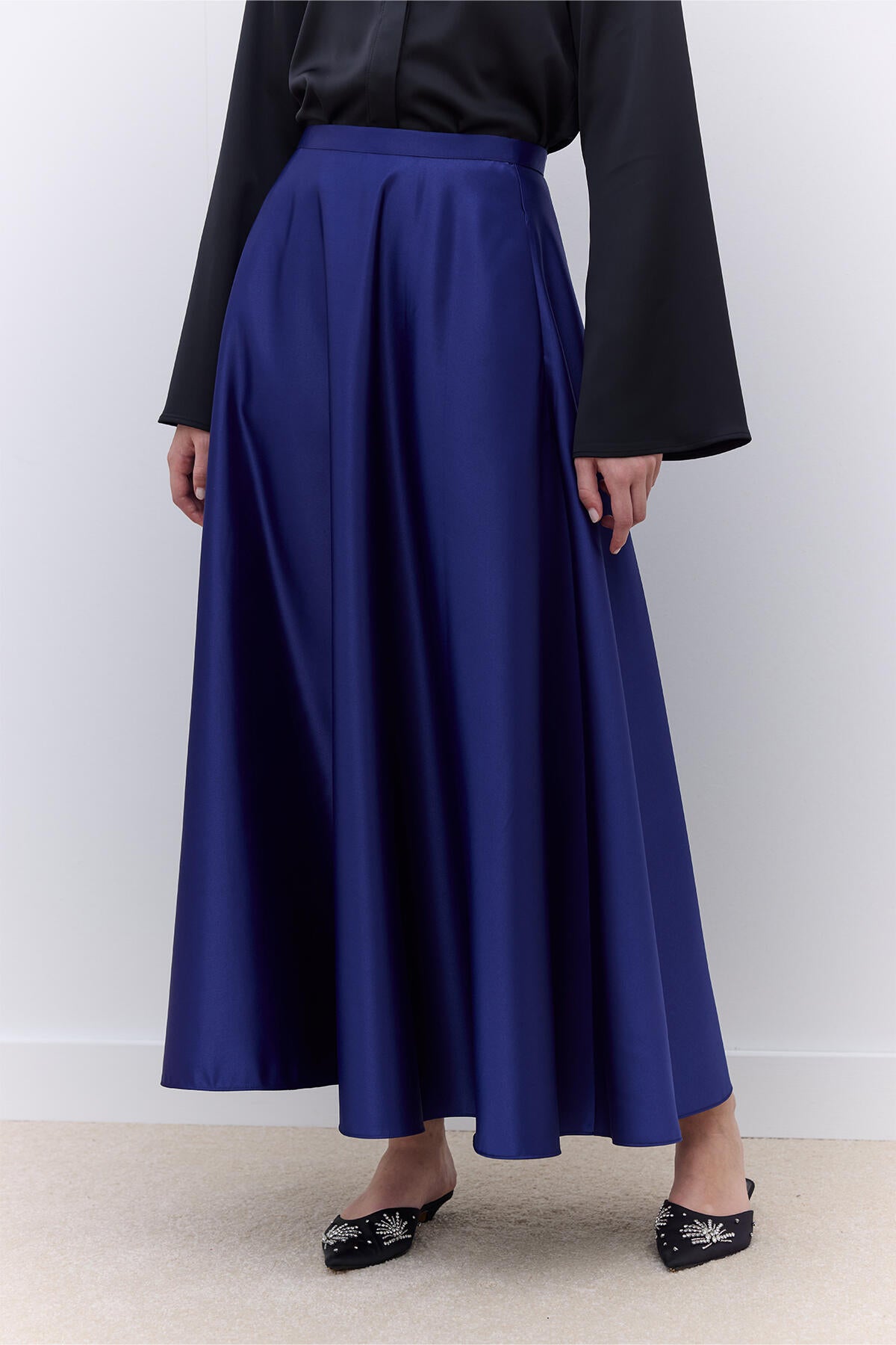 This elegant full-length skirt is crafted from luxurious satin fabric and features a wide, flared design. It includes convenient side pockets and a concealed zip closure for a sleek appearance.