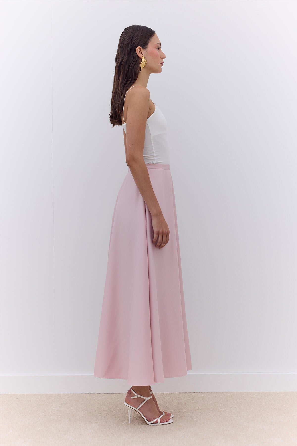 This elegant full-length skirt is crafted from luxurious satin fabric and features a wide, flared design. It includes convenient side pockets and a concealed zip closure for a sleek appearance.