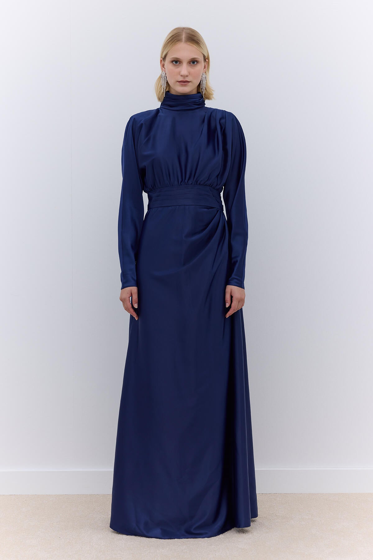 This elegant satin dress is fully lined and features a concealed zipper closure. The dress is adorned with pleated shoulder details, a high collar, and gathered waist design, enhancing its sophisticated silhouette. Padded shoulders add structure and refinement.