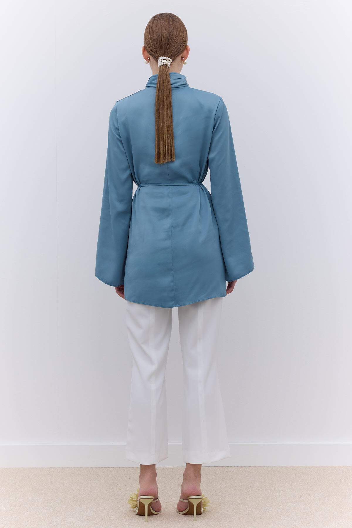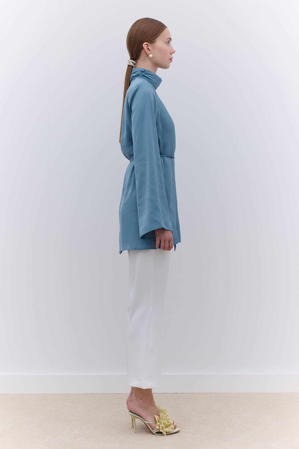 This satin tunic features a high neckline, wide sleeves, and a slim belt made from the same fabric. It has shoulder pads for added structure and is designed in a tunic length.