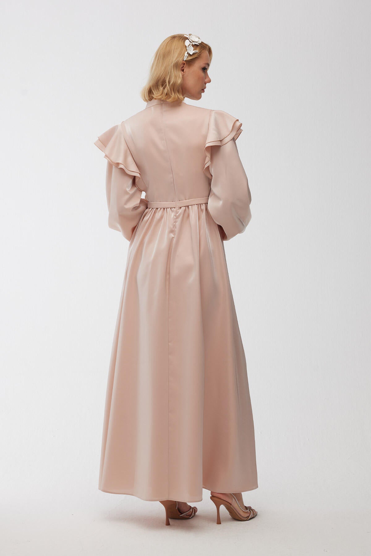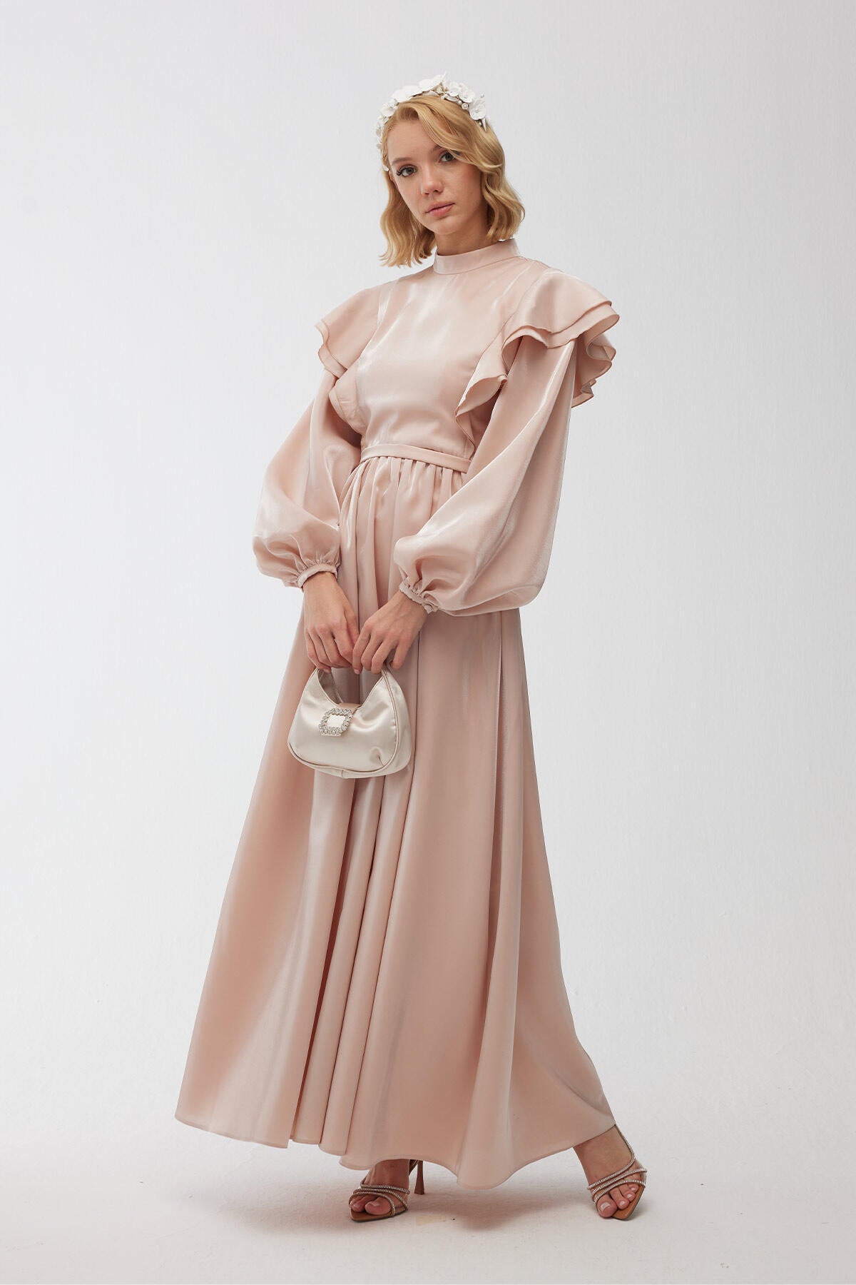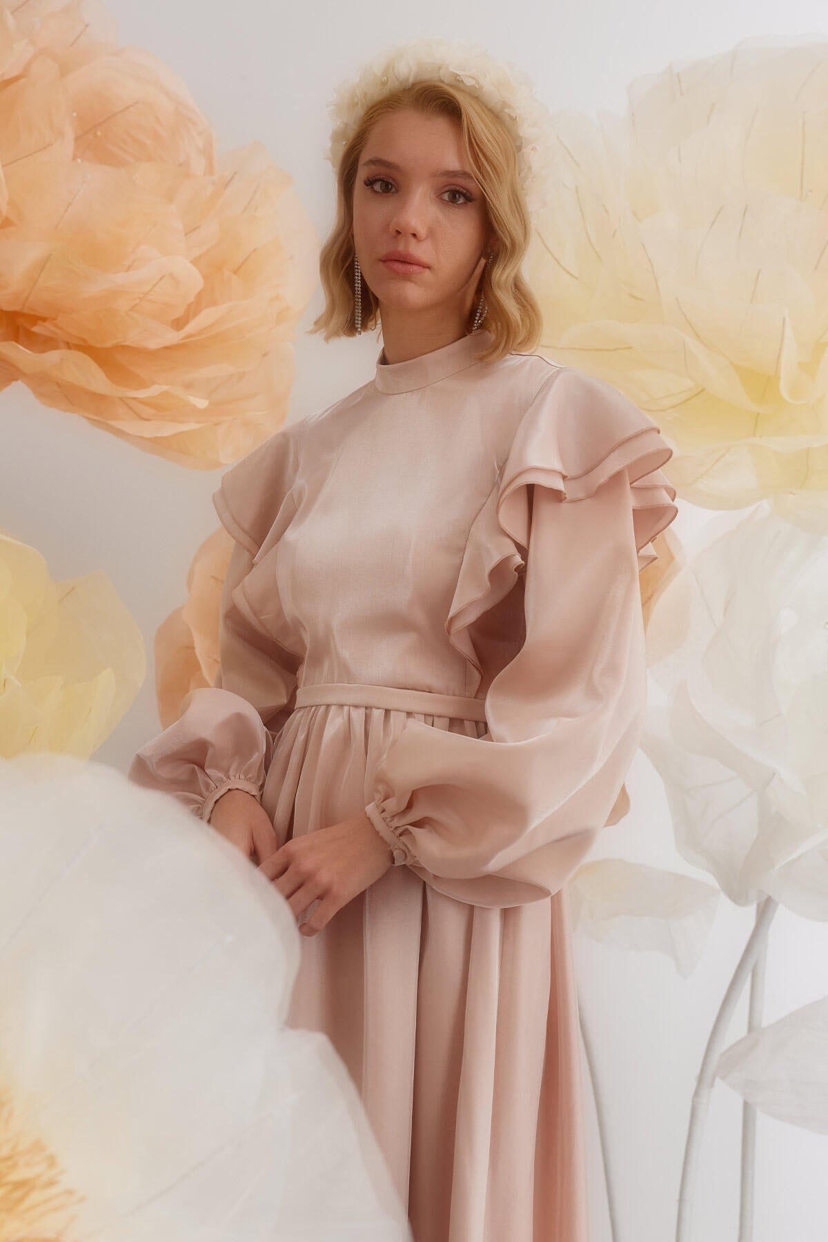 This dress features a high neckline and voluminous balloon sleeves, creating a silhouette that's both dramatic and effortlessly elegant. The shoulders are adorned with ruffle details, adding a layer of sophistication and movement to the design. Crafted from self-illuminating organza fabric, this dress captures and reflects light, ensuring you dazzle from every angle. The skirt gathers delicately, thanks to a tasteful ruching detail, enhancing the dress's overall femininity. Fully lined for comfort and modesty, it comes complete with a fixed belt, cinching the waist and providing a flattering fit.